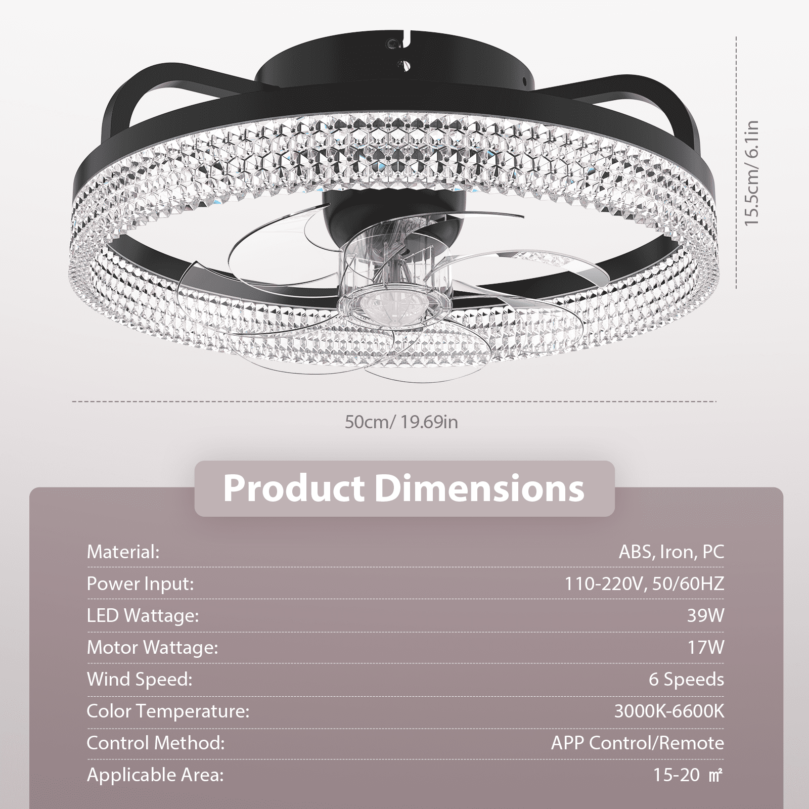 Brand: FIMEI Color: Black Material: ABS, Iron, PC Style: Modern Light fixture form: Ceiling Room Type: Kitchen, Bedroom, Patio, Dining Room, Study Rooms Power Source: AC Special Feature: 360 Degree Oscillation, Remote and APP Control, 3-Color Dimmable LED Lighting & Memory Function, Reversible & Quiet Motor & 6 Speed Options, 1-2 hours Timing Control Method: Remote Assembly Required: Yes Item Dimensions: 19.69 x 19.69 x 6.1 inches