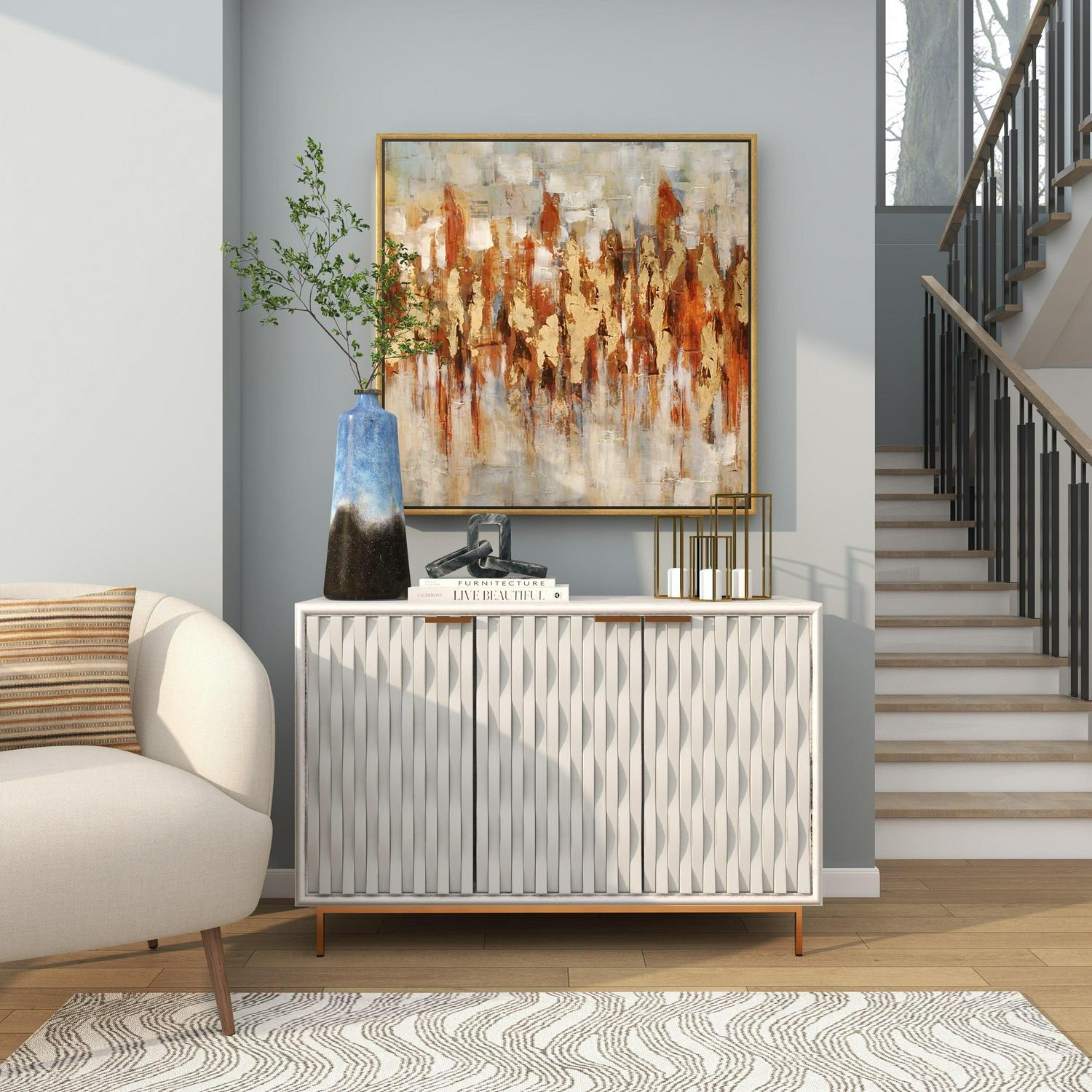 – This abstract wall decor highlights a play of gold, red, brown, white, and gray