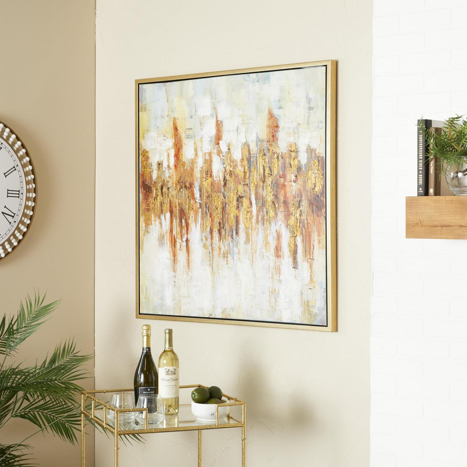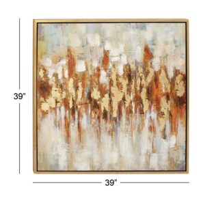 39″ x 39″ Abstract Framed Wall Art with Gold Frame, by DecMode is a unique addition to your stylish home. This wall art exude natural beauty and sophistication in both color and composition. Showcase your personality and turn your walls into an art gallery with this impressive wall art. This framed canvas art is an excellent addition to traditional and modern style homes. This item ships in 1 carton. The frame is made from Chinese fir and polystone with a light gold finish. Can be hung vertically using the sawtooths on the back; nails and screws not included. Suitable for indoor use only. This item ships fully assembled in one piece. This is a single gold colored canvas wall art. Traditional style.