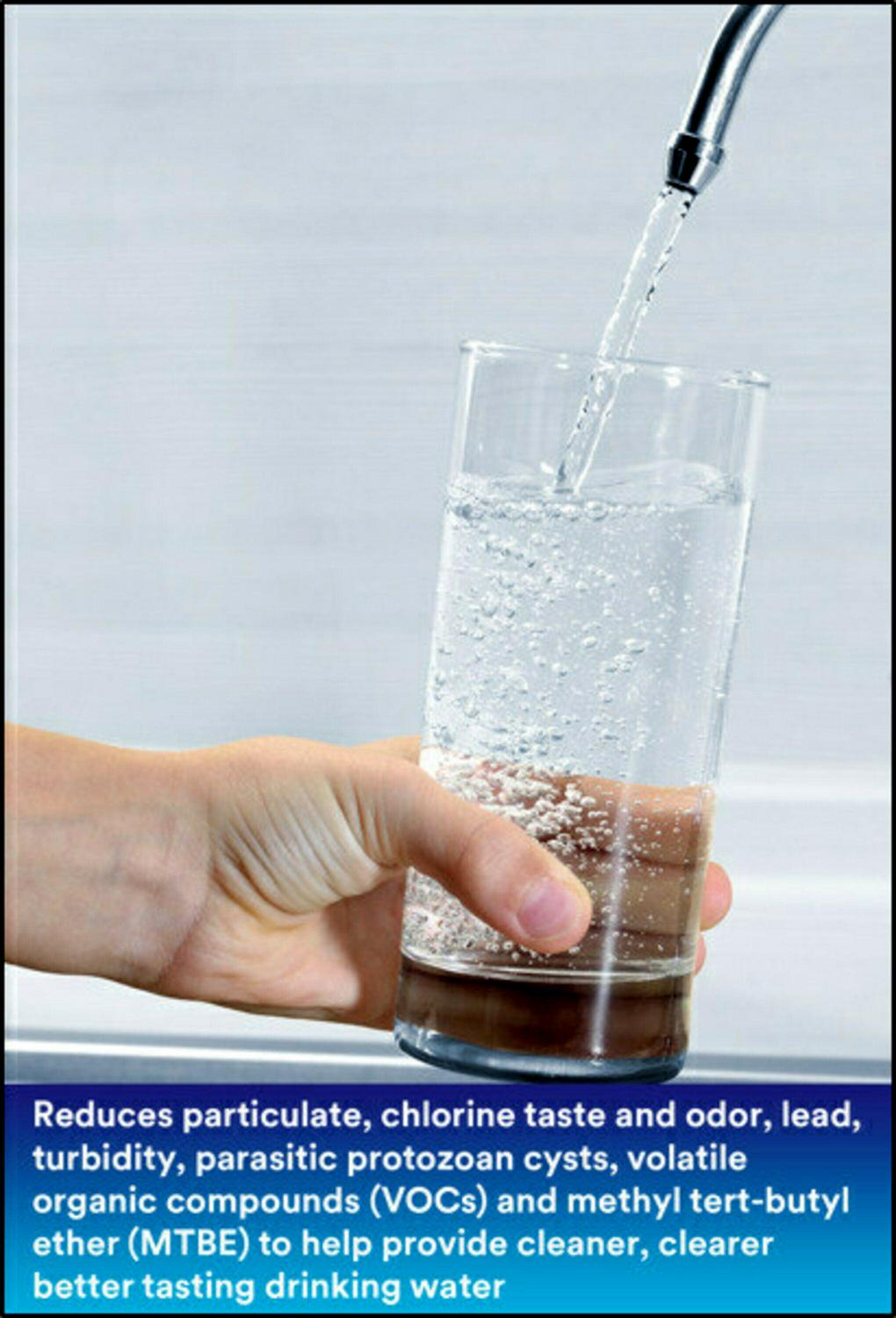 – Reduces particulate, chlorine taste and odor, lead, turbidity, parasitic protozoan cysts, volatile organic compounds (VOCs), and methyl tert-butyl ether (MTBE)