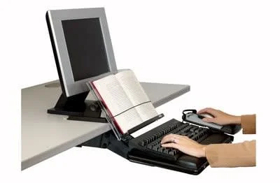 Keeps documents between monitor and keyboard to help reduce head, neck and eye movement. Skid-free base allows ledge to dip below the desk edge increasing desk space. Angle and height adjustable to suit your needs. Elastic line-guide enables easy data entry and stretches to help keep thick documents in place. 14″ Wide Backplate150-sheet capacity. Holds: Letter Legal A4 Books Catalogs Mounting: Free standing or 3M Command Adhesive Attachment System Materials: Plastic Sheet Capacity: 150.