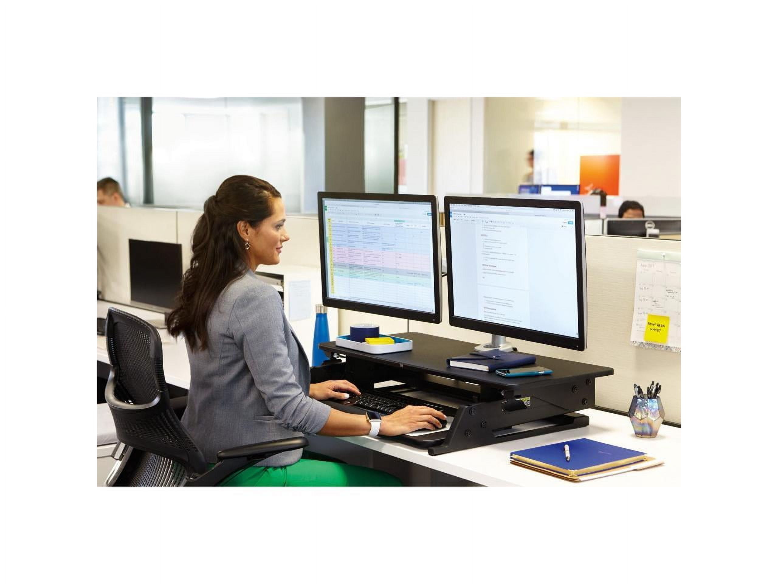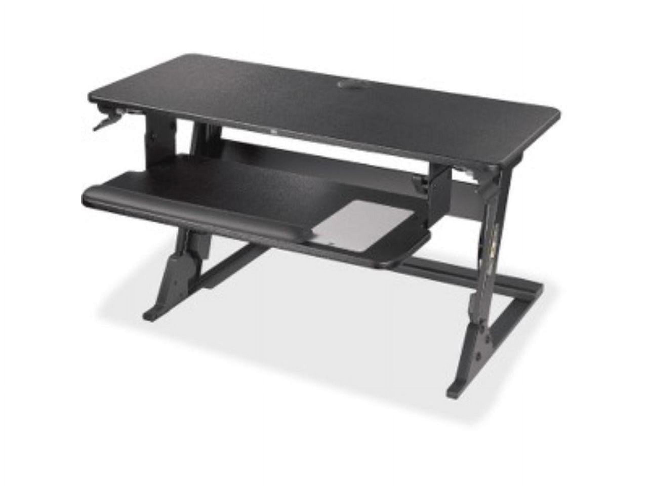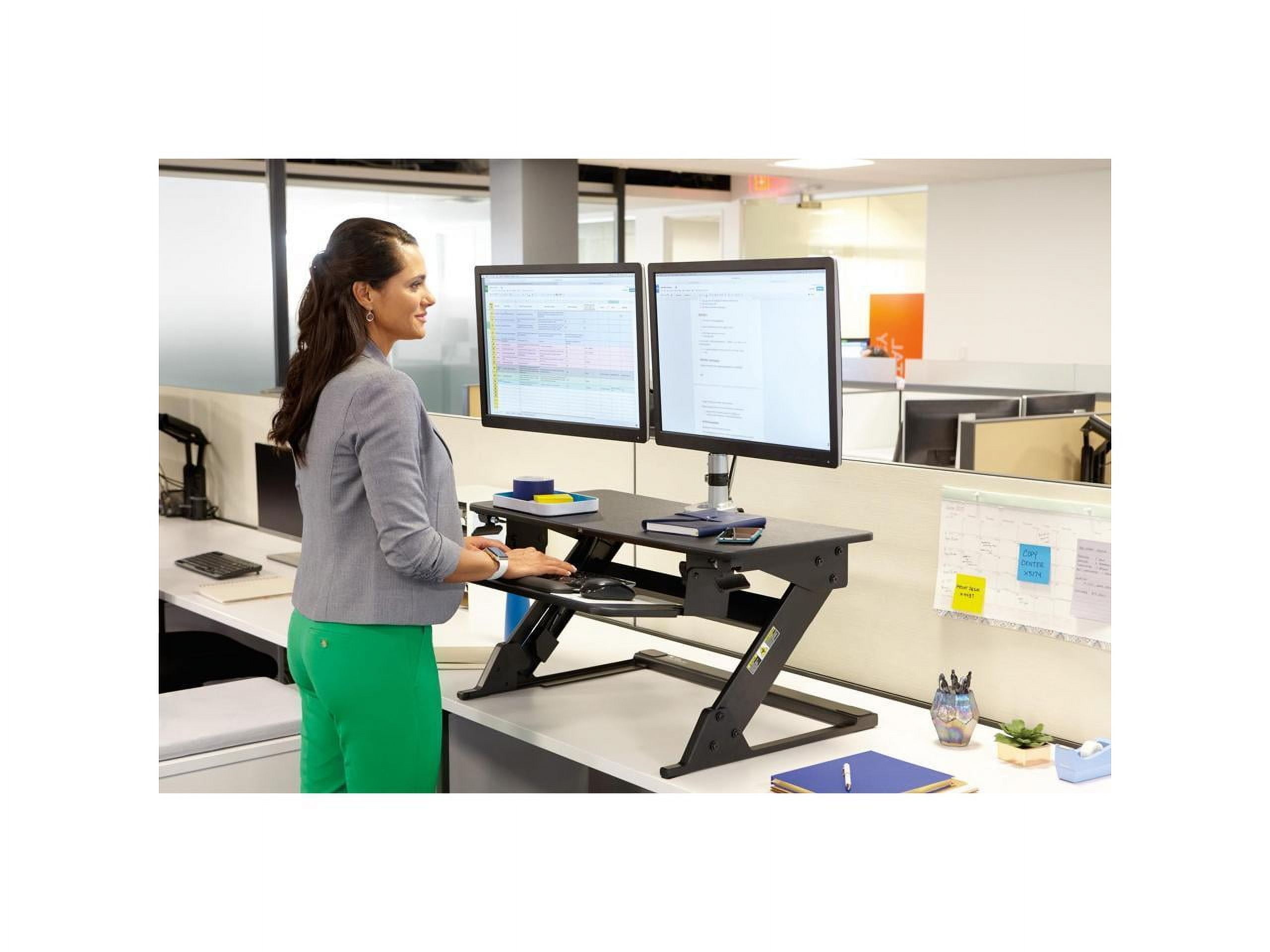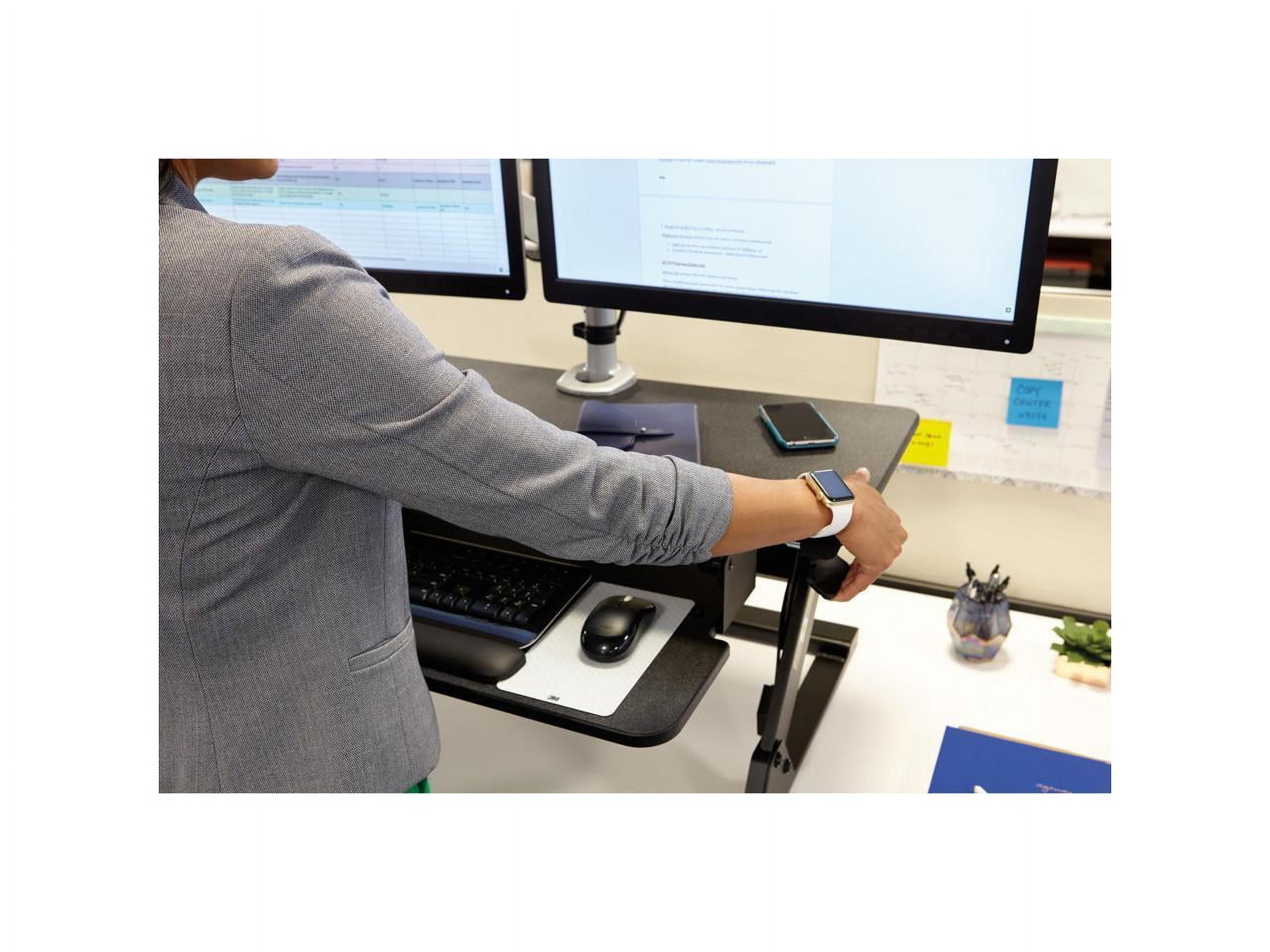 The 3M Precision Standing Desk provides maximum adjustability to achieve your most comfortable standing work position. When it comes to standing comfort, small adjustments can make a big difference! Standing desk with gel wrist rest and mouse pad. Black, MDF. Primary work surface is 35.4″” W x 23.2″” D and is large enough to fit two 24 monitors and holds up to 35 lbs. Gas assist continuous height adjustment allows you to move smoothly and quietly between sitting and standing positions in seconds. Includes 3M Gel Wrist Rest for your keyboard and 3M Precise Mouse Pad. Height adjustment range from 6.2 to 20 above the desk accommodates a wide range of users. Pre-assembled solution eliminates need for installers. +10°/-10° keyboard surface tilt to help achieve comfortable typing position. Sold as 1 Each. Side mounted levers controlling gas assist height change technology allows for continuous height settings from 6.2 to 20 above the desk surface. The keyboard surface has tilt adjustment range of 10?/+10? to help achieve most comfortable typing position. The 3M Precision Standing Desk also includes a 3M Gel Wrist Rest and Precise Mouse Pad for added comfort and productivity.