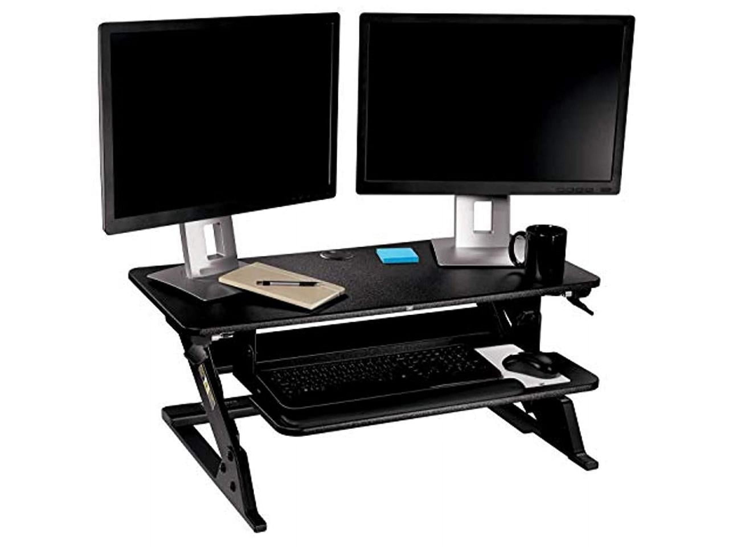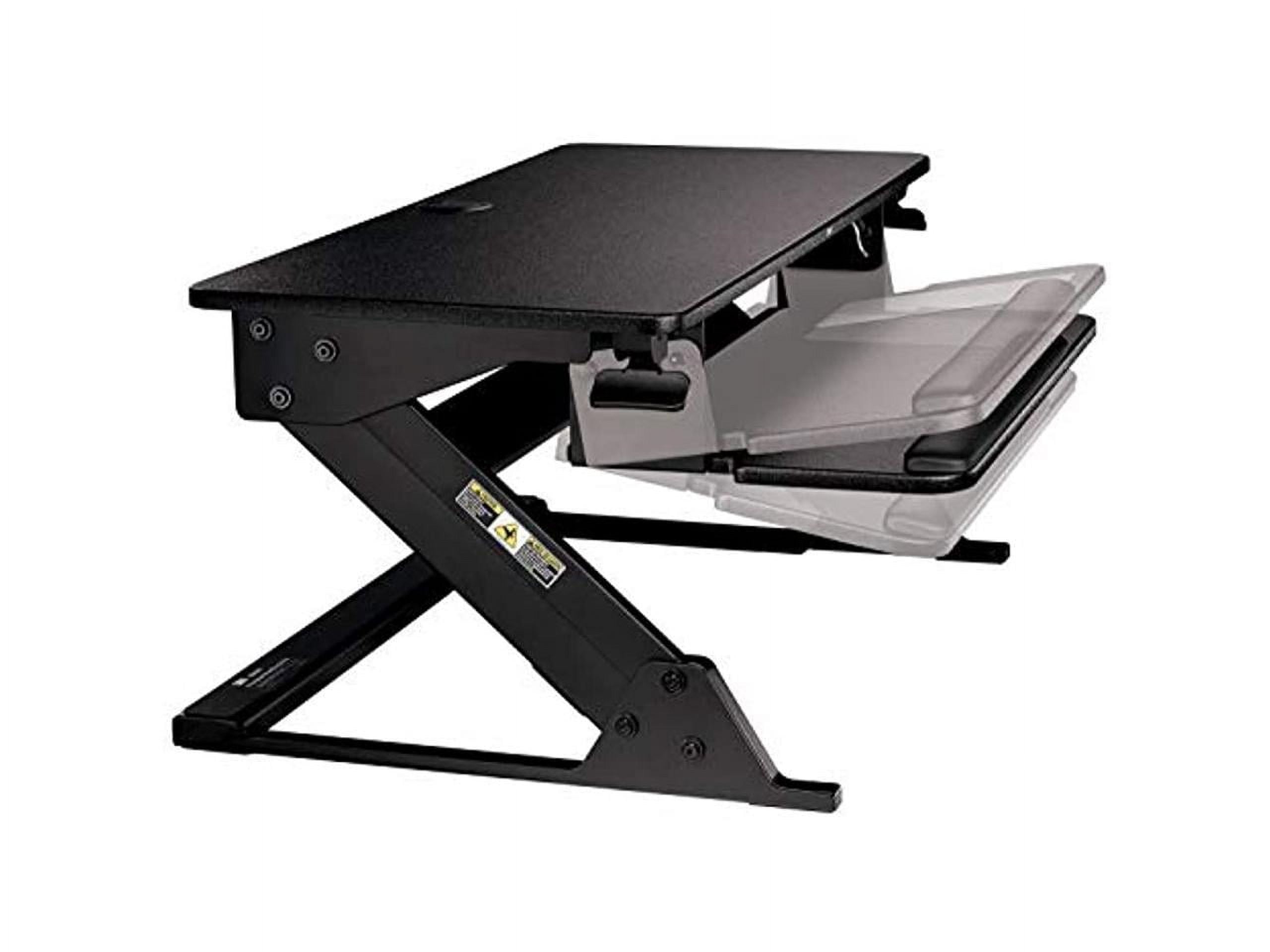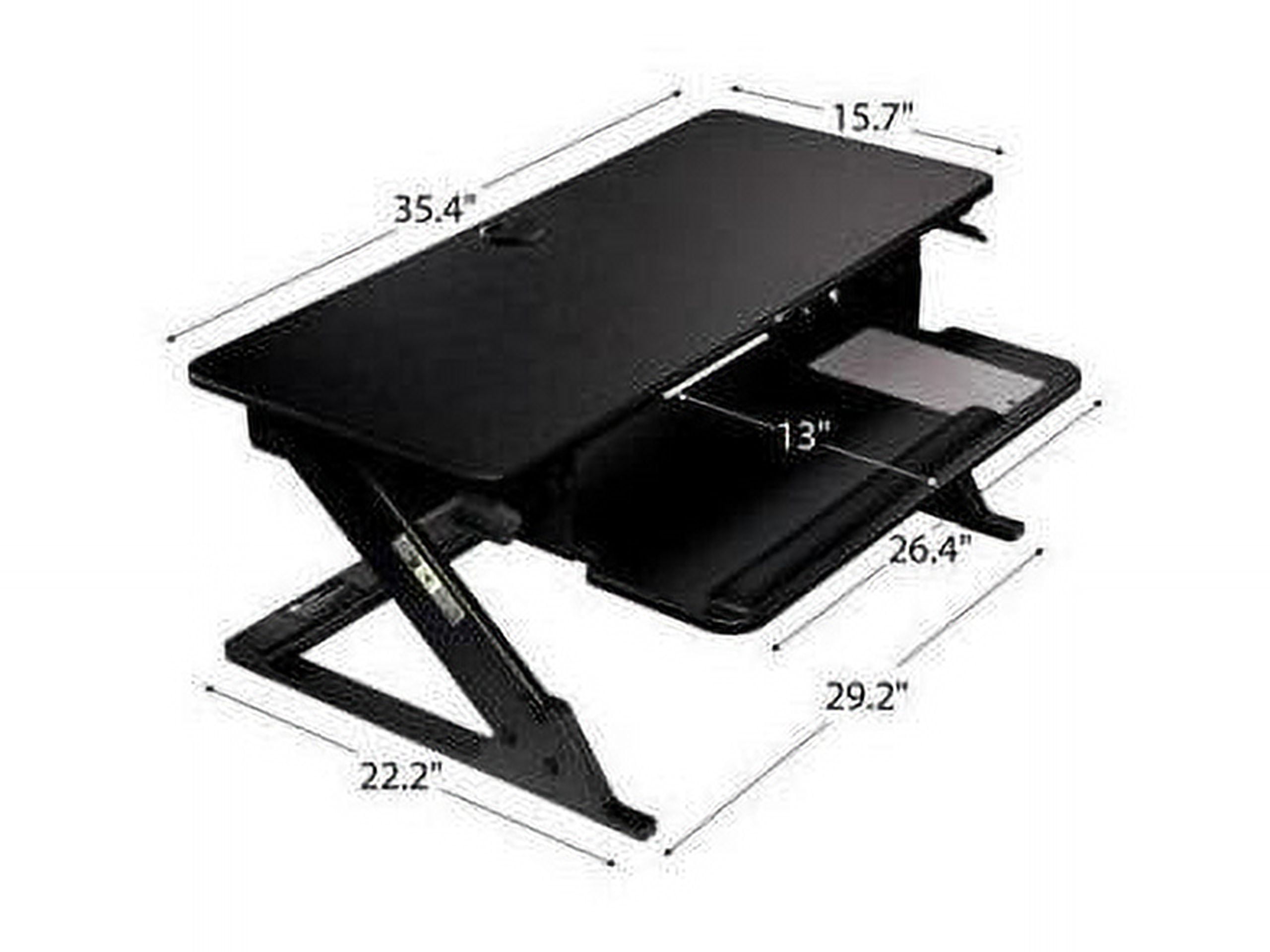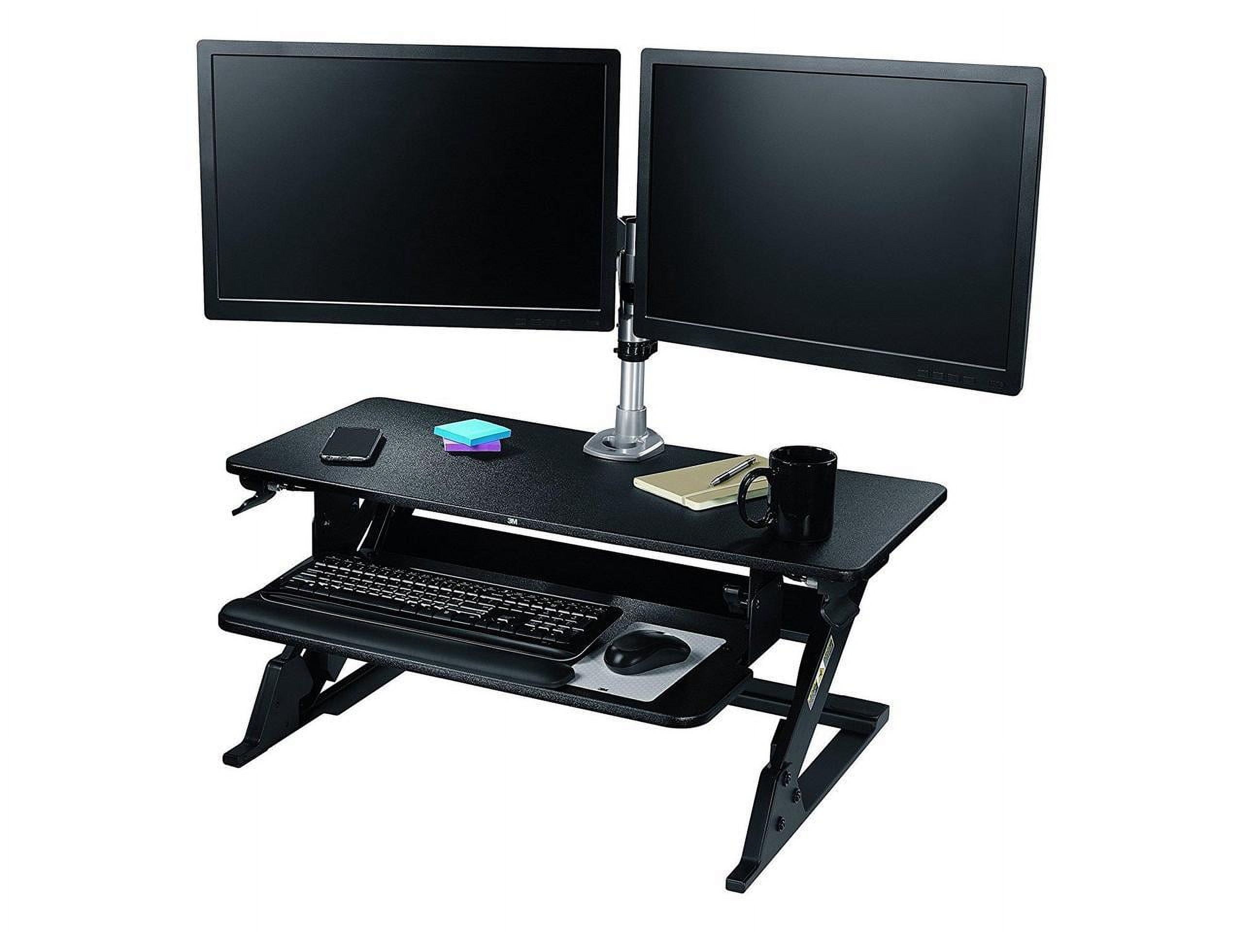 The 3M Precision Standing Desk provides maximum adjustability to achieve your most comfortable standing work position. When it comes to standing comfort, small adjustments can make a big difference! Standing desk with gel wrist rest and mouse pad. Black, MDF. Primary work surface is 35.4″” W x 23.2″” D and is large enough to fit two 24 monitors and holds up to 35 lbs. Gas assist continuous height adjustment allows you to move smoothly and quietly between sitting and standing positions in seconds. Includes 3M Gel Wrist Rest for your keyboard and 3M Precise Mouse Pad. Height adjustment range from 6.2 to 20 above the desk accommodates a wide range of users. Pre-assembled solution eliminates need for installers. +10°/-10° keyboard surface tilt to help achieve comfortable typing position. Sold as 1 Each. Side mounted levers controlling gas assist height change technology allows for continuous height settings from 6.2 to 20 above the desk surface. The keyboard surface has tilt adjustment range of 10?/+10? to help achieve most comfortable typing position. The 3M Precision Standing Desk also includes a 3M Gel Wrist Rest and Precise Mouse Pad for added comfort and productivity.