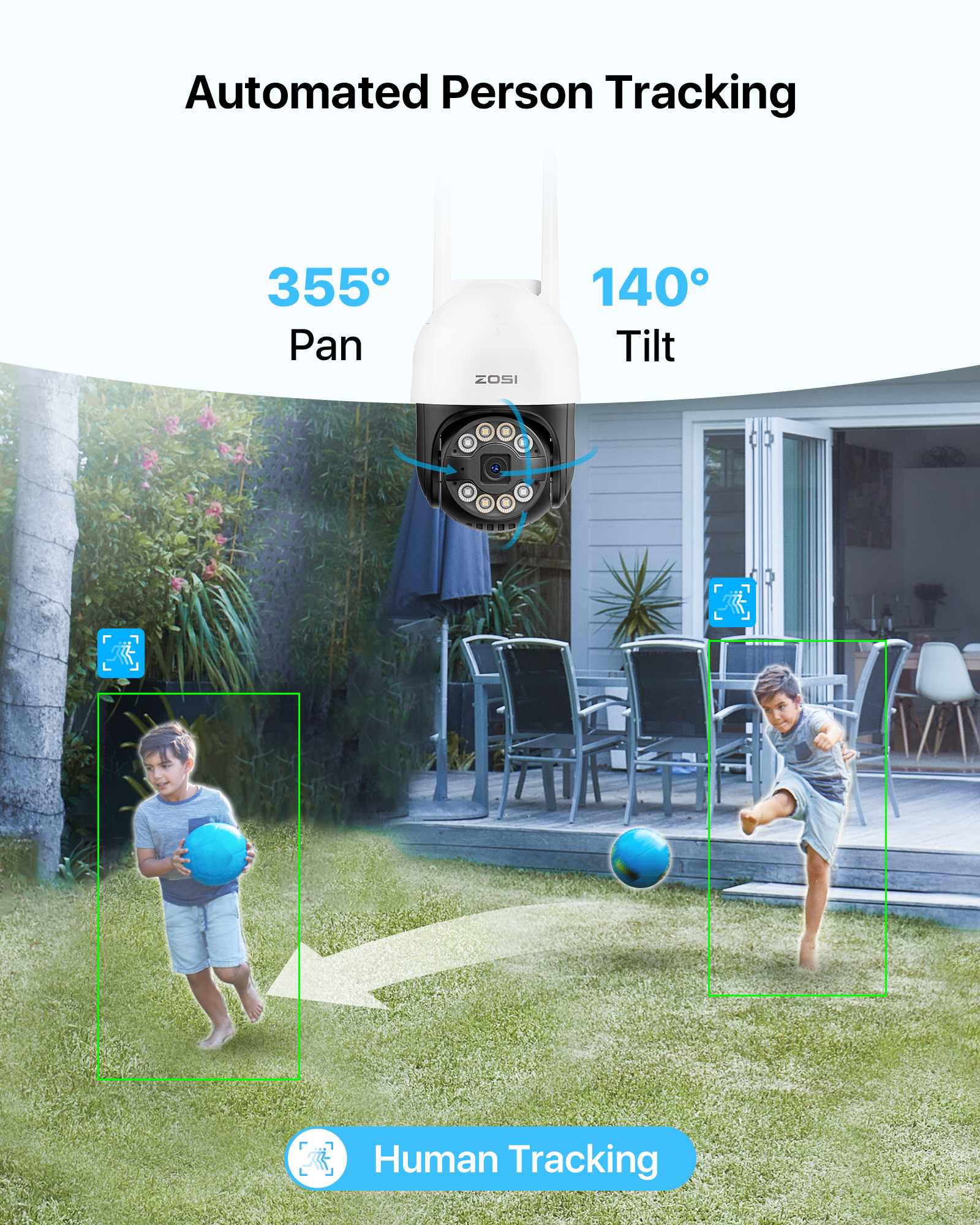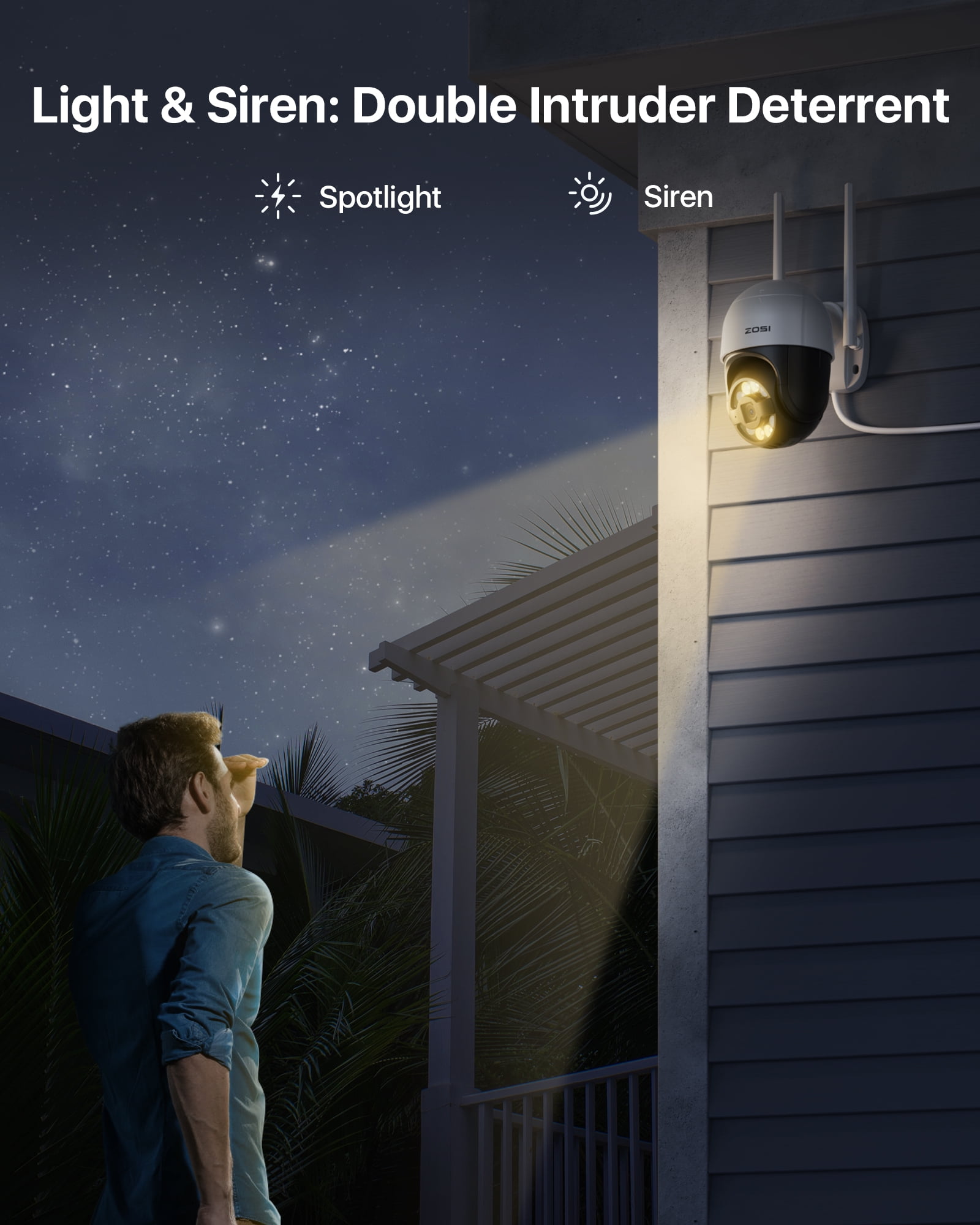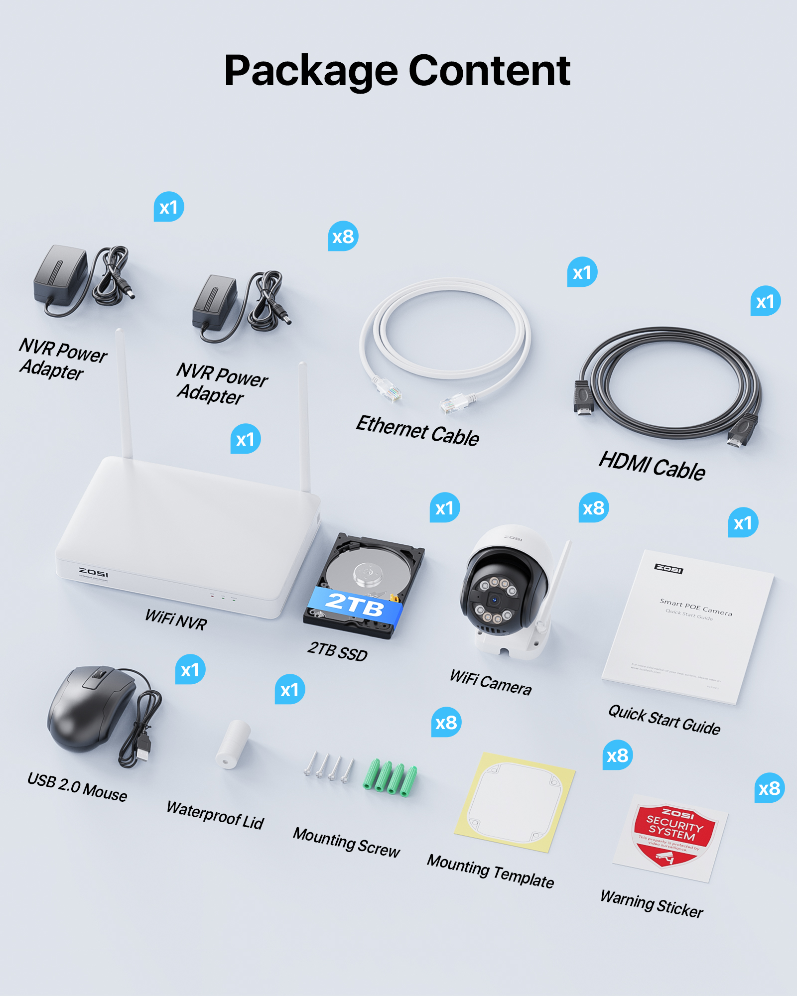 Elevate your security with this versatile camera system, designed for easy installation and packed with features to keep you protected day and night, rain or shine. Flexible Mounting: Thanks to the adjustable mounting bracket, this camera easily fits on ceilings or walls, giving you the freedom to choose the best vantage point. Real-Time Communication: Enjoy two-way audio capabilities to converse with guests or deter unwanted visitors, no matter where you are.� 24/7 Continuous Recording: With a substantial 2TB hard drive, this system supports uninterrupted recording for up to 8 cameras simultaneously. Expandable to 8TB, you’ll have ample storage. �Space-Saving Compression: H.265+ video coding efficiently reduces video file sizes by 50% compared to H.264, optimizing your hard drive space.� Remote Access & Playback: Use the ZOSI Smart App or AVSS Client to access and control your cameras from anywhere, anytime, on any device.� Human Detection: Be alerted to potential threats through a smart light alarm system triggered by human motion events or manually controlled. �Monitor Specific Areas: Customize motion zones and sensitivity to reduce false alerts, ensuring you only get notified when it truly matters. �Outstanding Night Vision: Infrared lights paired with 3D-DNR deliver remarkable detail and minimal noise at night, with night vision extending up to 100ft.� Weatherproof Durability: Built to withstand harsh weather conditions, this camera boasts an IP66 weatherproof rating and a sturdy metal exterior.� Dual Warning for Enhanced Security: Detect humans and activate spotlight and siren alerts to send potential threats packing.