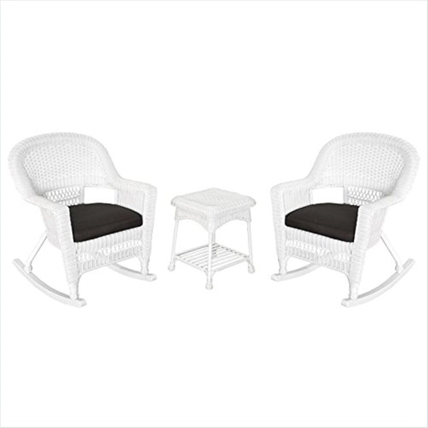 Jeco 3 Piece Rocker Wicker Chair Set With Black Cushion, White With durable, all-weather resin wicker over a powder-coated steel frame, this rocker chair is built to withstand anything life throws your way. Unlike real wicker which dries out and cracks, resin wicker is flexible and fade-resistant, which means it stays like new season after season. What’s more, all-weather wicker doesn’t absorb water and also allows for air flow, making it the perfect choice for the poolside! in addition, this rocker chair is virtually maintenance-free and cleaning it is as simple as spraying it down with your Garden hose or wiping it with a solution of mild dish soap and water. The rocker chairs even stack for easy, off-season storage. A charming blend of classic elegance and lasting function, this rocker chair is just what you need to unwind in style after a day’s work. This beautiful rocker will Outlast any simple wicker chair and sits more comfortably too.