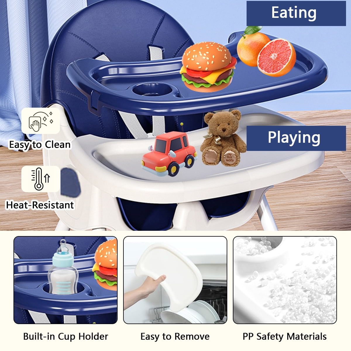SolarSoda 4 in 1 unisex baby high chairs, baby feeding chair, toddler chairs, and foldable highchair to suit every stage of your child’s growth. Keep your baby safe and comfortable with the 5-point harness. Our high chair includes a double tray that also locks, so you only need to remove the upper deck for cleaning after your baby has eaten, and the lower deck also provides baby play space for your handy toys. The 3-level adjustable positions of tray provide more space and flexibility for fast-growing children. Universal silent wheels with brakes, easy to move or stop anywhere without scratching the floor. Easy-to-clean seat with wipeable EVA foam and machine washable seat cushion. Highchair for baby is made of thickened heavy duty stainless steel for durability, shock absorption and load bearing. Its seat is made of PP material that helps to provide fatigue resistance and provide maximum comfort.