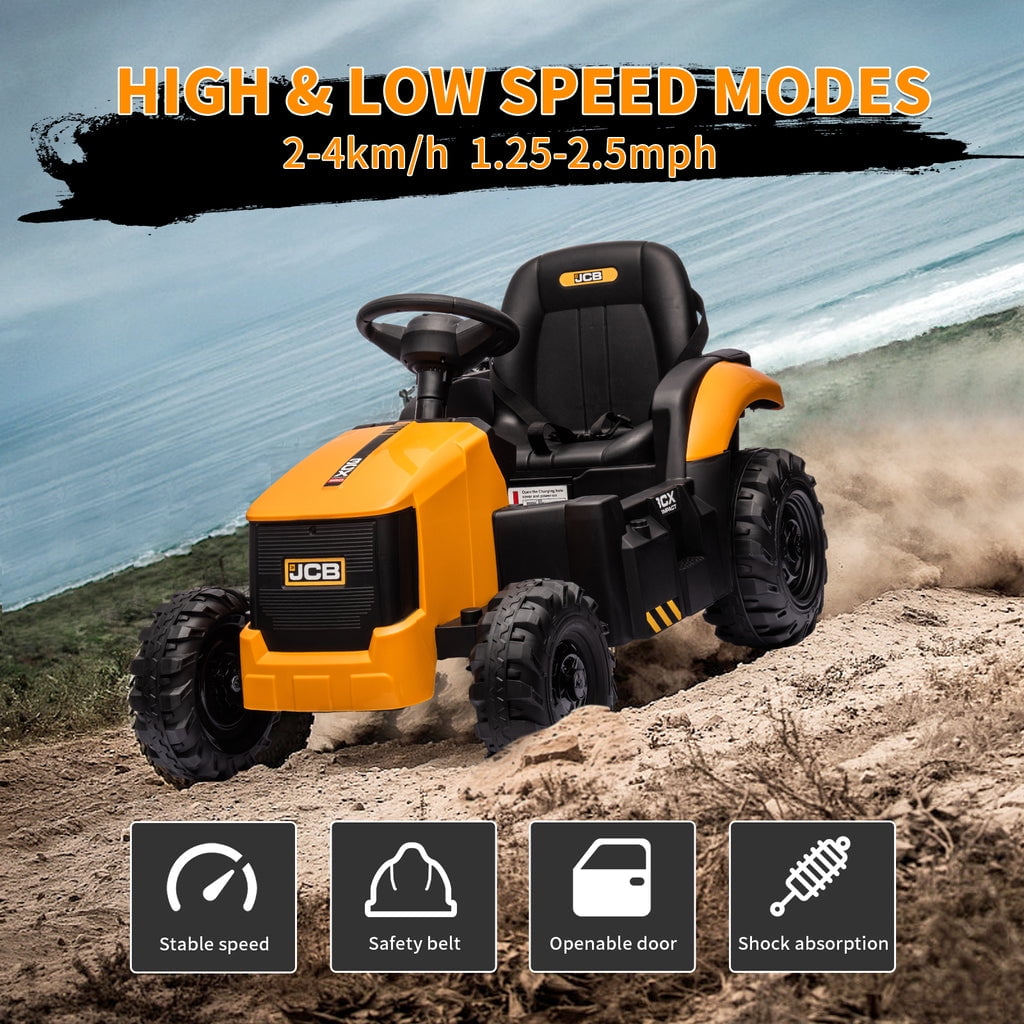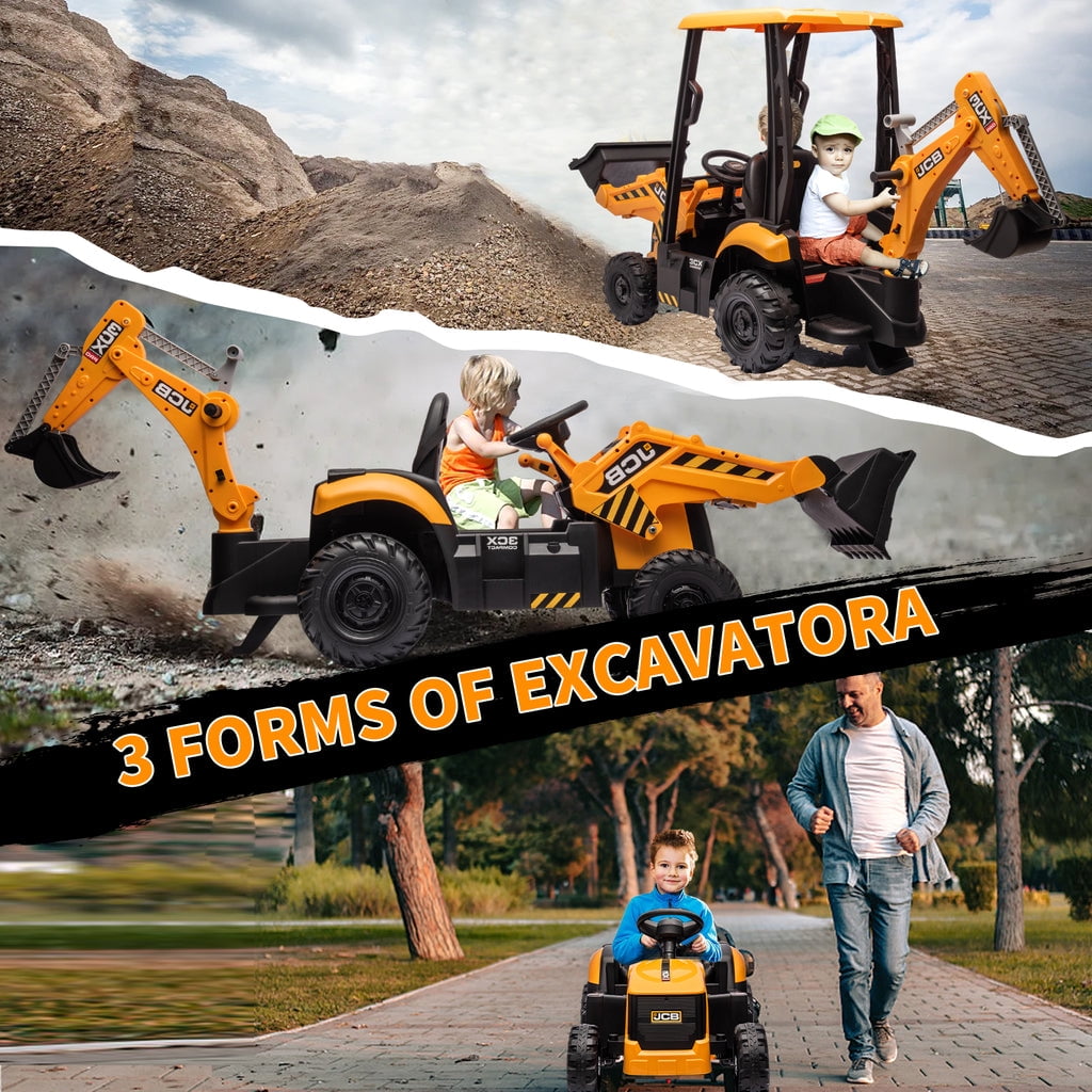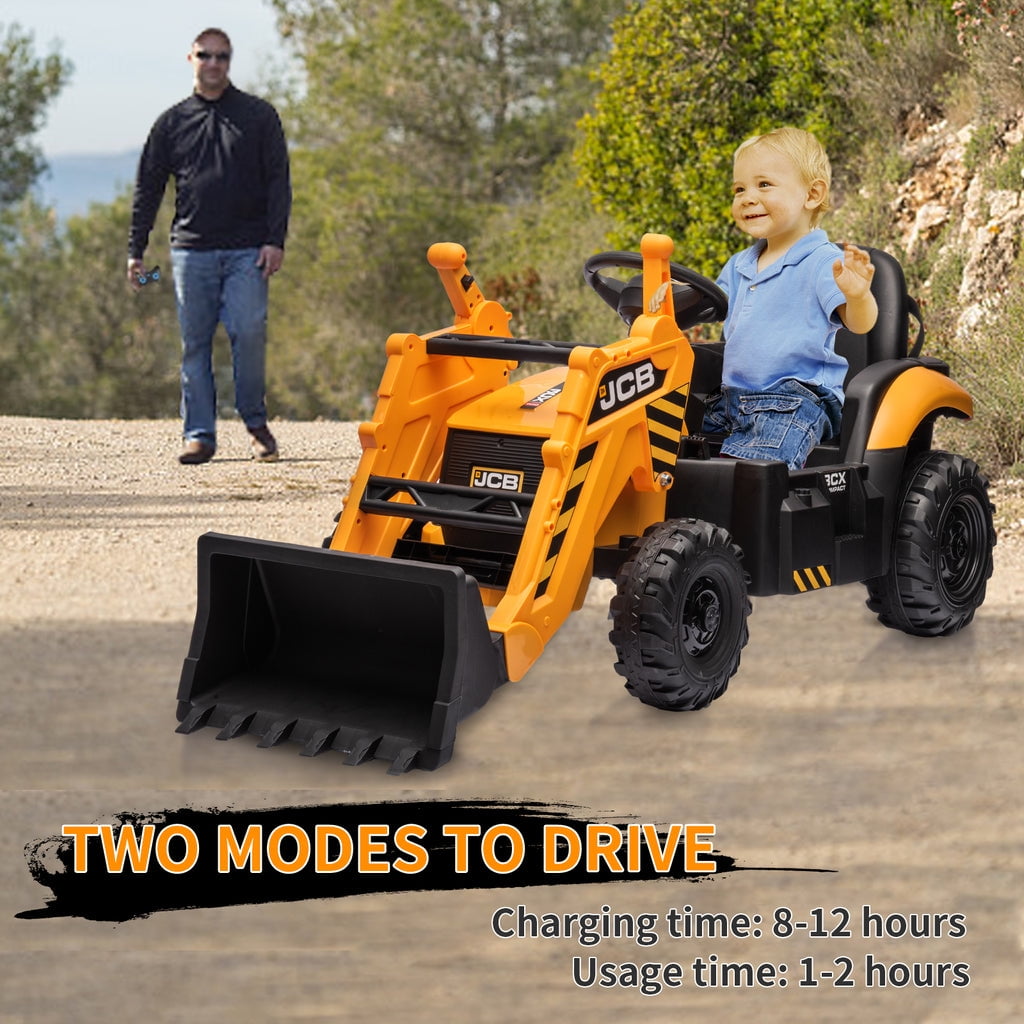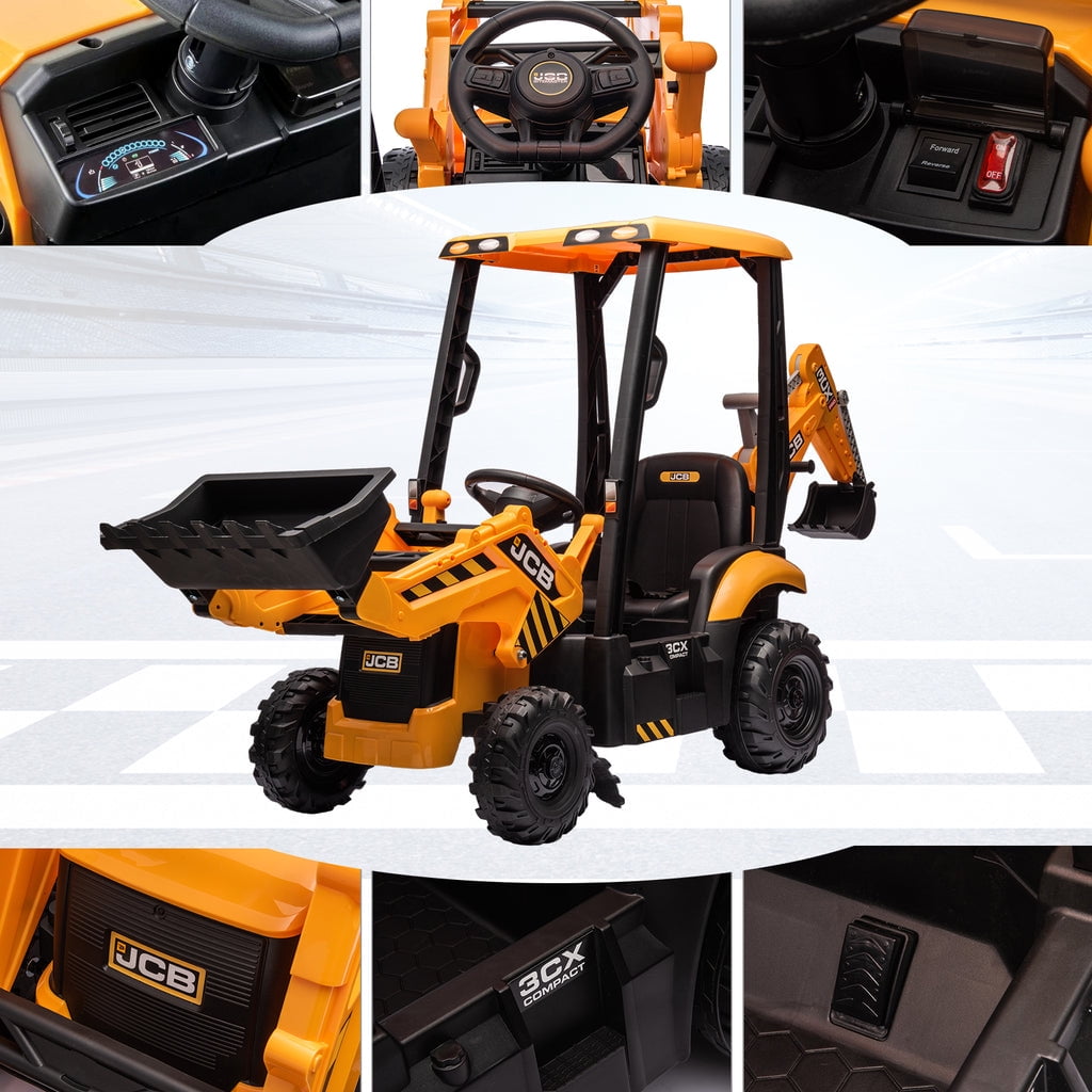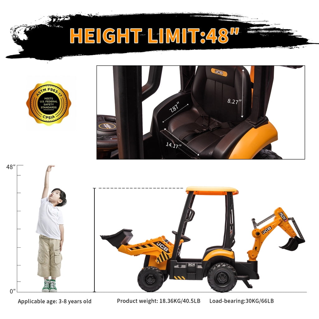 KEENSTONE 12V kids ride-on construction car licensed JCB equipped with a front loader, kids can control the bucket to move up/down, shovel and dump freely through the handle. Changing the direction of the seat can be used as an excavator, and kids can easily operate the handle to make the digging bucket move, dig and dump freely. Through this 2-in-1 car, kids can clean the garden with their parents and also improve their operational and coordination abilities. 🚜【2 in 1 Excavator & Bulldozer】 KEENSTONE 12V kids ride-on construction car licensed JCB equipped with a front loader, kids can control the bucket to move up/down, shovel and dump freely through the handle. Changing the direction of the seat can be used as an excavator, and kids can easily operate the handle to make the digging bucket move, dig and dump freely. Through this 2-in-1 car, kids can clean the garden with their parents and also improve their operational and coordination abilities. 🎮【 Dual Driving Modes 】 The kids electric excavator supports dual driving modes: Parental remote control & Kids manual operation. The electric car can be operated through a 2.4G remote control. If the kid is too young, parents can use the highly sensitive remote control to adjust speed and direction to ensure safety and also enjoy playing with the kid. In addition, children can drive independently through the steering wheel and pedal for a realistic excavator driving experience. 🎁【12V Powerful Motors】 This kids ride-on excavator is equipped with 12V engine and dual rear motors power configuration. Its powerful rear motors and wear-resistant wheels can support a variety of terrain. The quality materials provide a durable construction and provide the kid with a strong weight capacity of 66 lbs for reliable use. 👧👦【Safe Performance & Realistic Design 】 This 12V kids ride on toys is equipped with a ceiling that is not only more realistic but also provides additional protection for children, and the ceiling is detachable, providing a dual driving experience for kids. The spring suspension system to ensure a smooth and comfortable ride. Reinforced three-point seat belts ensure maximum safety for your little one. 🔋【Rechargeable Battery】 The package includes a 12V rechargeable battery and two motors, which can be fully charged within 8-12 hours, providing your child with 1-2 hours of playing time. Watch your kids immerse themselves in endless fun. A ride-on car makes an exciting surprise gift for children ages 3-7. Specification Color: Yellow Dimensions: 76*23.82*38.58in Volts: 12V Speed: Maximum 4 Km/h Weight Capacity: Maximum 110 lbs Recommended Age: 3-7 Years Number of Seats: 1 seat Charging Time: About 8-12 h Use Time: About 1-2 h Remote Control: 2.4Ghz, Need 2*1.5V AAA (Not incl.) Remote Control Range: 80-160inch Steering Wheel: Need 2*1.5V AA (Not incl.) Note!!! 1. Children under the age of 6 should drive under the supervision of their parents 2. Due to manual measurement, please allow 1-3cm error 3. Due to display reasons, please allow errors in the actual color and picture