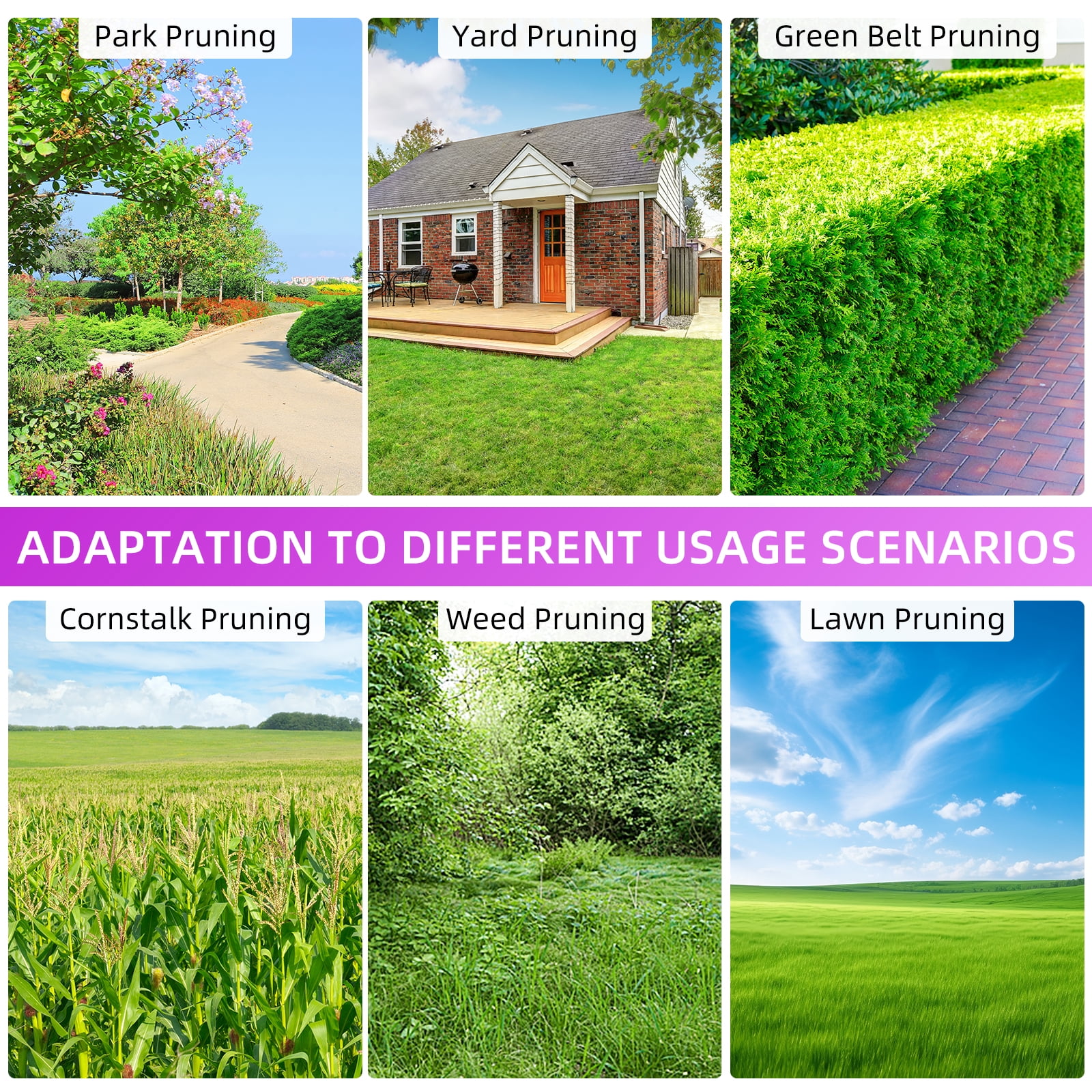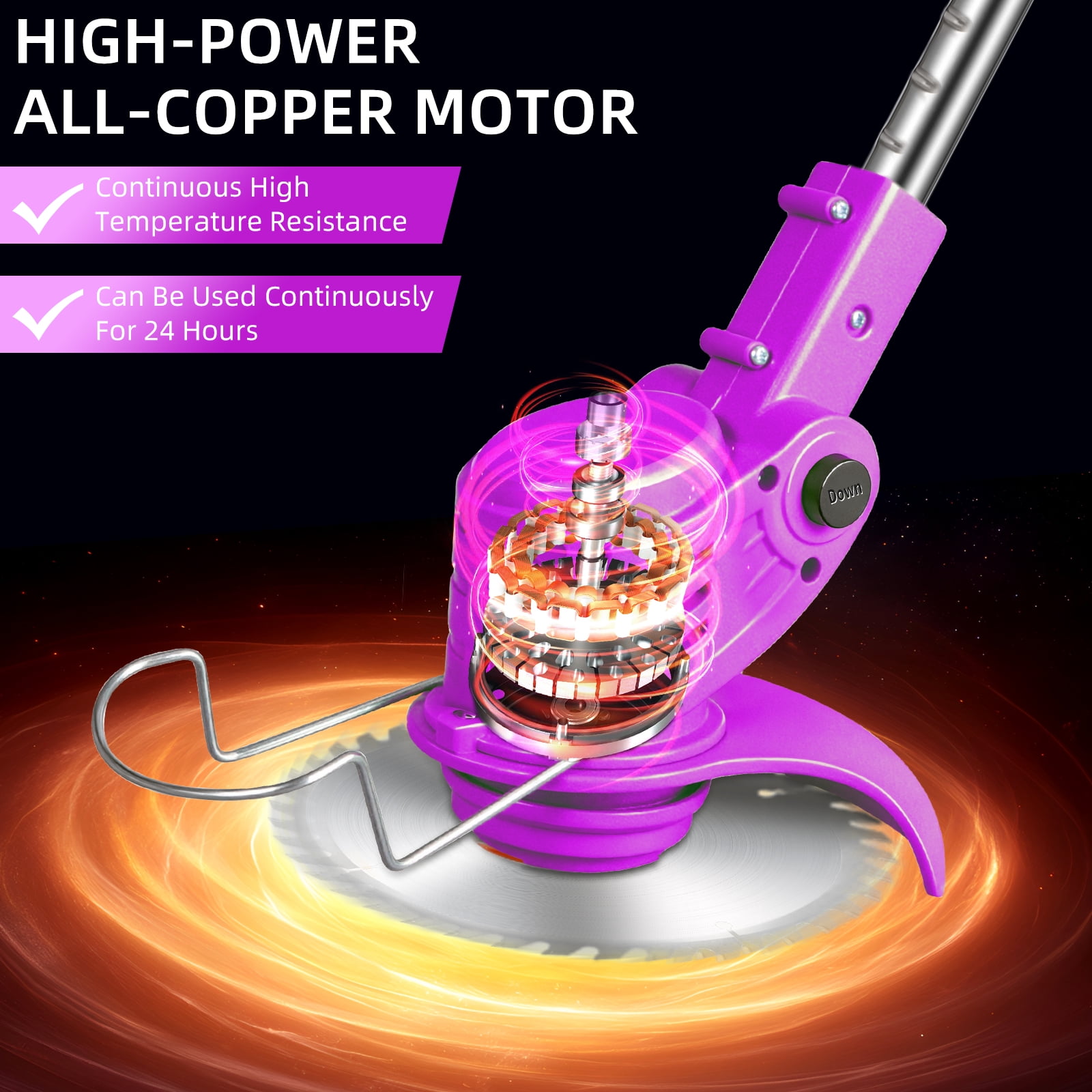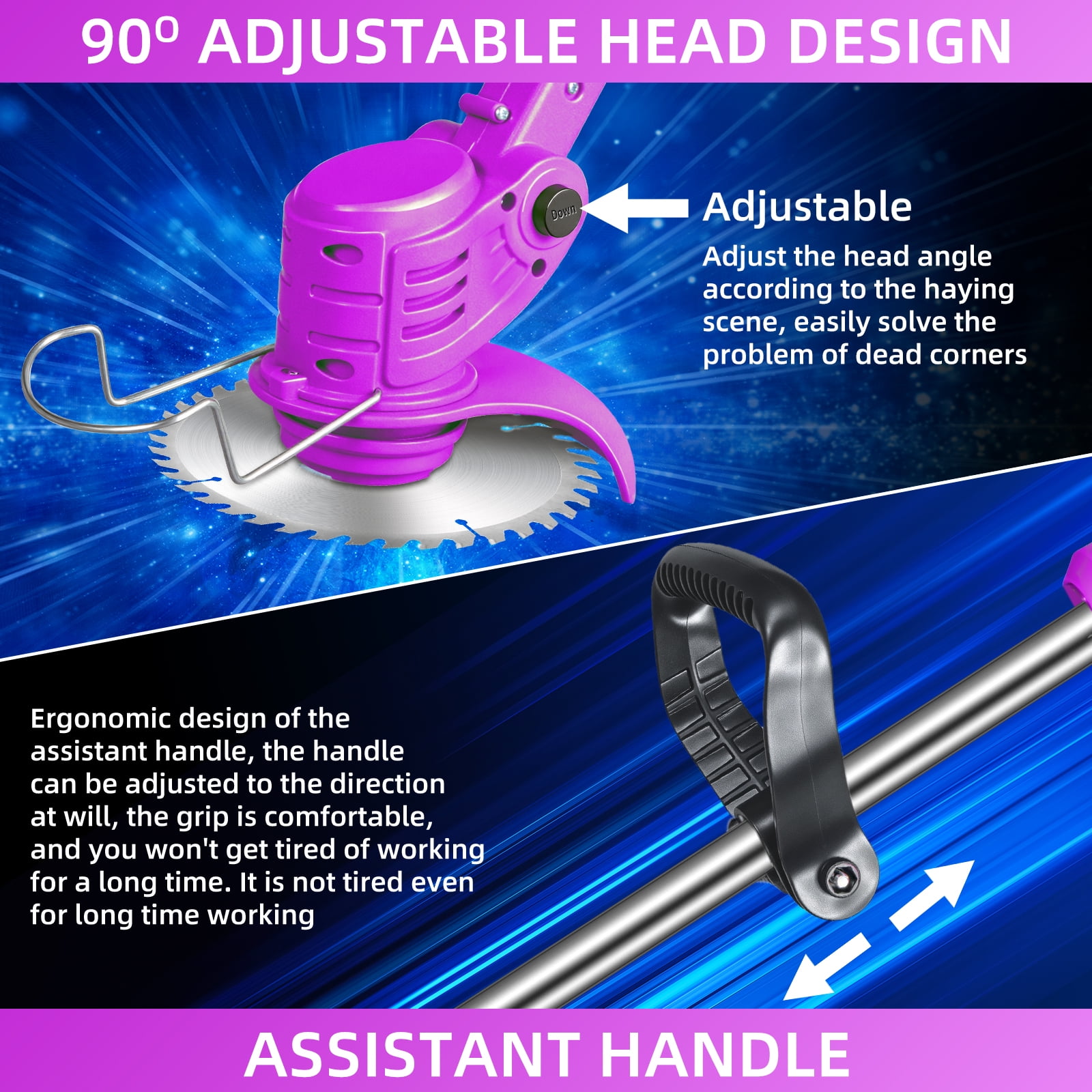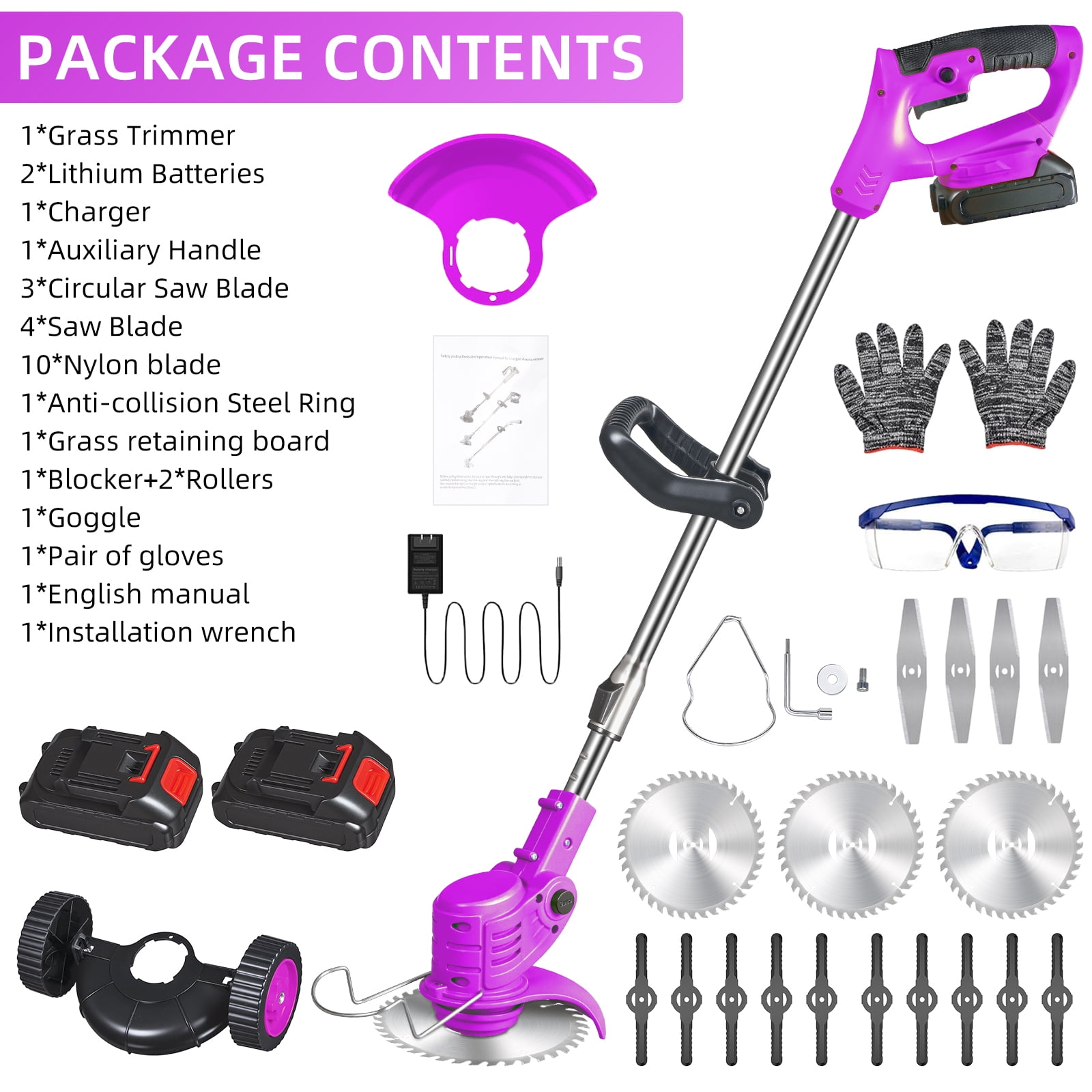 🌿【Multi-function Grass Trimmer】: 4-in-1 Grass Trimmer/wheel edger /Mini-Mower / Brush cutter. 🌿【Super long battery life】: Comes with 2x21V 4.0Ah batteries, You don’t have to worry about battery life at any time, two 4.0A batteries can meet all your daily cleaning needs. 🌿【With trimming auxiliary wheels】:Just rotate the machine head, Install mowing lines Turn into wheel edger in seconds, Support and guide the edger, giving you straighter lines and cleaner cuts. 🌿【With auxiliary grass pushing bracket】:Install the auxiliary grass pushing bracket and the metal curved blade to create a Mini-Mower, which can easily handle large-area lawn mowing. 🌿【manganese steel circular saw blade】:strong cutting ability, suitable for cutting thick shrub branches,Complete its pruning work like a Brush cutter.