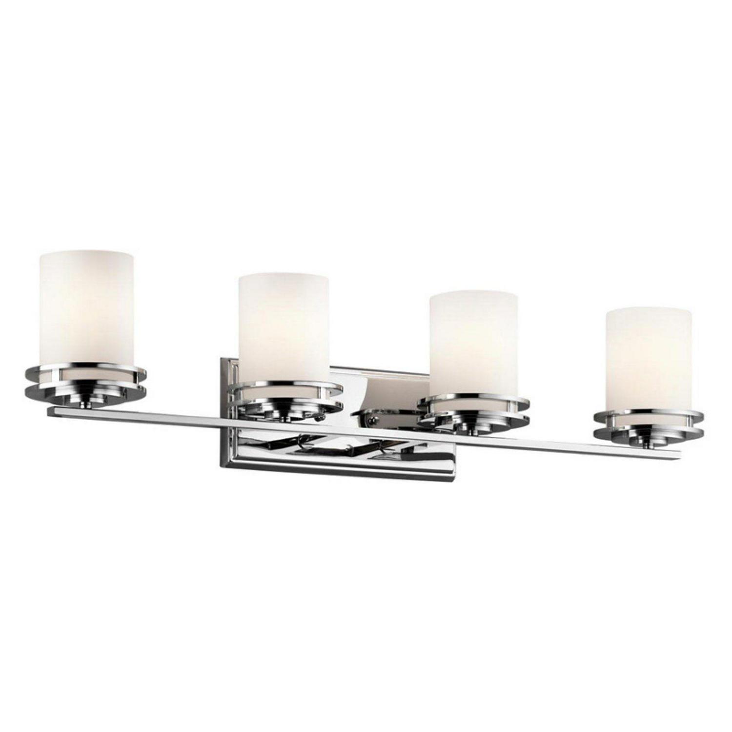 Kichler Lighting-5079CH-Collection: Hendrik, Material: Steel, Finish Color: Chrome, Width: 33.75″, Height: 7.75″, Depth: 6.5″, Height From Outlet Box: 5.75″, Backplate Width: 12″, Backplate Length: 4.5″, Lamping Type: Incandescent, Number Of Bulbs: 4, Wattage: 100 Watts, Dimmable: No, Moisture Rating: Damp Rated, Desc: The Hendrik(TM) 33.75in. 4 light vanity light features a classic look with its Chrome finish and satin etched cased opal glass. Inspired by Hendrik Berlage, the Hendrik vanity light works perfect in a bathroom or powder room that has a traditional and modern look. Mounting Direction: Up or Down / Back Plate Height: 4.50 / Back Plate Width: 12.00. ,-Hendrik – 4 light Bath Fixture – with Soft Contemporary inspirations – 7.75 inches tall by 33.75 inches wide-Chrome Finish