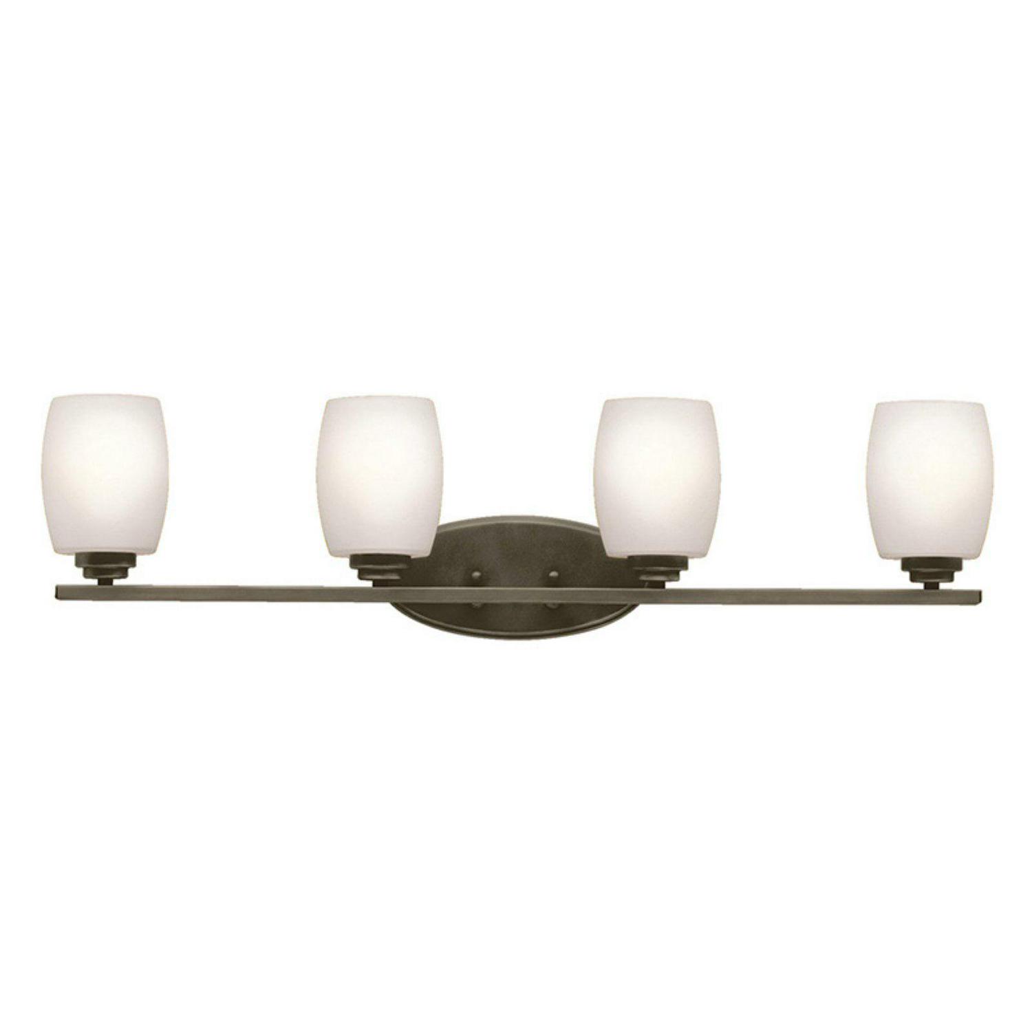 Kichler Lighting-5099NIL18-Collection: Eileen, Material: Steel, Finish Color: Brushed Nickel, Width: 33.75″, Height: 9.25″, Depth: 6″, Height From Outlet Box: 7″, Backplate Width: 10″, Backplate Length: 4.5″, Lamping Type: LED, Number Of Bulbs: 4, Wattage: 100 Watts, Moisture Rating: Damp Rated, Desc: Named after famed furniture designer Eileen Gray, this 4 light wall fixture from the Eileen(TM) Collection features a clean, straight linear construction. The clean, polished elegance of the Chrome finish and Etched Opal Glass creates an ideal complement for your home. Mounting Direction: Up or Down / Back Plate Height: 4.50 / Back Plate Width: 10.00. ,-Eileen – 4 Light Bath Vanity Approved for Damp Locations – with Contemporary inspirations – 9.25 inches tall by 33.75 inches wide-Brushed Nickel Finish-LED Lamping Type