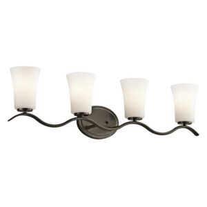 Kichler Lighting-45377NI-Collection: Armida, Material: Steel, Finish Color: Brushed Nickel, Width: 32.25″, Height: 9″, Depth: 5.75″, Height From Outlet Box: 6.5″, Lamping Type: Incandescent, Number Of Bulbs: 4, Wattage: 100 Watts, Moisture Rating: Damp Rated, Desc: This 4 light bath light from the Armida(TM) collection is filled with distinctive touches, clean lines and simple structures. This silhouette brings height and dimension to the Chrome finish. May be installed with the glass up or down. Mounting Direction: Up or Down. ,-Armida – 4 Light Bath Vanity Approved for Damp Locations – with Transitional inspirations – 32.25 inches wide-Brushed Nickel Finish-Incandescent Lamping Type