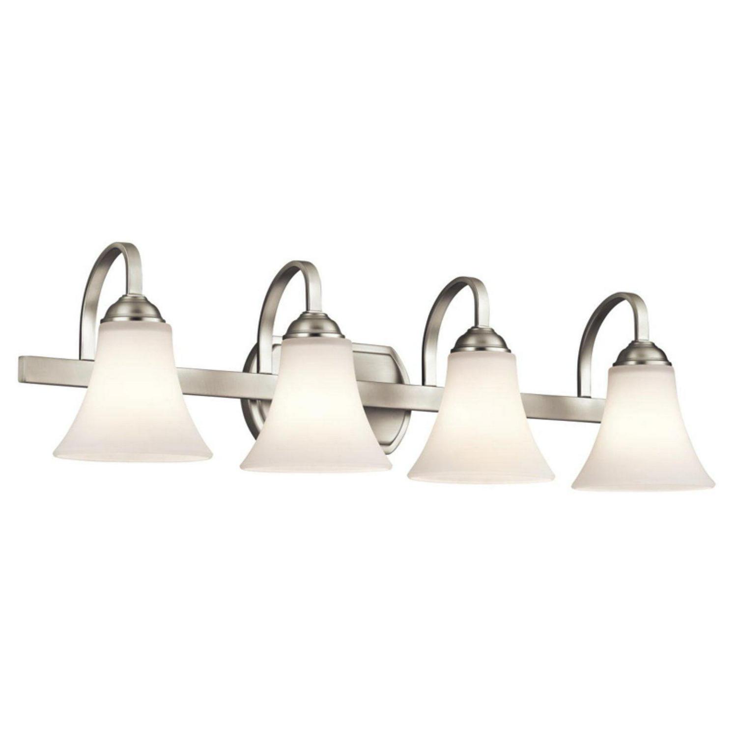 Kichler Lighting-45514NI-Collection: Keiran, Material: Steel, Finish Color: Brushed Nickel, Width: 30″, Height: 8.25″, Depth: 8.5″, Height From Outlet Box: 4.75″, Backplate Width: 8″, Backplate Length: 4.5″, Lamping Type: Incandescent, Number Of Bulbs: 4, Wattage: 100 Watts, Moisture Rating: Damp Rated, Desc: You’ll love how this 4 Light Bath light from the Keiran(TM) Collection blends traditional and soft touches to create a stylish look all its own. The smooth curves of the simple lines seem to caress the Satin etched glass as it holds it aloft. The perfect addition to any decor. Mounting Direction: Up or Down / Back Plate Height: 4.50 / Back Plate Width: 8.00. ,-Keiran – 4 Light Bath Vanity Approved for Damp Locations – with Transitional inspirations – 8.25 inches tall by 30 inches wide-Brushed Nickel Finish-Incandescent Lamping Type