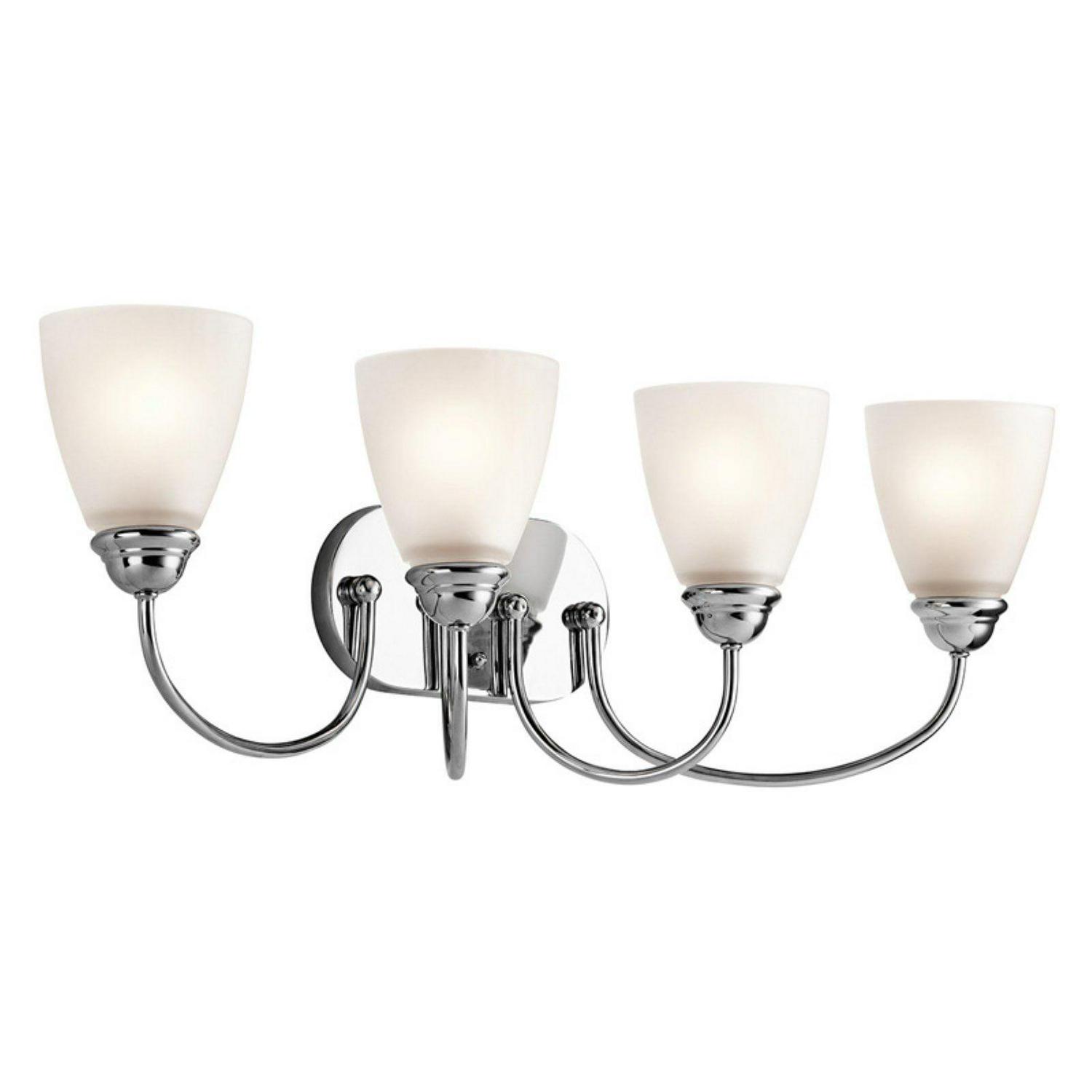 Kichler Lighting-45640NIL18-Collection: Jolie, Material: Steel, Finish Color: Brushed Nickel, Width: 28″, Height: 9.25″, Depth: 8″, Height From Outlet Box: 4.75″, Lamping Type: LED, Number Of Bulbs: 4, Wattage: 100 Watts, Moisture Rating: Damp Rated, Desc: Enjoy the splendor of this Chrome 4 light bath light from the refreshing Jolie Collection. The clean lines are beautifully accented by satin etched glass. Jolie is the perfect transitional style for a variety of homes. Mounting Direction: Up or Down. ,-Jolie – 4 Light Bath Vanity Approved for Damp Locations – with Transitional inspirations – 9.25 inches tall by 28 inches wide-Brushed Nickel Finish-LED Lamping Type