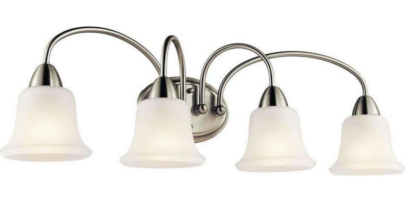 Kichler Lighting-45884NI-Collection: Nicholson, Material: Steel, Finish Color: Brushed Nickel, Width: 33″, Height: 10″, Depth: 8.5″, Height From Outlet Box: 5″, Lamping Type: Incandescent, Number Of Bulbs: 4, Wattage: 100 Watts, Dimmable: No, Moisture Rating: Damp Rated, Desc: This tasteful 4 light wall fixture from the Nicholson(TM) collection will make a refined statement in your home. Featuring an elegant, Brushed Nickel finish and Satin Etched Glass detailing, this design will complement a range of spaces in your home. Mounting Direction: Up or Down. ,-Nicholson – 4 Light Bath Vanity – with Transitional inspirations – 10 inches tall by 33 inches wide-Brushed Nickel Finish