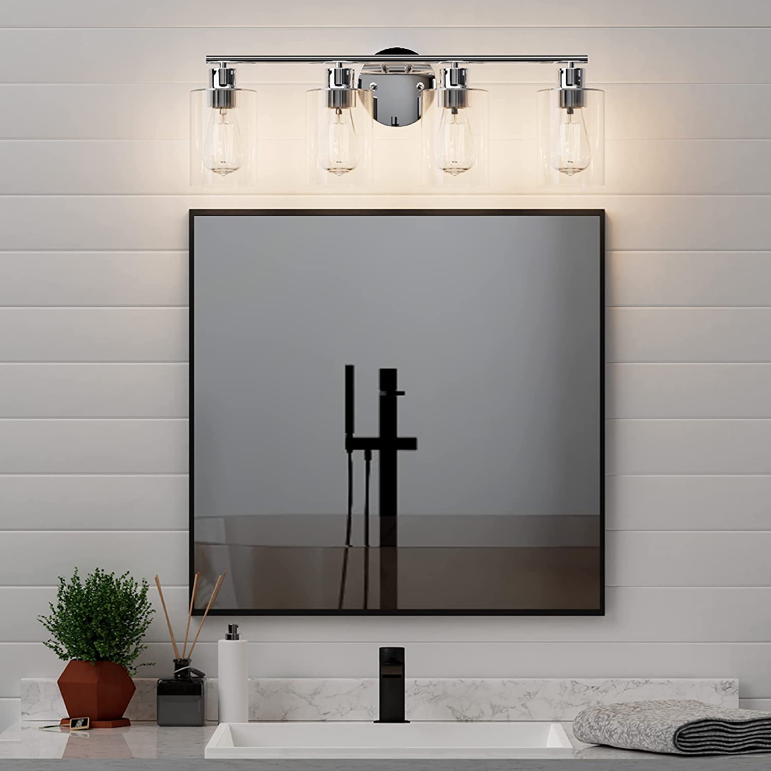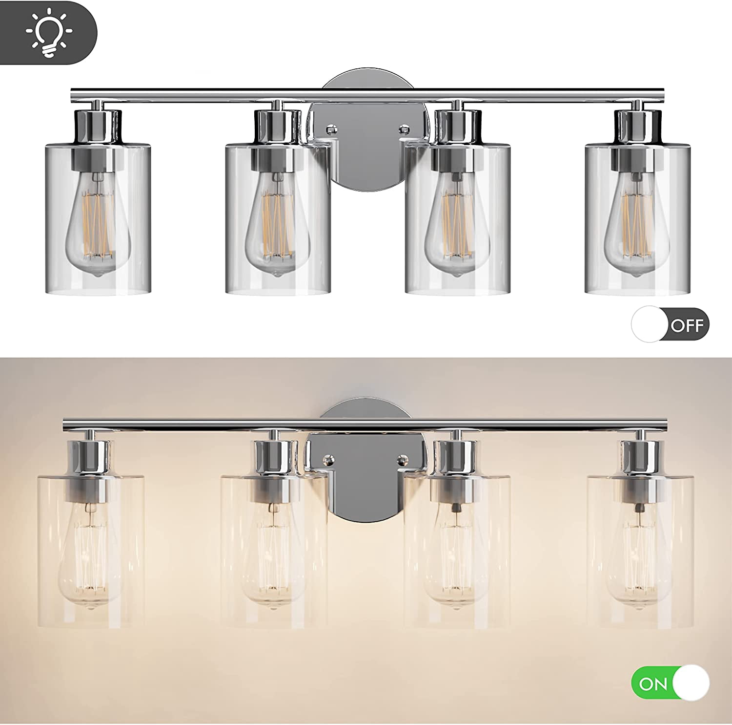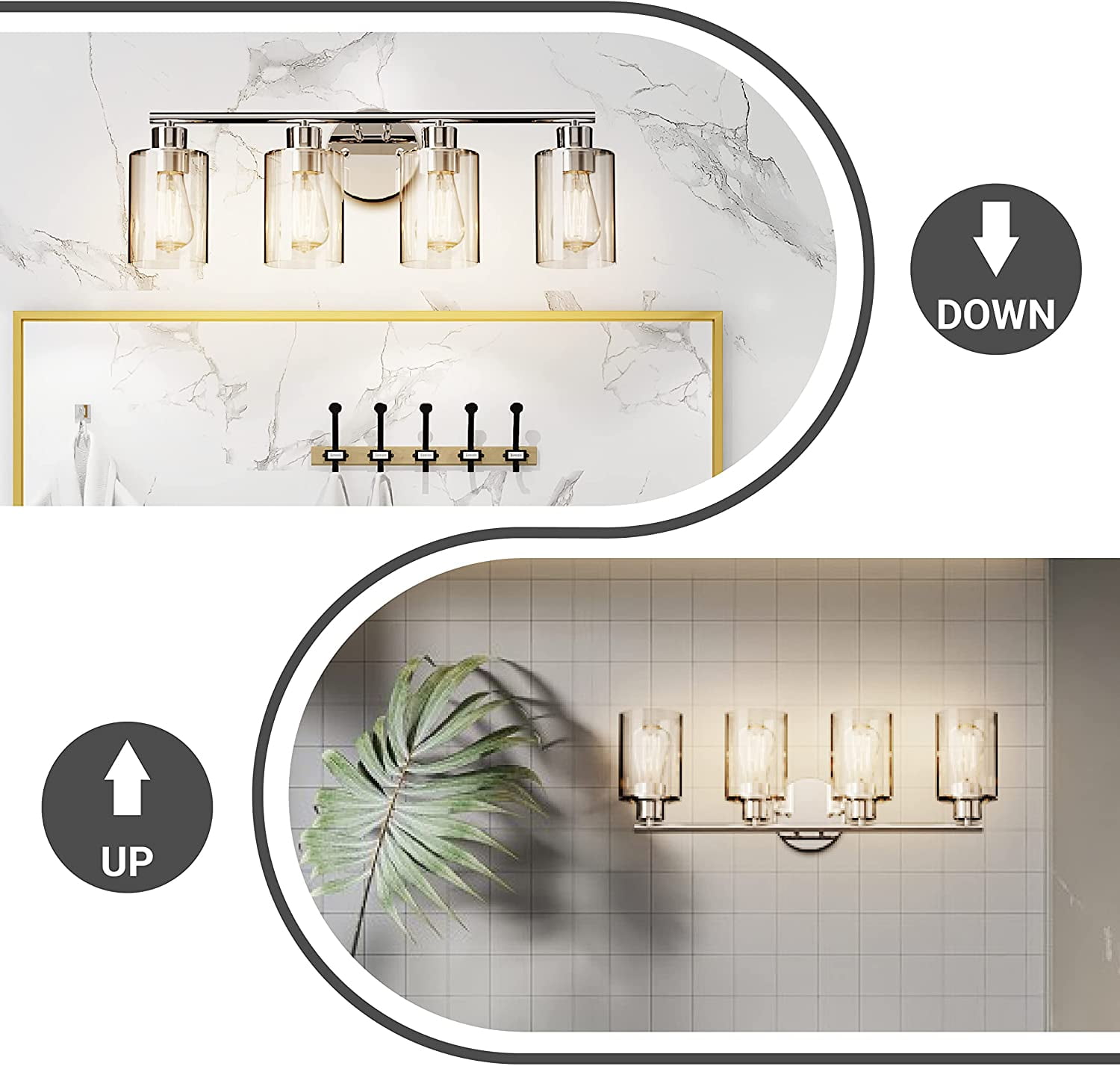 【Modern & Durable Construction】- The 4-Light Vanity Light is built in a sturdy metal lamp body with clear glass shades. Withstands well through years of usage without getting oxidation or color fading. It suits perfectly a damp place such as a bathroom, laundry room, etc. Whether your house is a modern, vintage, country farmhouse, or industrial architectural style, it can be used to match your decor. 【E26 Standard Base Required】- Our bathroom lights are compatible with all E26 standard USA sockets such as LED, Incandescent, CFL, RGB, Halogen, or Dimmable Bulbs ( Bulb are not INCLUDED, MAX 60W for each bulb). This 4-Light sconces wall decor blend is excellent with different bulb styles to bring you a different taste for your ambiance. 【Easy & DIY Installation】- All mounting hardware required for bathroom sconces installation is included in the package. Only need to connect the wire, then place the glass shades and bulbs. With a modern DIY function, it can be mounted facing upward or downward to suit your needs. You can install it easier anywhere you like by yourself. 【Wide Application】- This Light Fixtures with the perfect dimension of glass shade:3.9″ x 5.5″ (L x H) and wall sconce:24″ x 8″ (W x H) which is an excellent idea for your bathroom mirror or bedroom, living room, dressing table, vanity cabinet, mirror cabinets, doorway, hallway or entryway, corridor, foyer, bar coffee shop. Also, it can be used as a wall mount light, single vanity light, bathroom light, etc. 【After-sales service】- GOSONKT provides 30 days of free returns and a 2-year warranty free replacement. If you have any problems with our product, don’t hesitate to get in touch with us. Our customer service will reply within 24 hours!!