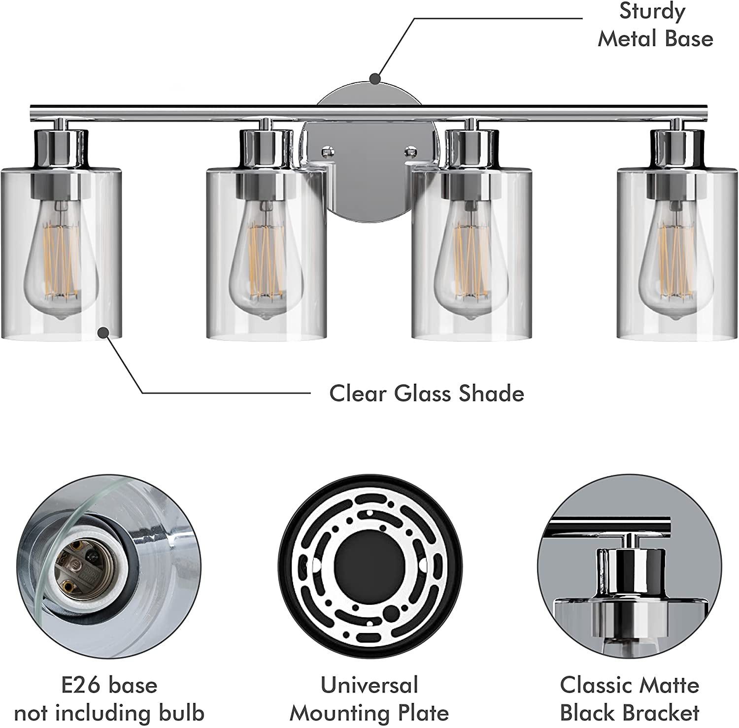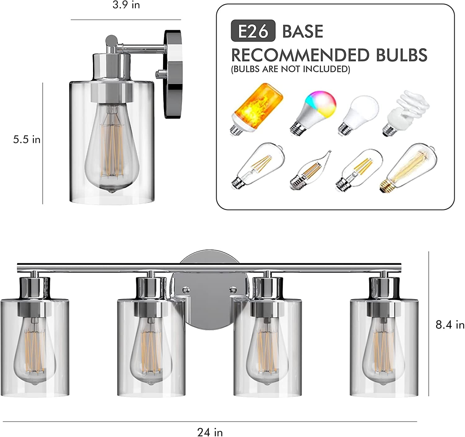 Type: 4-Light Vanity LightMaterial: Metal+Glass Number of Lights: 4-light Sconces Dimension: 24″ x 8.42″ (W x H) Glass Shade Dimension: 3.9″x5.5″(L x H) Canopy:4.7″ Base Type: E26 Base Note: Bulbs not included