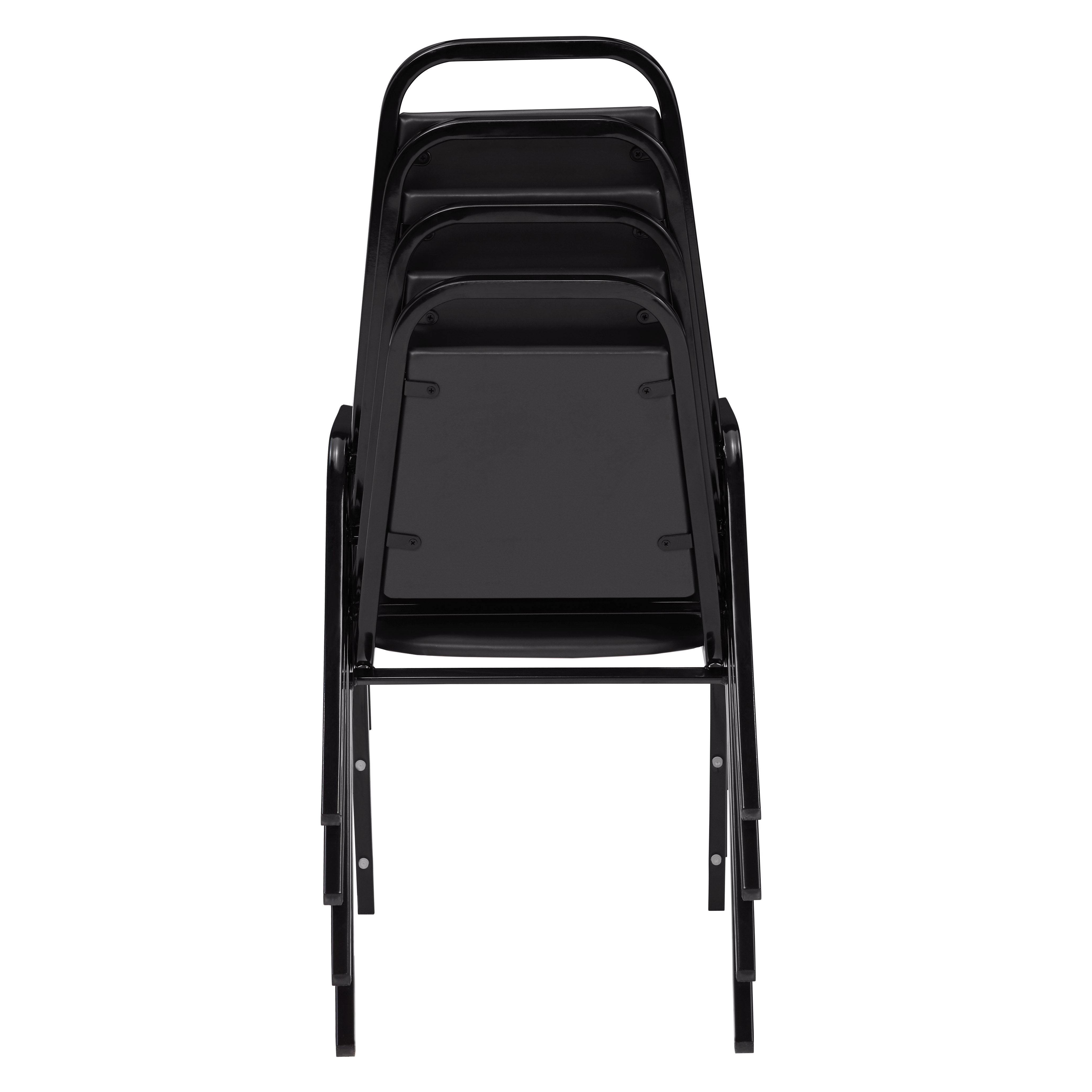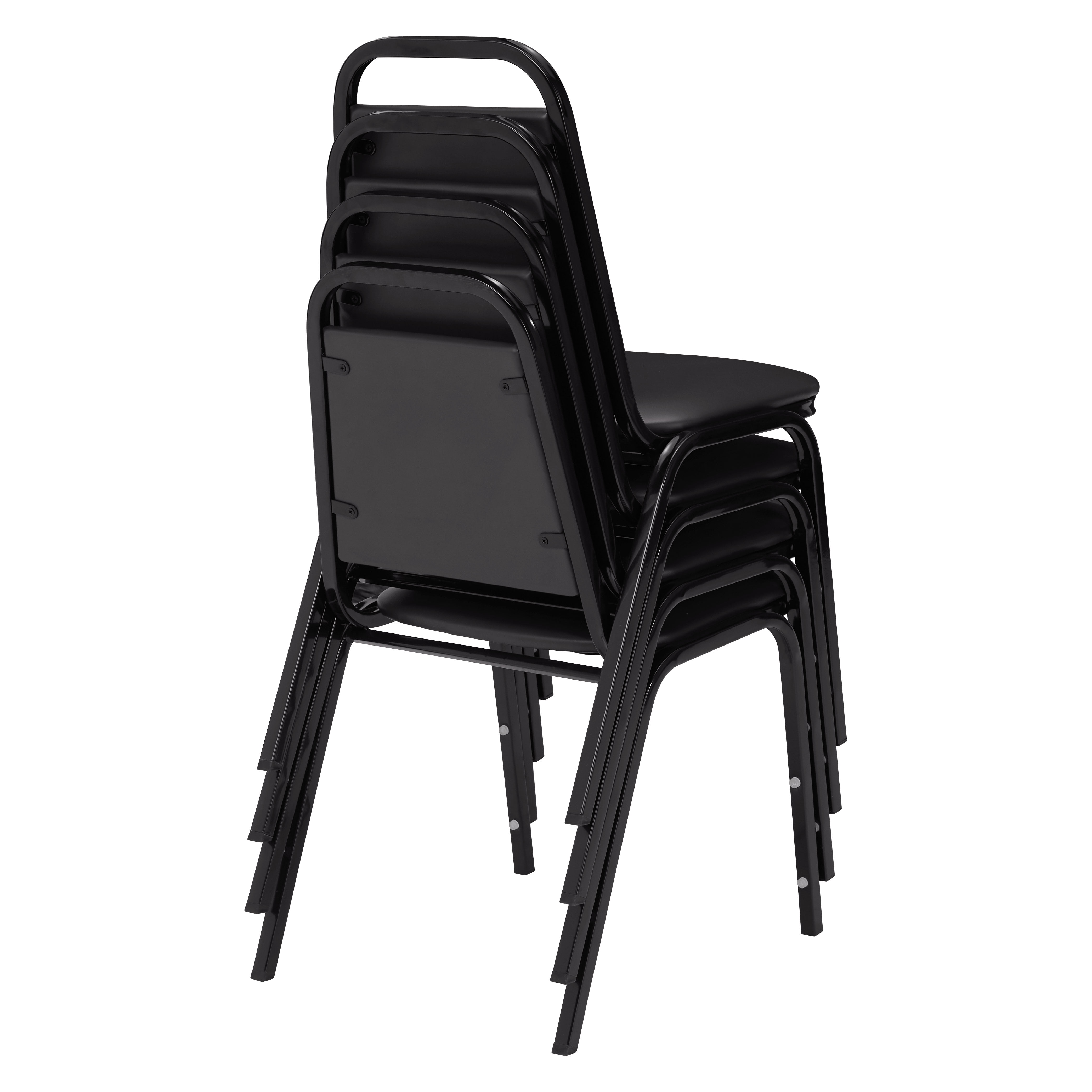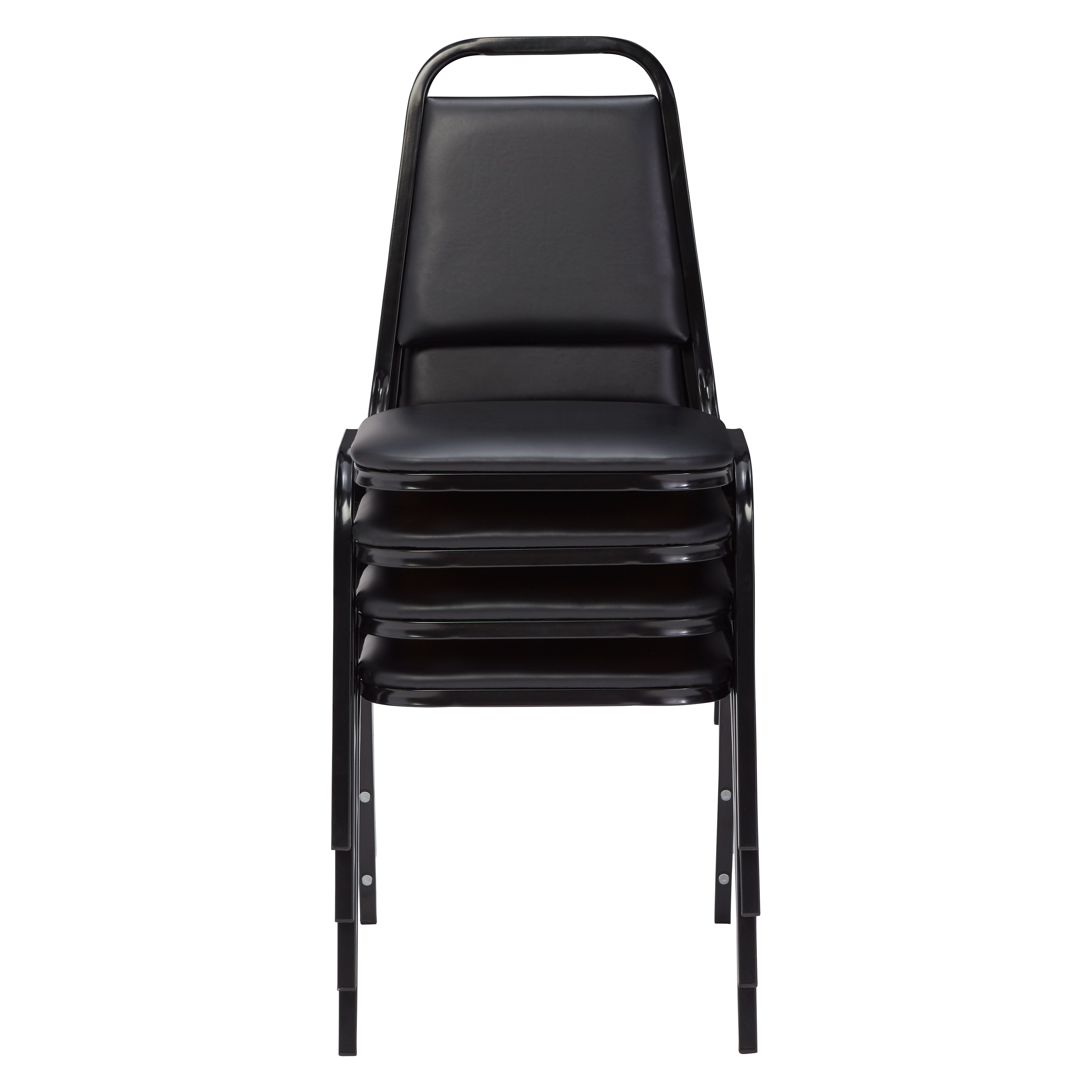 The NPS #9110-B (Black Vinyl Seat Black Frame 4 Pack) Is a Value Stacker for any venue. This affordable, upholstered stack chair brandishes a 1.5″-thick, pullover-style, foam-padded cushion covered with thick easy-to-clean vinyl. Built with a Plywood core within the seat and tapered backrest and features a built-in handle for easy moving and stacking. A mighty 19-gauge square tubular steel frame includes under-seat bars to provide excellent support along with plastic glides to avoid marring floor surfaces. Safely stack up to 10 chairs, each with eight plastic bumpers attached to protect its attractive black powder-coated paint finish from scratching.