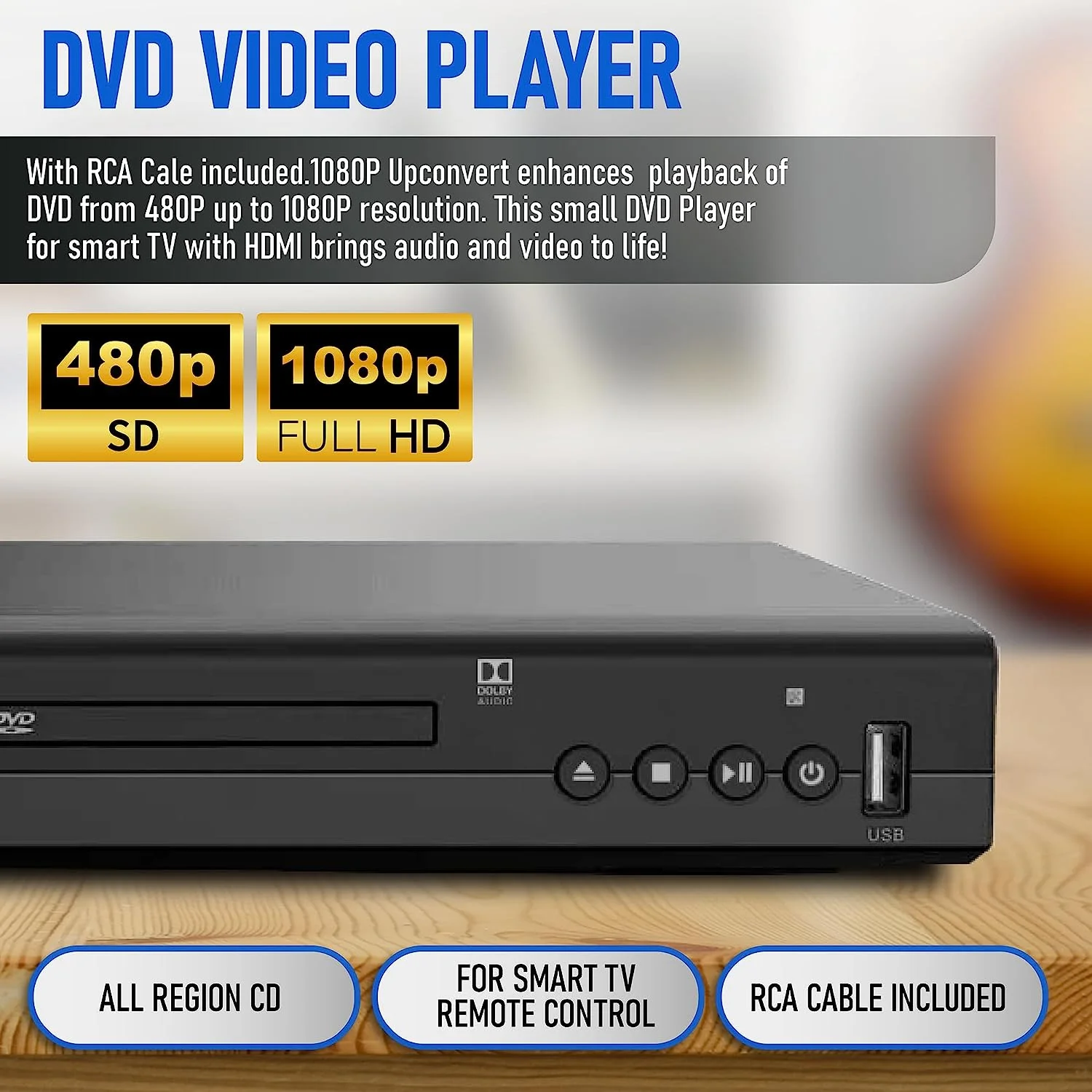 Enjoy this all region DVD players for TV. This Cheap DVD-player is a universal DVD player for all Movies. It plays zones 1, 2, 3, 4, 5, and 6. Play any disc you desire with this Multi Region CD player 1080p. It is compatible with DVD: CD, (S), VCD, DVD, DVD+R/RW, DVD-R/RW, or MP3. The DVD players for TV includes a remote control. Connecting PCs and peripherals is easy with the USB DVD remote control player combo. It has both AV output and USB input. All you have to do with USB Media Link is plug in your USB device, select a movie, music, or photo, and play away! No matter what you watch on your compact DVD for TV, Screen Fit fills the entire screen. Great CD players for home stereo system. Dolby on DVD Players blu ray and regular that preserves every detail of authentic picture quality. This DVD Player is not a Blu Ray player or a Blu Ray DVD Player, so it cannot play Blu-ray discs. It is compatible with CD, DVD, DVD+R/RW, DVD-R/RW, and MP. The DVD CD player includes a remote control, an AC/USB adapter, and an RCA cable. Standard DVD players for TV and doesn’t come with HDMI connection