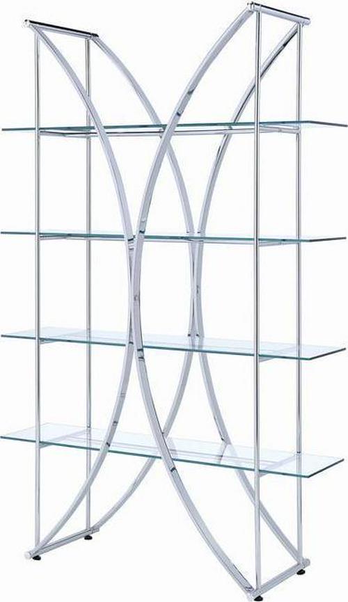The ultimate in contemporary design rests in this eye-catching bookcase. Modern architecture meets art in a compelling silhouette blending arc-shaped and linear steel frames with clear tempered glass shelves. Four tiers offer ample space for displaying books, decor, and potted greenery. A fresh chrome finish adds luster to a tastefully designed contemporary space. Energize a modern room with a subtle yet tasteful bookcase.