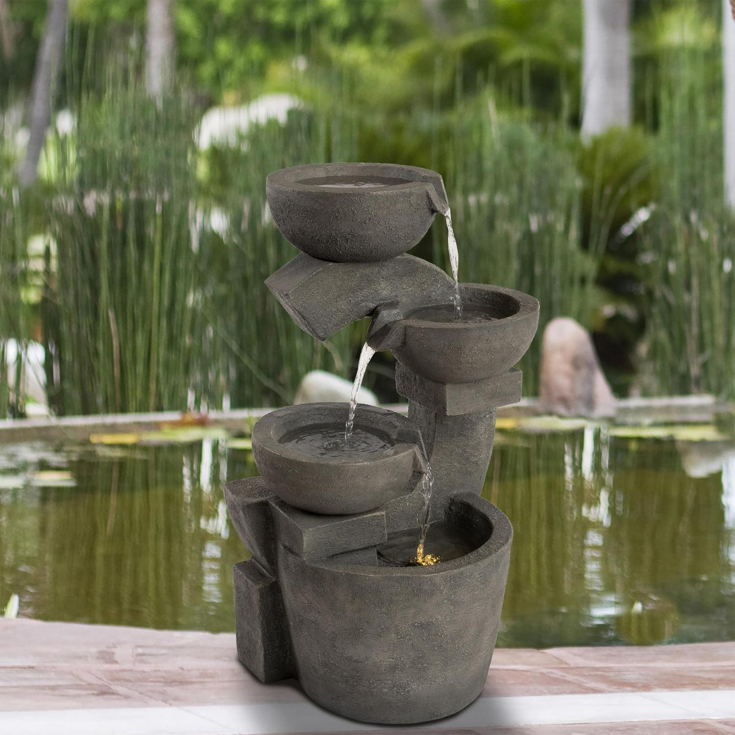 Create your own calming backyard oasis with the 4-Tier LED Polyresin Bowl Fountain by Pure Garden. This outdoor water feature is made of durable polyresin to resist the elements and corrosion from circulating water. The fountain is hand painted for a unique look and has a modern design that is sure to complement almost any backyard décor. The fountain has a 2.1-gallon capacity and includes a recirculation pump for continuous water flow. The water feature also includes LED lights on the top tier which provide a soft, warm glow so you can enjoy a relaxing atmosphere. The fountain easily sets up in minutes and is powered by a 6-foot wall outlet cord so it can be placed almost anywhere on your deck, patio or in your backyard.