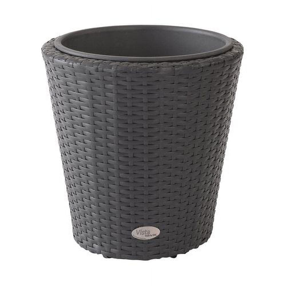 Featuring WeatherWise flat resin wicker, the 40 in. Round Resin Wicker Vista Planter is built to last in even the fiercest weather conditions. This round wicker planter features a rustproof, powder-coated black frame to further enhance its strength. It also comes with a heavy-duty plastic liner to enable direct planting. To protect floors and provide level placement, each planter has adjustable. Thanks to a self-watering feature, Vista planters require less day-to-day maintenance than other planters. Includes 3-year warranty. Dimensions: 18 diam. x 40H inches.