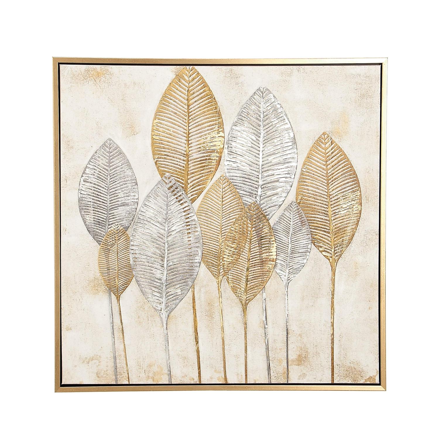 – Modern gold wall art features a square framed canvas with a leaf painted design and brushed textured background