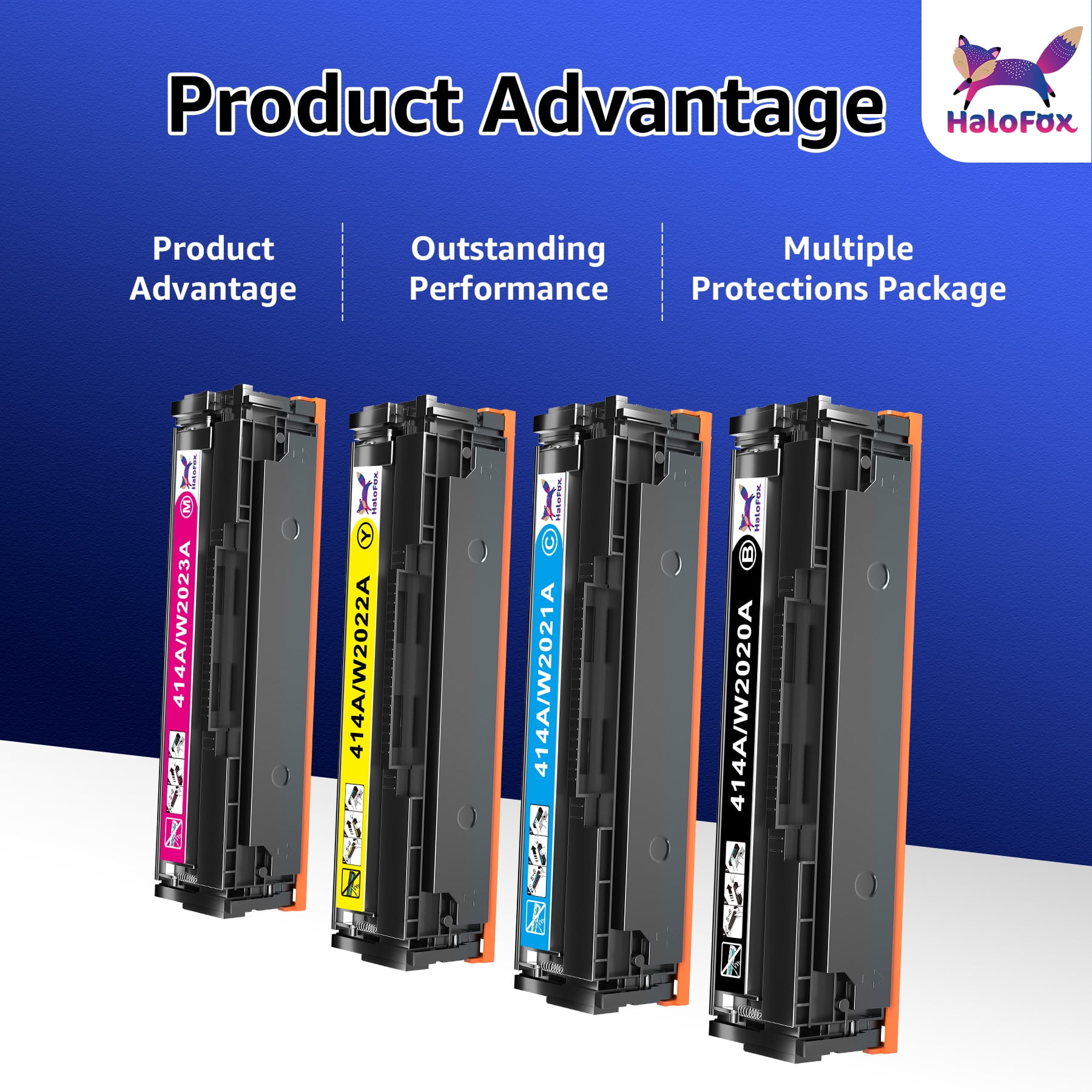 Package include: 414A 414X W2020A black * 1 / W2021A cyan * 1 / W2023A magenta * 1 / W2022A yellow * 1. Compatible Printers : HP Color LaserJet Pro MFP M479fdw HP Color LaserJet Pro MFP M479fdn HP Color LaserJet Pro MFP M479 HP Color LaserJet Pro M454dw HP Color LaserJet Pro M454dn HP Color LaserJet Pro M454 High Page Yield(5% coverage on A4) : 2400 pages per 414 414A 414X W2020A black toner cartridge. 2100 pages per 414 414A 414X W2021A W2021A W2022A W2023A color toner cartridge. Worth to Trust: no longer worry about other inferior cartridges damage your printer,Halofox make printing easy and affordable for customers. Warm Tip: this is 4 color cartridges without photo black,please confirm your printer model before ordering HaloFox is one of the largest distributors of ink and toner cartridges in the United States.It has mature technology and unique toner formula,so that can bring cheaper and stably compatible cartridges for customers.Any questions or concerns,please feel free to contact us, and we will reply you within 24 hours.