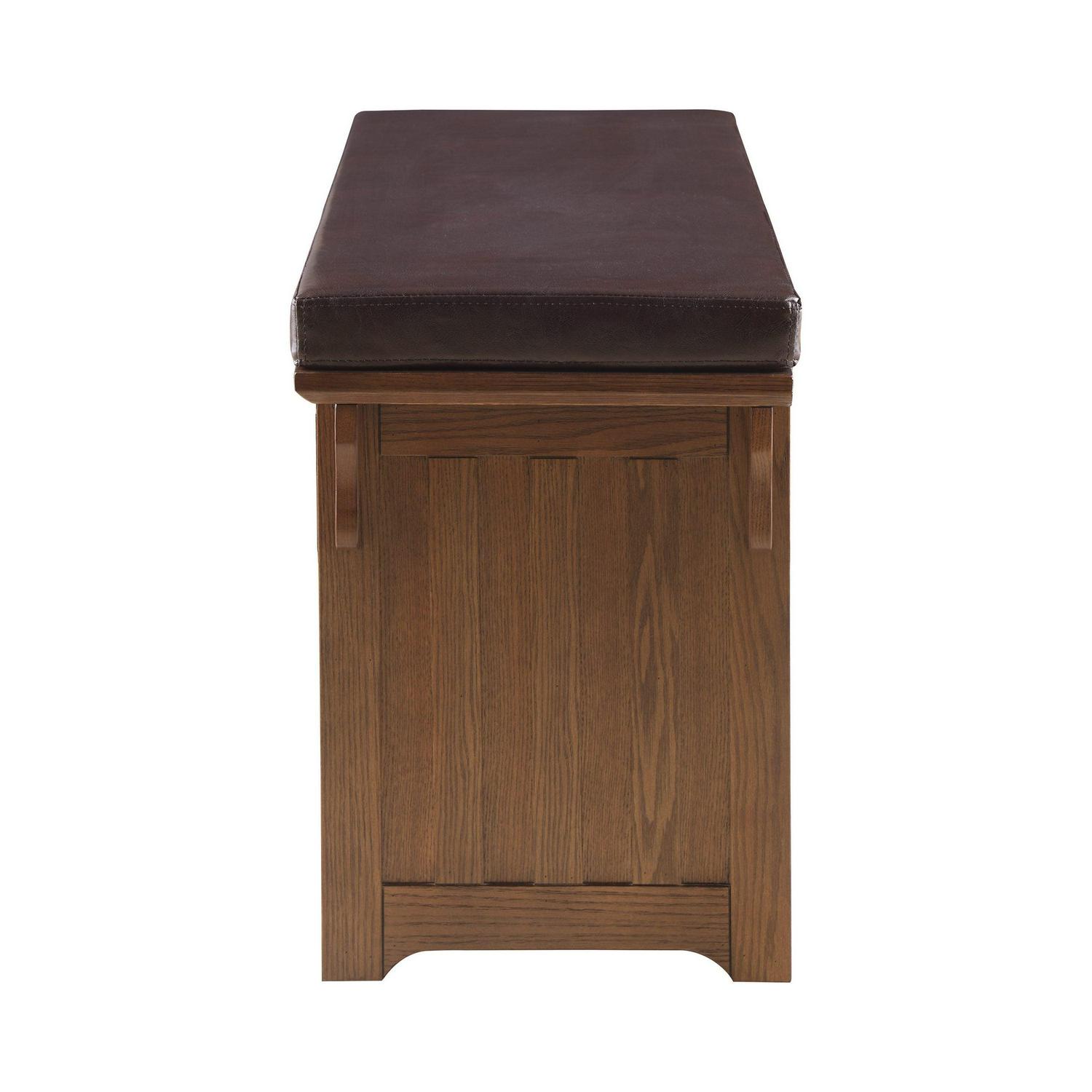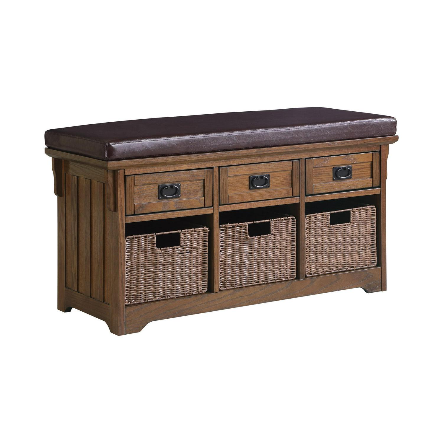 Adorn a traditional living room or entryway in style. Storage options abound in this classic bench, a reflection of beloved farmhouse styling. Enjoy the warm look of a medium brown finish that delivers a rustic flavor. Three storage baskets provide a charming accent, and three storage drawers make it simple to access essentials and miscellaneous. This storage bench is topped with a padded seat cushion wrapped in lovely medium brown leatherette.