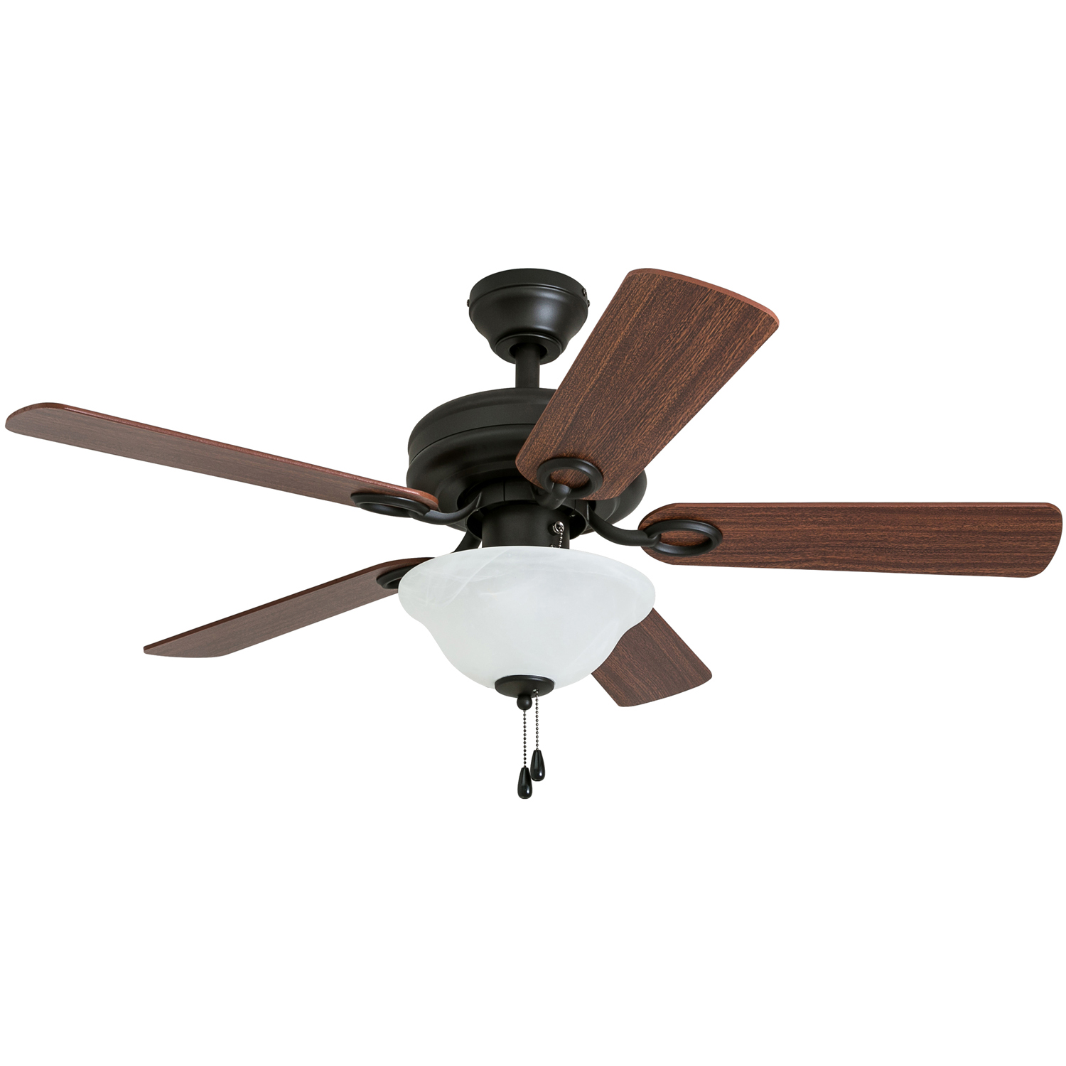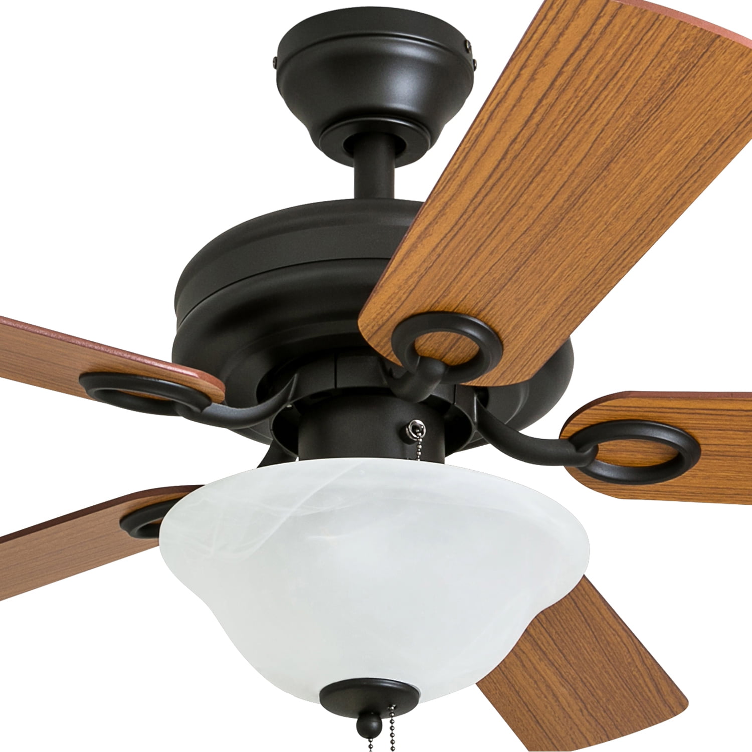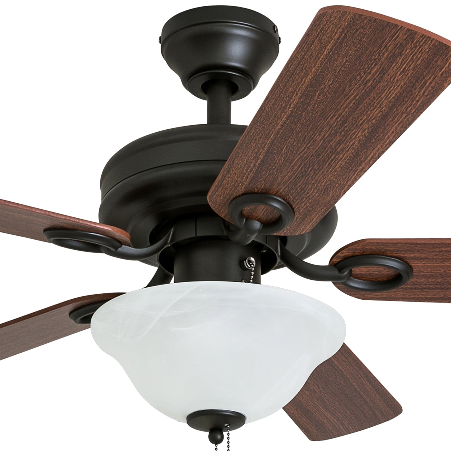 HIGH AIR-FLOW: Enjoy the cool breeze created by a ceiling fan! Three speeds allow for the perfect setting for your space. QUIET, REVERSIBLE MOTOR: Conveniently quiet, reversible motor. Can be run in the winter to aid in rotating warm air and cutting down on energy costs. MEDIUM SIZED ROOMS: Perfect for rooms around 350 square feet such as living rooms, bedrooms, dining rooms or family rooms. TWO-BLADE FINISHES: Get the perfect finish match with our reversible ceiling fan blades. Each side has a unique finish to compliment your space. 100% SATISFACTION GUARANTEED: Limited manufacturer’s warranty. You’ll love this ceiling fan!