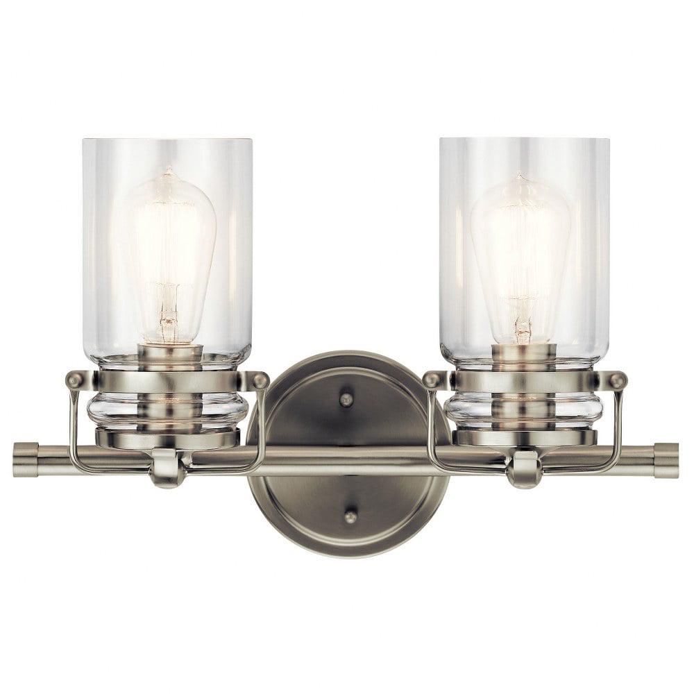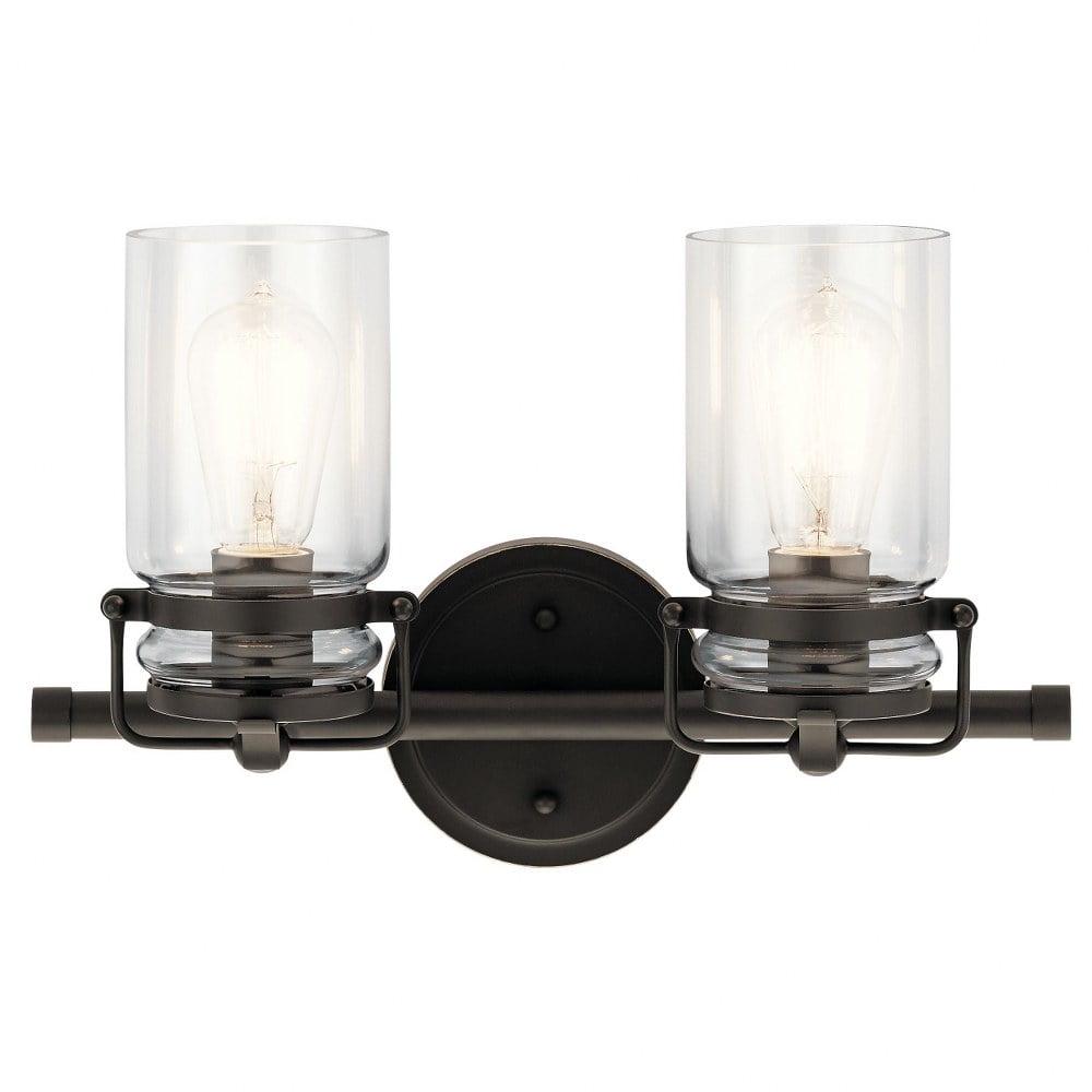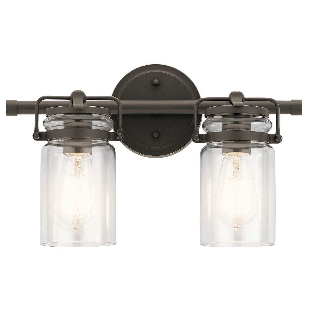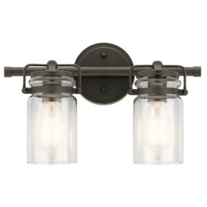 Kichler Lighting-45688CPZ-Collection: Brinley, Material: Steel, Finish Color: Champagne Bronze, Width: 15.75″, Height: 10″, Depth: 6.5″, Height From Outlet Box: 2.5″, Backplate Width: 5″, Lamping Type: Incandescent, Number Of Bulbs: 2, Wattage: 75 Watts, Dimmable: No, Moisture Rating: Damp Rated, Desc: The vintage mason jar style of the Brinley(TM) collection 2-light bath light in Brushed Nickel gives a beautifully modern treatment to the familiar and comfort of canning jars. Back Plate Width: 5.00. ,-Brinley – 2 Light Bath Vanity Approved for Damp Locations – with Vintage Industrial inspirations – 10 inches tall by 15.75 inches wide-Champagne Bronze Finish