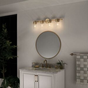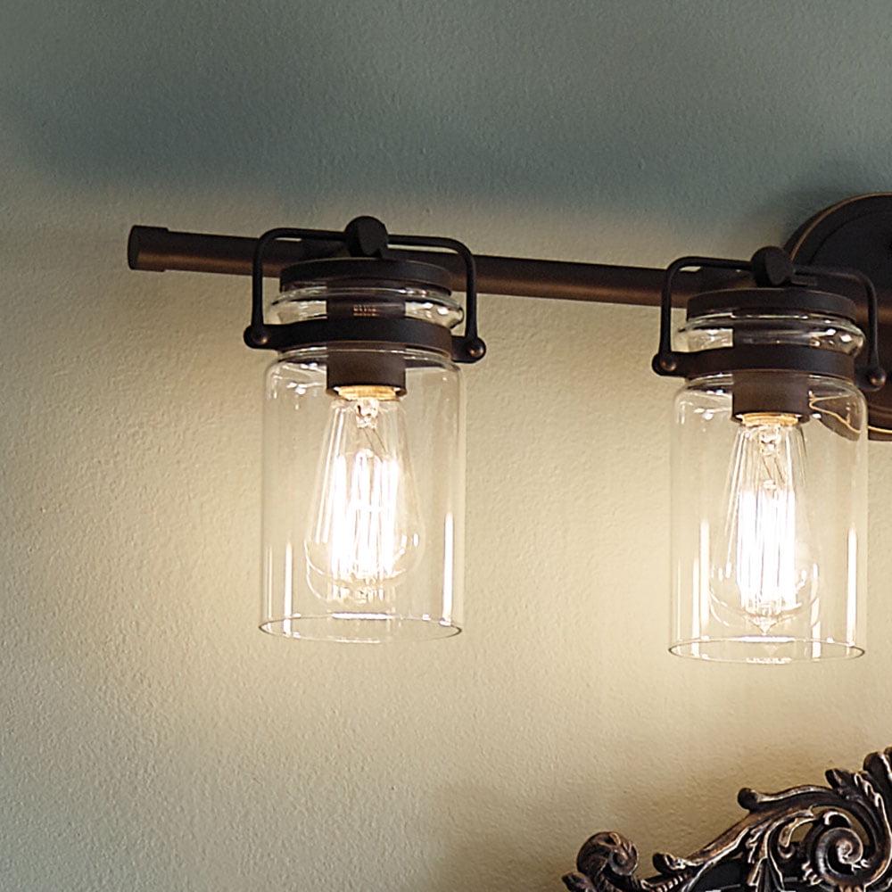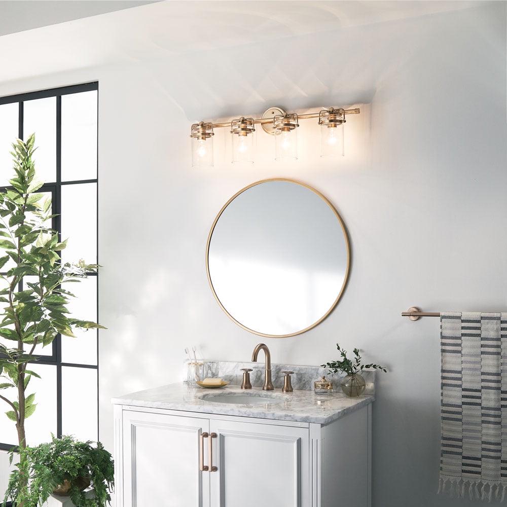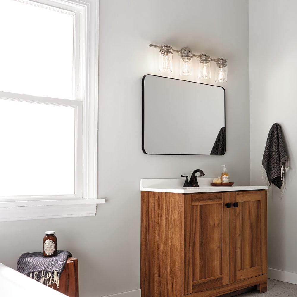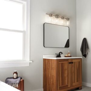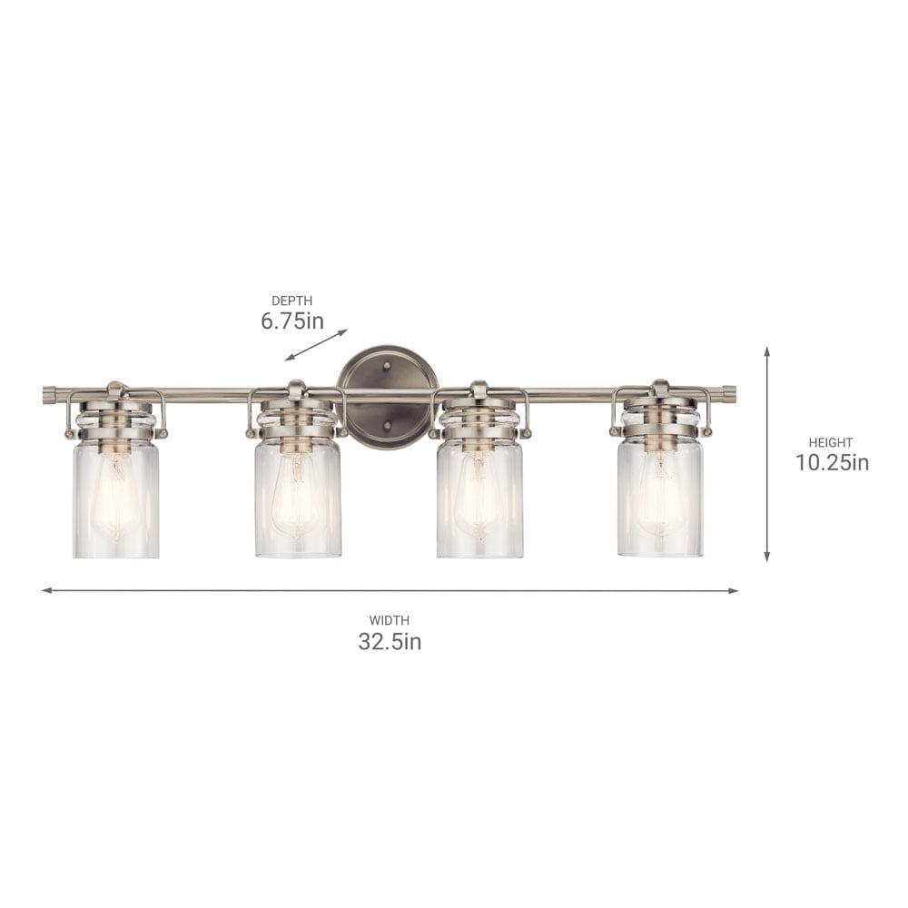 Kichler Lighting-45690CPZ-Collection: Brinley, Material: Steel, Finish Color: Champagne Bronze, Width: 32.25″, Height: 10″, Depth: 6.5″, Height From Outlet Box: 2.5″, Backplate Width: 5″, Lamping Type: Incandescent, Number Of Bulbs: 4, Wattage: 75 Watts, Dimmable: No, Moisture Rating: Damp Rated, Desc: The vintage mason jar style of the Brinley(TM) collection 4-light bath light in Brushed Nickel gives a beautifully modern treatment to the familiar and comfort of canning jars. Back Plate Width: 5.00. ,-Brinley – 4 Light Bath Vanity Approved for Damp Locations – with Vintage Industrial inspirations – 10 inches tall by 32.25 inches wide-Champagne Bronze Finish