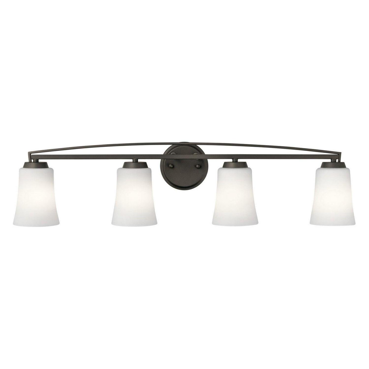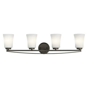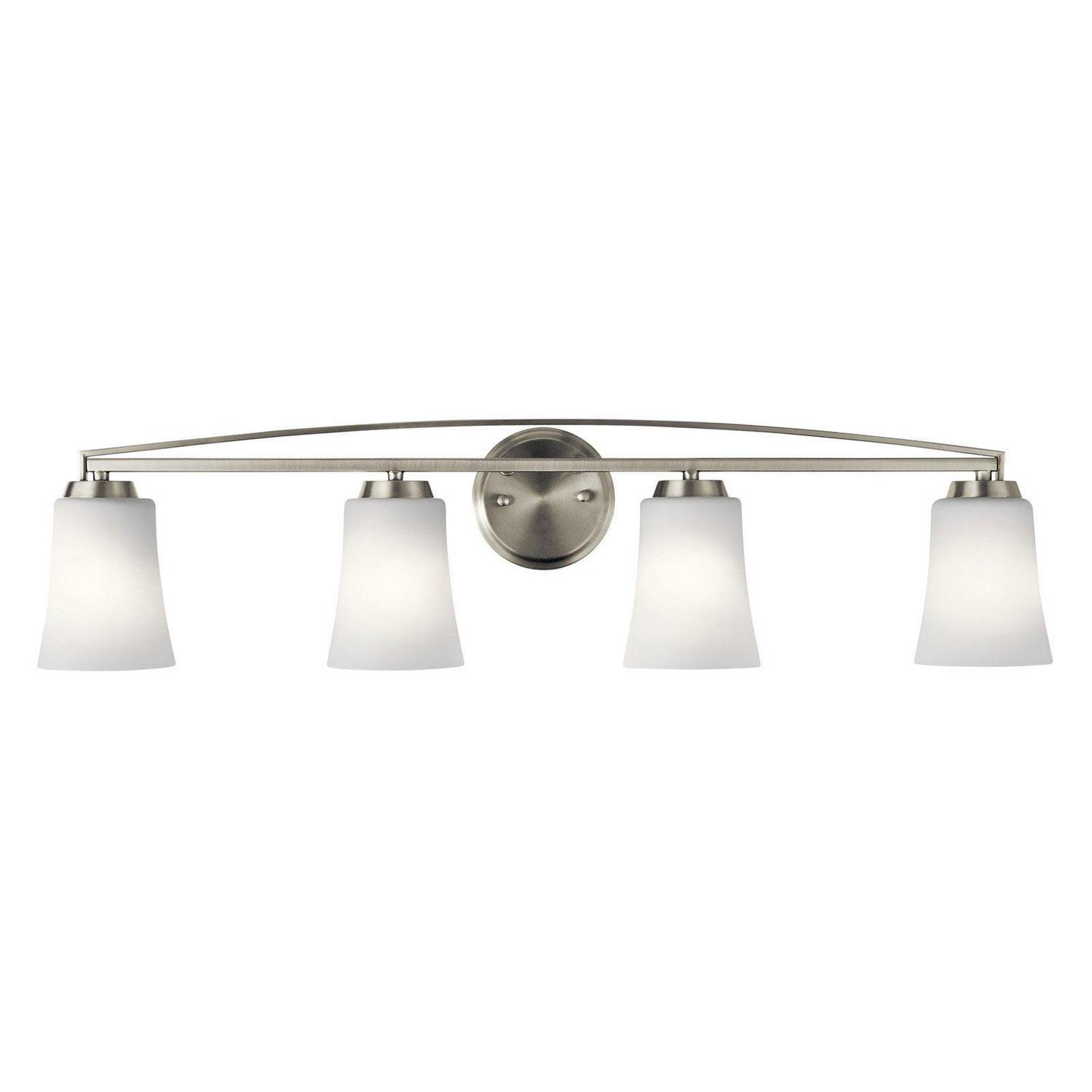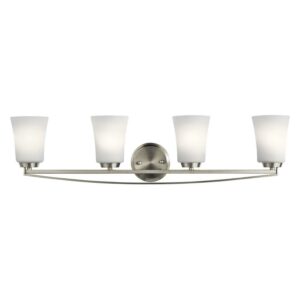 Kichler Lighting-45891NI-Collection: Tao, Material: Steel, Finish Color: Brushed Nickel, Width: 34″, Height: 8″, Depth: 6.5″, Height From Outlet Box: 5.5″, Backplate Width: 5″, Lamping Type: Incandescent, Number Of Bulbs: 4, Wattage: 75 Watts, Dimmable: No, Moisture Rating: Damp Rated, Desc: The Tao collection 4-light 34in. bath light comes in a Brushed Nickel finish. The collections Asian influence takes many forms, from balanced cage-like structures to rectangular lantern-inspired glass. The result is a look that’s pure and peaceful, with a nod towards arts & crafts style. Mounting Direction: Up or Down / Back Plate Width: 5.00. ,-Tao – 4 Light Bath Vanity Approved for Damp Locations – with Contemporary inspirations – 8 inches tall by 34 inches wide-Brushed Nickel Finish