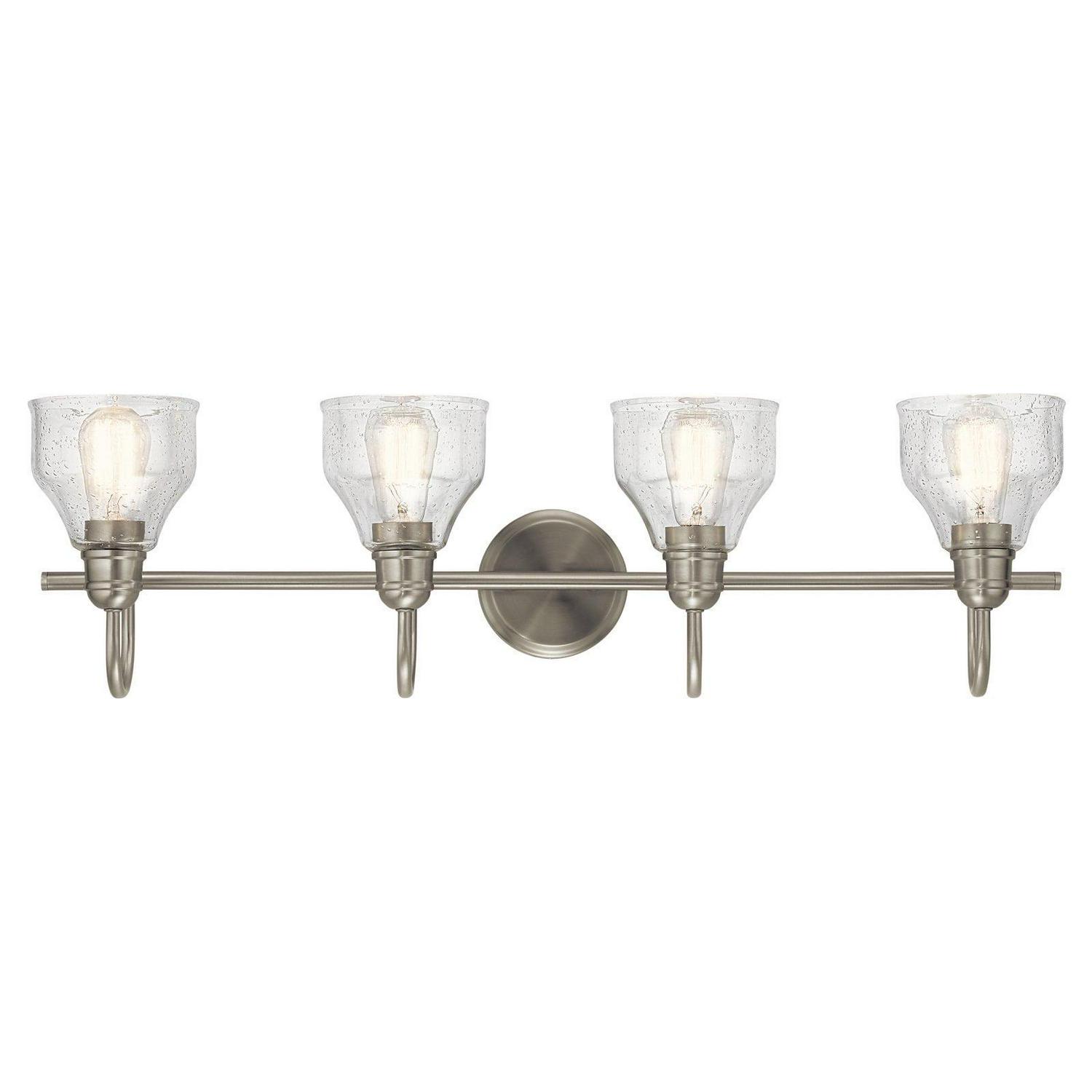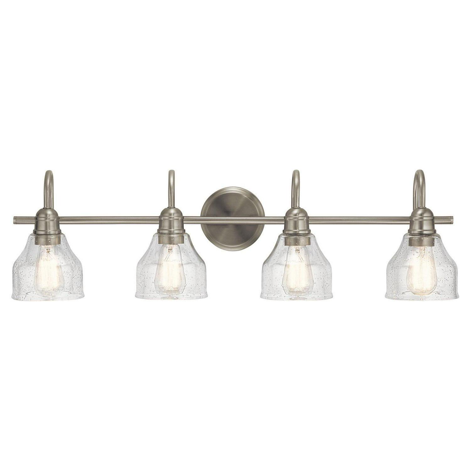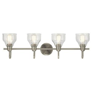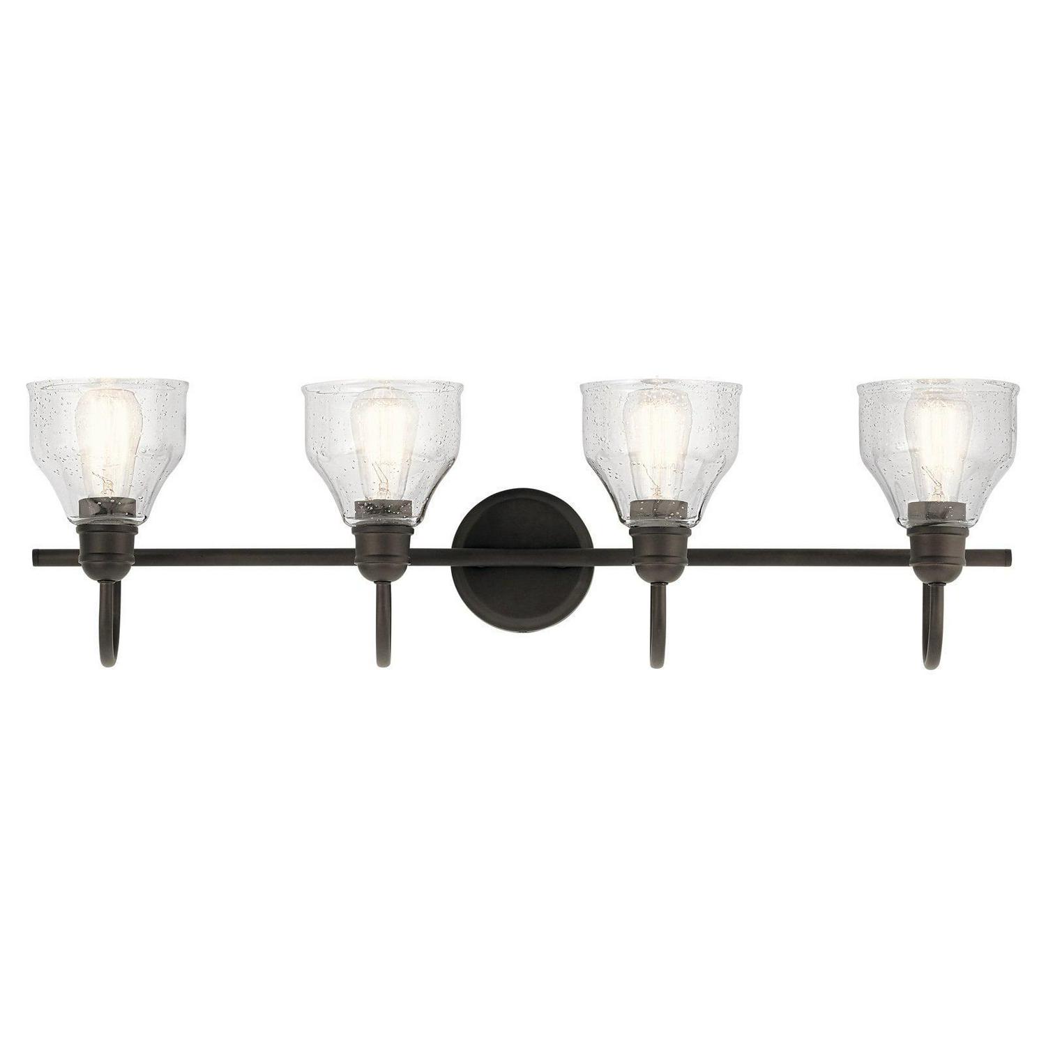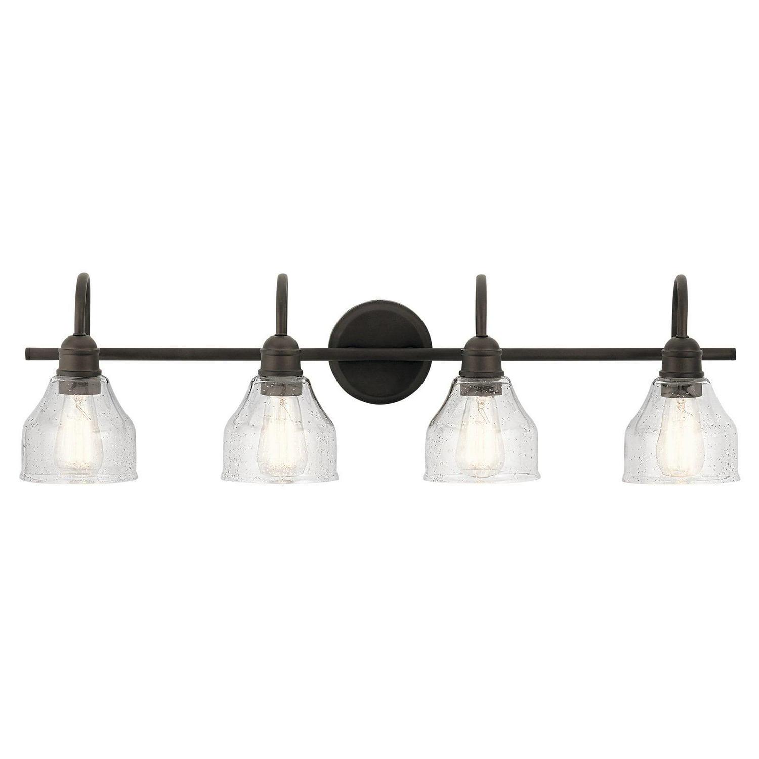 Kichler Lighting-45974OZ-Collection: Avery, Material: Steel, Finish Color: Olde Bronze, Width: 33.25″, Height: 9.25″, Depth: 8″, Height From Outlet Box: 4″, Backplate Width: 5″, Lamping Type: Incandescent, Number Of Bulbs: 4, Wattage: 75 Watts, Dimmable: No, Moisture Rating: Damp Rated, Desc: Create a masterpiece with this 4 light bath light from the Avery collection. In a Natural Brass finish with Clear Seeded glass. Back Plate Width: 5.00. ,-Avery – 4 Light Bath Vanity Approved for Damp Locations – with Vintage Industrial inspirations – 9.25 inches tall by 33.25 inches wide-Olde Bronze Finish