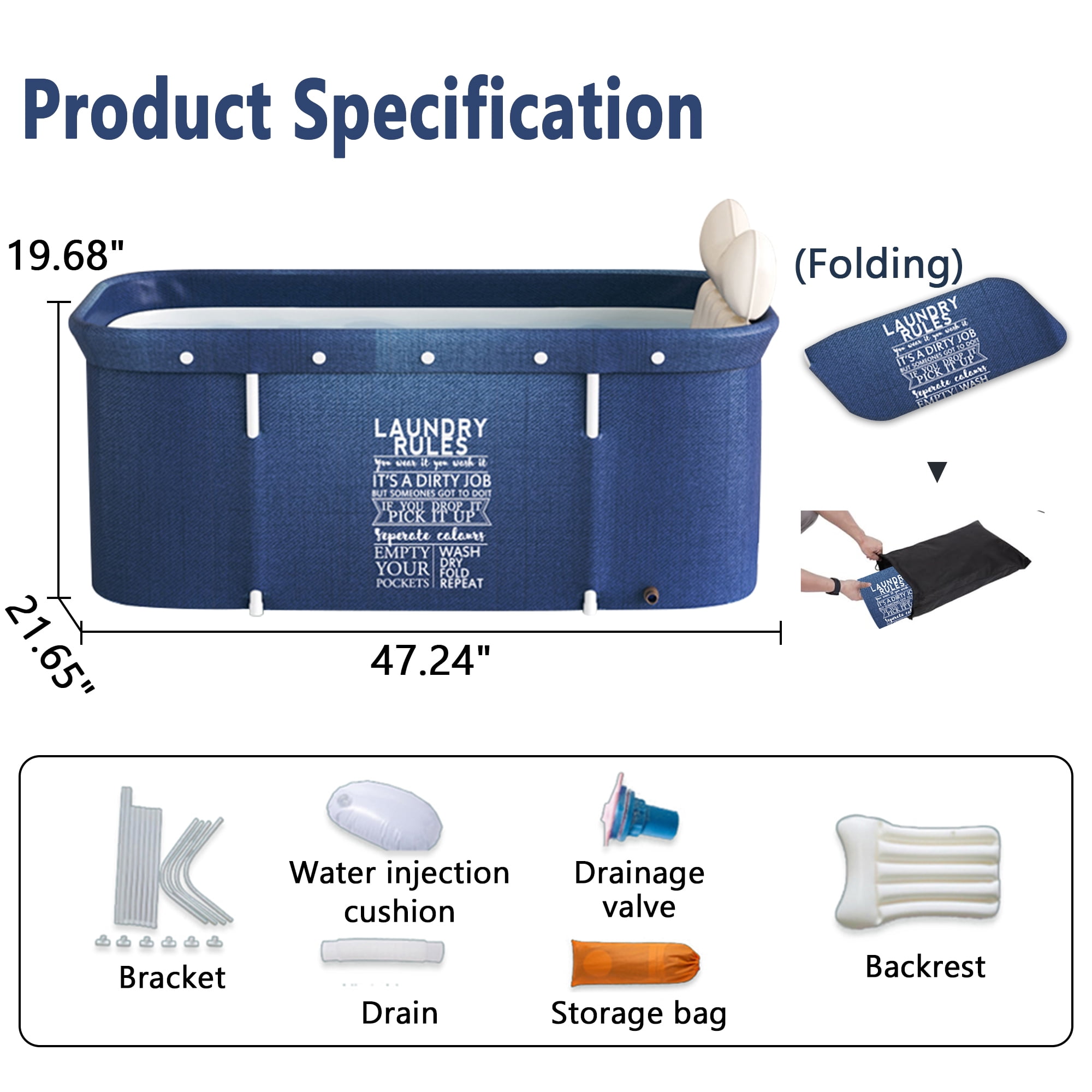 【Enjoy the simple happiness】The Foldable Bathtub packing size of 47.2″x21.6″x19.6″ adult foldable bathtub provides you with comfortable stretching space. You can stretch your feet freely in the water. Big enough for adult and children. You can enjoy the bath time. It can even be used by two people. 【Foldable, Lightweight & Easy to Store】The soaking bath tub is light and easy to carry. After use, you can put the bathtub under the bed, or in the corner. It won’t take up too much space for you. 【Long Time Insulation】The bathtub is equipped with a thermal insulation cover, which can strengthen the thermal insulation effect, reduce the heat dissipation, and keep it warm for a long time. 【Enjoy Spa and Bath in the Small Room】 The setting is simpler and faster, and you dont need to pump air like most other plastic bathtubs. Takes a small space even in your shower or small bathroom. It is ideal for use as a ice bath tub,soaking tub , portable outdoor bath tub. 【Suitable for Many Occasion】Thanks to the light weight and foldable design of our bathtub, now the bathtub not only be used at Home, also ideal for Road Trip, Garden, Rental House that not having bathtub, Travel, etc. 【Packing include set】Easy to install, store and drain after bathing. The kit includes 12*Bracket,1*Water injection cushion,1*Drain valve,1*Storage bag,1*drain,10*Bath bag,1*Backrest,1*folding bathtub.