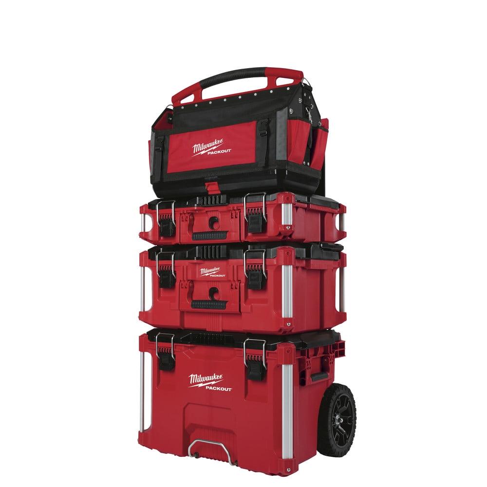 Part of the packout Modular storage system, the packout storage tote is manufactured of a durable 1980D ballistic material, impact resistant molded base and handle with all metal hardware easily withstanding tough use on the jobsite. Designed with reinforced side walls for added strength and a padded shoulder strap ensuring comfortable, hassle-free transporting. Features 32 total pockets with two zippered pockets, a metal tape clip and tape strap great for organizing and carrying power tools, hand tools and accessories. Product measures 20