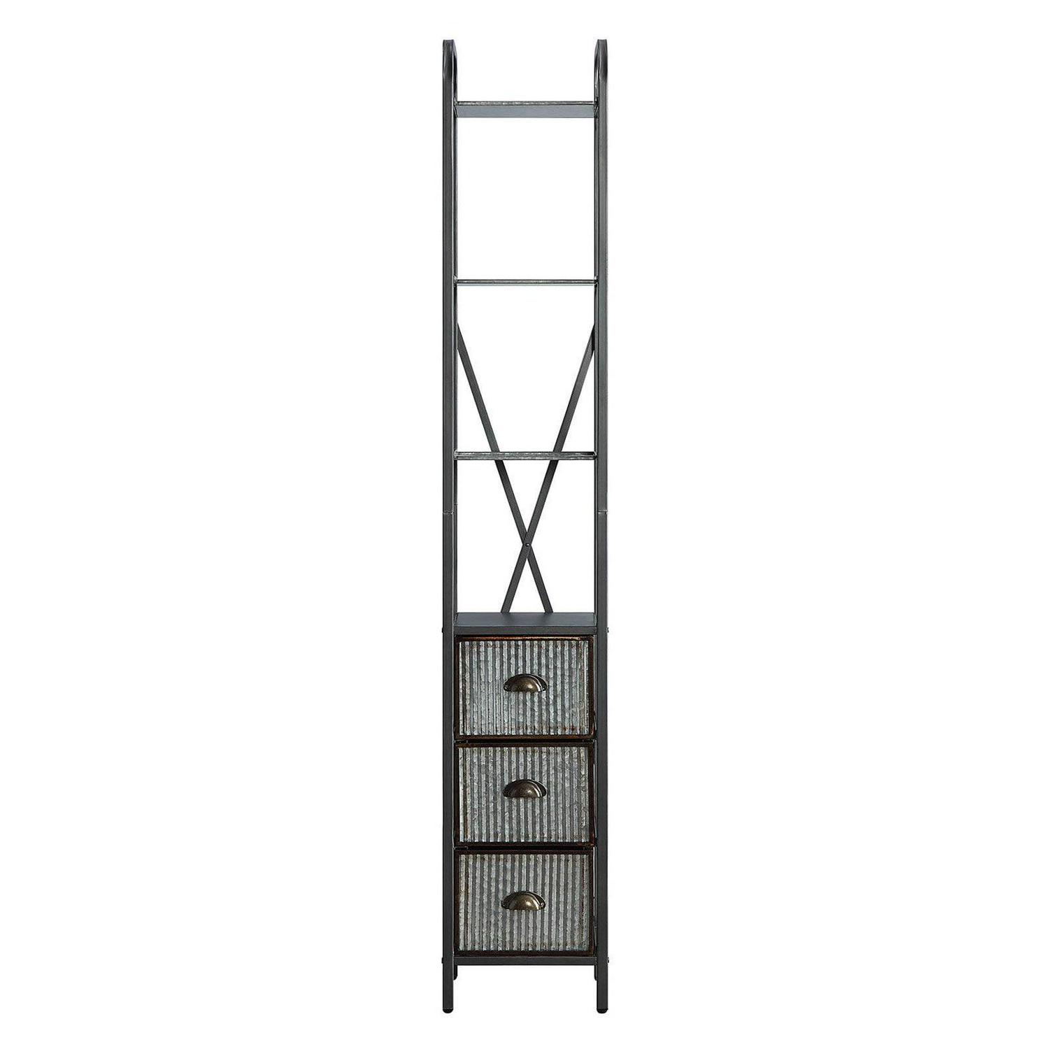 What a great storage unit for any room in the home! This storage tower has a total of two fixed shelves of which are galvanized metal, to retain a more industrial look. The unit also has three corrugated metal drawers are easy to pull out for that additional storage for any of your nick knacks. The storage tower fits nicely in any bedroom, kitchen, bathroom or any room in the home where added storage is needed! With hand crafted rounded uprights it gives this space saver the soft designer look you that you would find in the many designer stores. The metal is finished with a powder coated system that makes it resistant to many of the harsh elements in the bathroom. The scissor metal back adds additional strength to this space saver and makes it a great fit for your bathroom. Constructed of metal. Clean with a dry non abrasive cloth. Assembly required