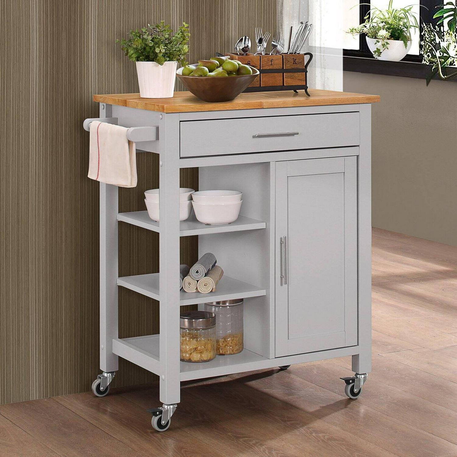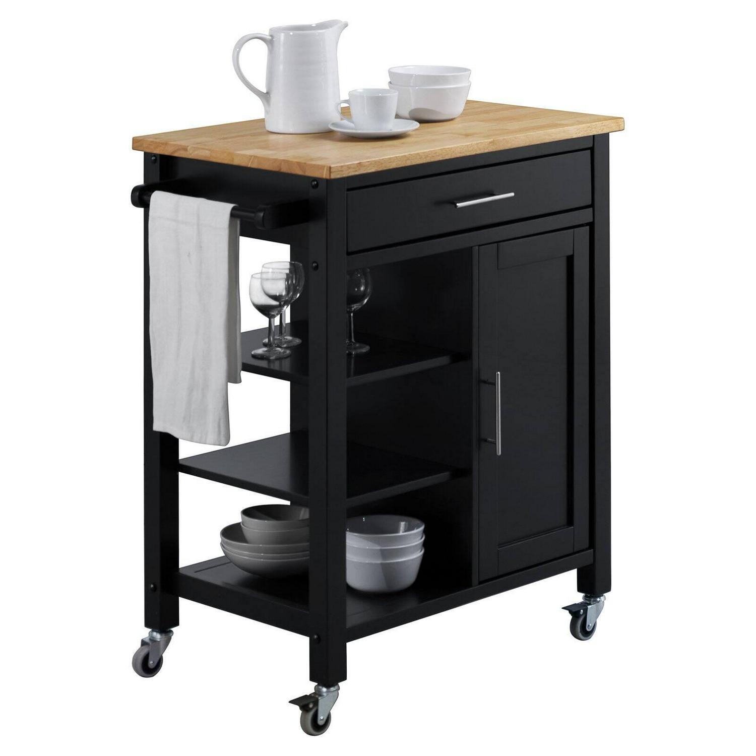 This elegant mobile cart instantly expands the work and serving surface area in your home. Crafted from solid wood and veneers, the unit is finished in black with a natural finished top. This versatile cart rests on four industrial-grade casters for great mobility that allows it to be rolled into any room when needed for serving or additional work surface. The casters can be locked making it easier to work and serve off the cart. The large drawer can be used to store your kitchen utensils and cooking items. The richly framed door, with a sleek silver handle, opens up to 1 fixed shelf that can be used to store pans, dishes or other kitchen items. Every home can use this elegant cart to increase functionality in the kitchen. Comes ready to assemble. Clean with a dry cloth.