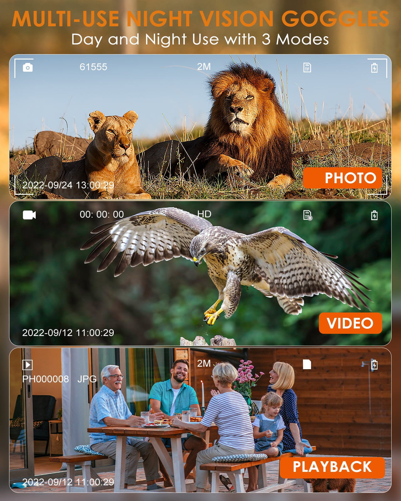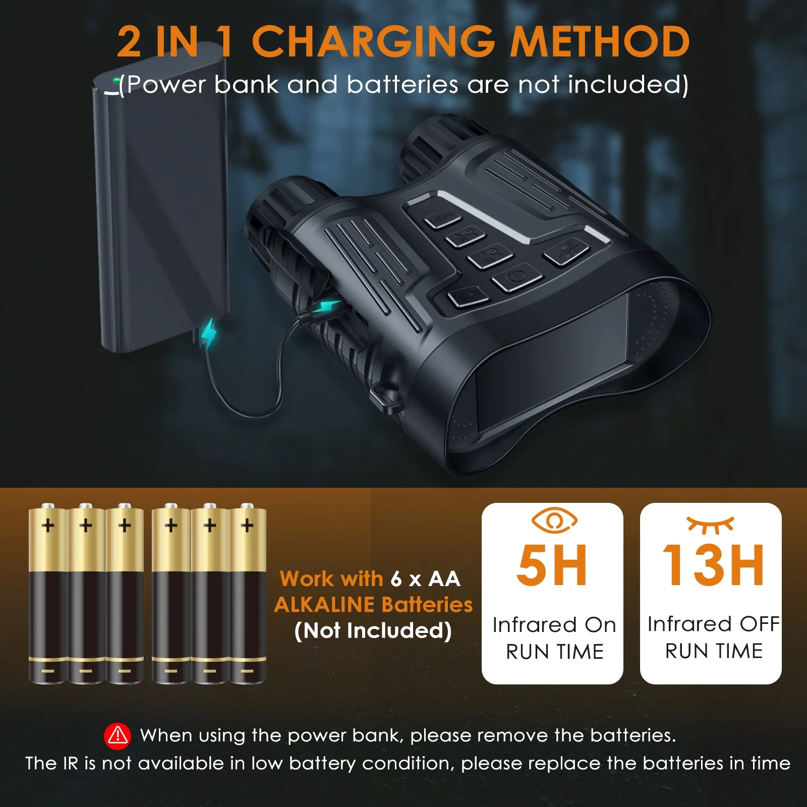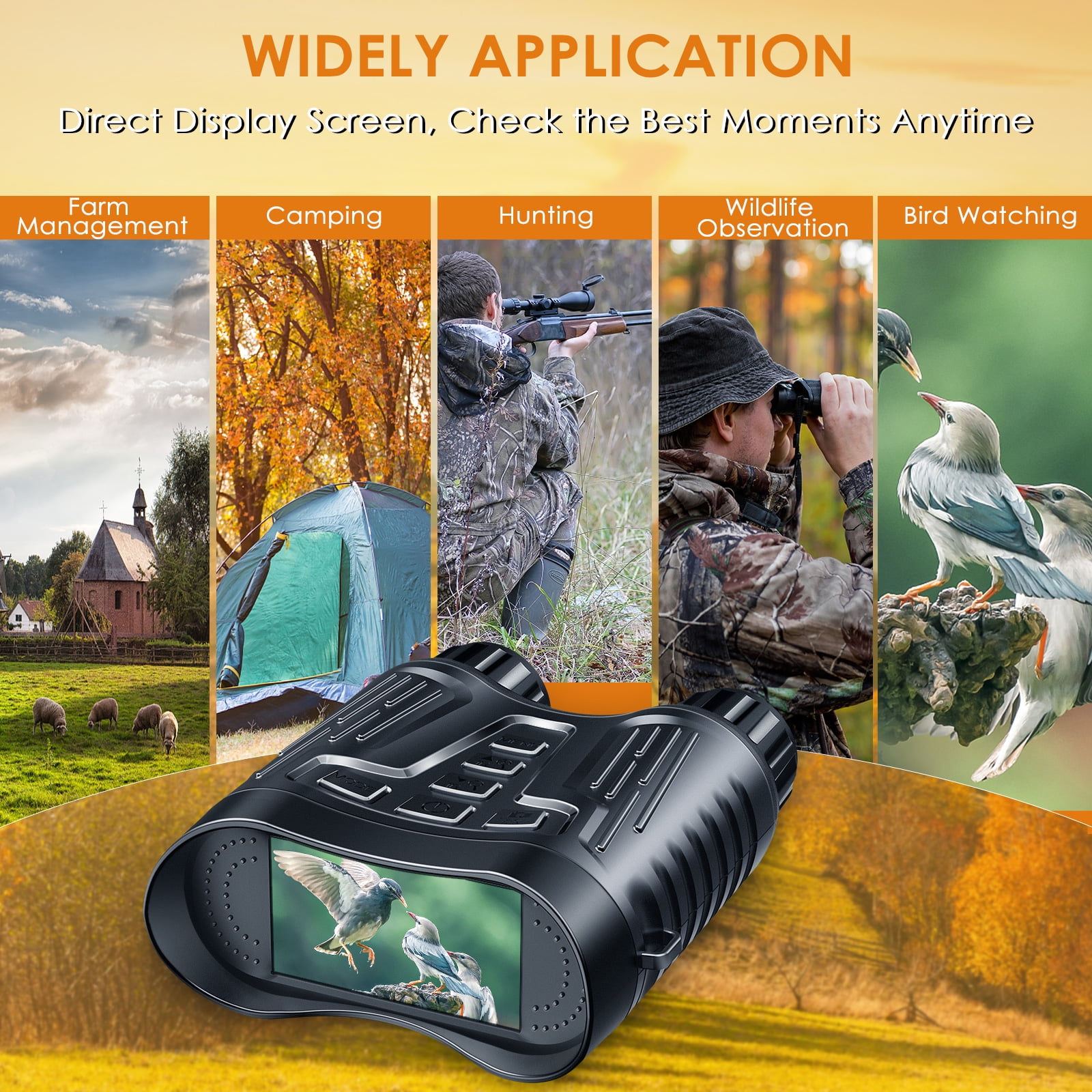 【Conquer the Darkness】Experience unparalleled night vision capabilities with 2023’s newest 4K night vision goggles, which feature 3.2” LCD screen, 8X digital Zoom, 7 IR illuminator levels, 2600mAh rechargeable lithium battery and IP54 waterproof design, support 36MP photos and 4K video recording, a must-have for outdoor enthusiasts, hunters, or security professionals. 【4K Night Vision Binoculars】Capture the world with night vision goggles, capable of recording UHD 4K videos with sound and snapping sharp 36MP images in the daytime, low light or nighttime, also support playback function. With 8X digital zoom and 7 IR illuminator levels, these night vision binocular offers superior visibility and clarity. 【Up to 13H with Rechargeable Lithium Battery】The infrared night vision goggles are built in 2600mAh rechargeable lithium battery, allows you to run for up to 6 hours under IR and up to 13 hours without IR. The Type C charging outlet is compatible with most power banks, ensuring extended usage time and eliminating tedious battery replacement requirements. 【IP54 Water-Resistant & Tripod Supported】 The night vision binoculars with IP54 waterproof and rugged design can withstand extreme weather conditions and challenging terrain, easily capturing views even in light fog or light rain. It also supports a 1/4 “tripod, free your hands and store your adventures on the included 32GB memory card. 【3.2” Large HD Screen & 1000ft Viewing Range】Thanks to the 3.2” TFT LCD screen and fully multi-coated 25mm objective lens, the night vision goggles offer you better views. Boasting a visual range of up to 1000ft, you’ll never miss a detail. Also support connecting to the PC via USB cable, great for hunting, camping, wildlife observation. 【Perfect Gift for Outdoormen】. If you encounter any issues, please don’t hesitate to reach our 24/7 professional customer team for assistance. We are always here to help you. What you get: 1 x night vision binoculars, 1 x neck strap, 1 x 32GB TF card, 1 x USB Cable, 1 x Cleaning Cloth, and 1 x User Manual.
