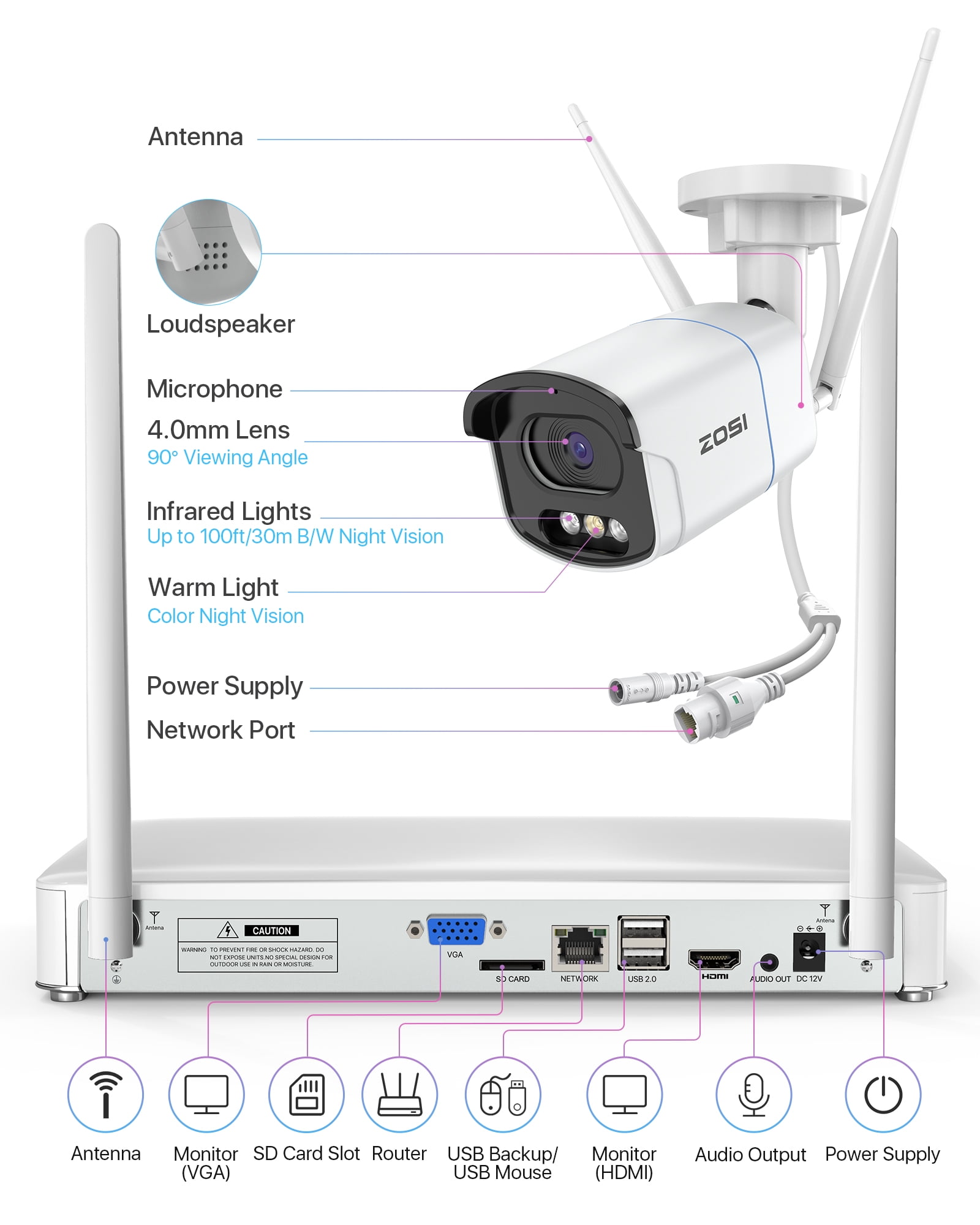 Note: Please make sure NVR is connected to your router by Ethernet cable. 4 MP security camera system with audio, ZOSI 4 MP wireless WiFi outdoor security camera, H.265+ 8CH NVR 2 TB HDD, color night vision, AI human/vehicle detection. Equipped with a high-resolution 2.5K/4 MP lens, the ZOSI 8CH wireless Wifi security camera system captures crystal-clear footage, allowing you to monitor your property with exceptional clarity. The two-way audio feature enables seamless communication, letting you interact with visitors or deter potential intruders. This ZOSI wireless wifi security camera system ensures uninterrupted surveillance. The color night vision capability ensures clear visibility even in low-light conditions, keeping your property secure day and night. There are 4 recording modes: 24/7 recording, motion detection recording, schedule recording and recycle recording.