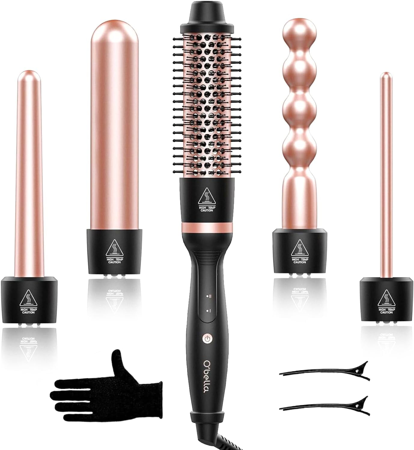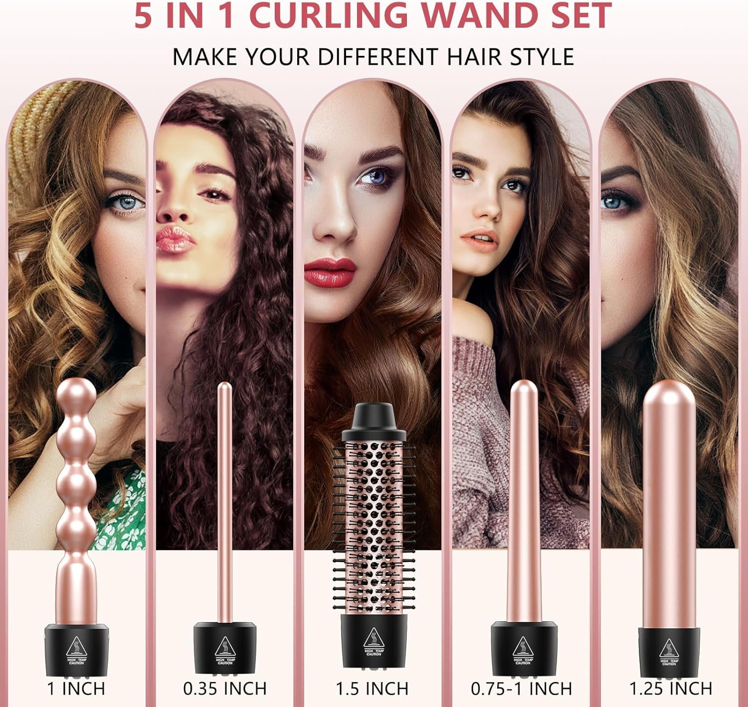 Curling Iron Set,5 in 1 Curling Wand Set with Thermal Brush&4 Interchangeable Ceramic Curling Wand(0.35”-1.25”), 2 Temps Instantly Heating Hair Wand Curler