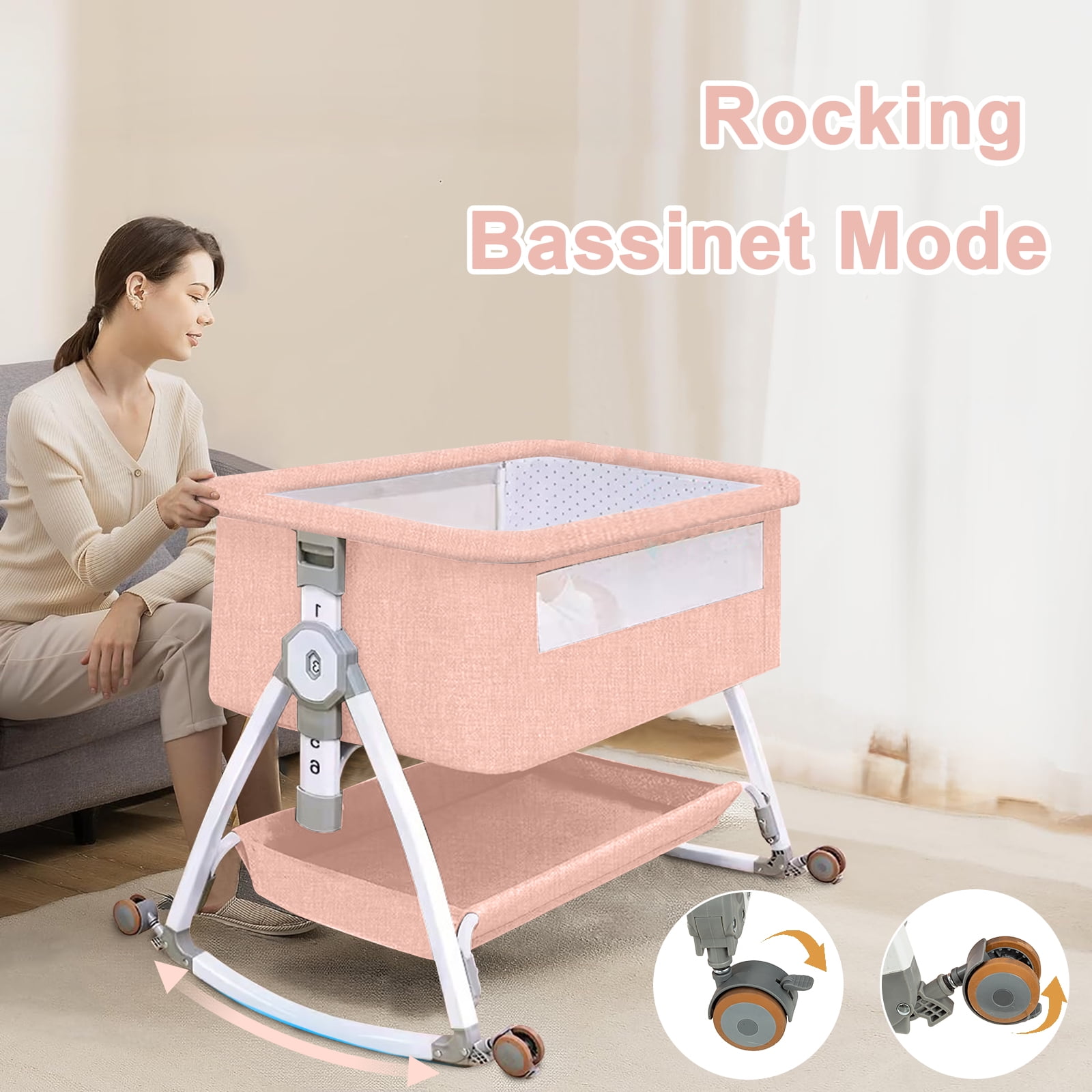 The RICHYOUNG 4 in 1 Baby Bassinet Bedside Sleeper – your ultimate ally in caring for your baby at night. At night, you can adjust the height of the baby cribs on clearance to match your bed, convert it into a changing table, bassinet or add a mosquito net. The side of the baby girl bassinet can be zipped up and attached to the bed so you can easily rock your baby. The foldable design of this portable bassinet allows you to use it in any room in your home and outdoors. Simply turn the universal wheels and the baby bassinet clearance can be used as a changing table or a portable bassinet. Detachable mosquito nets can protect babies from mosquito bites. Our bedside crib make parents share a room with their children in different beds but also provides a convenient way for mothers to care for their babies at night. This pink baby crib with wheels is unisex and perfect for newborn babies. Bassinet with changing table for Baby enable you to care your baby next to your bed for feeding, changing the diaper, and playing with your baby.