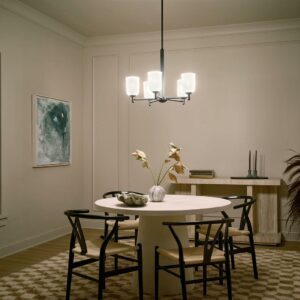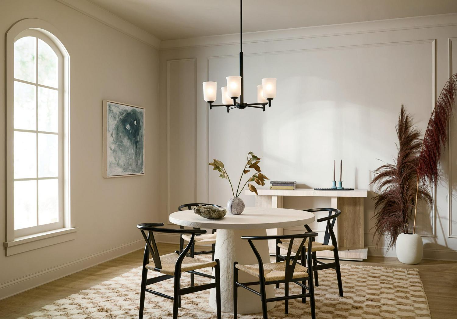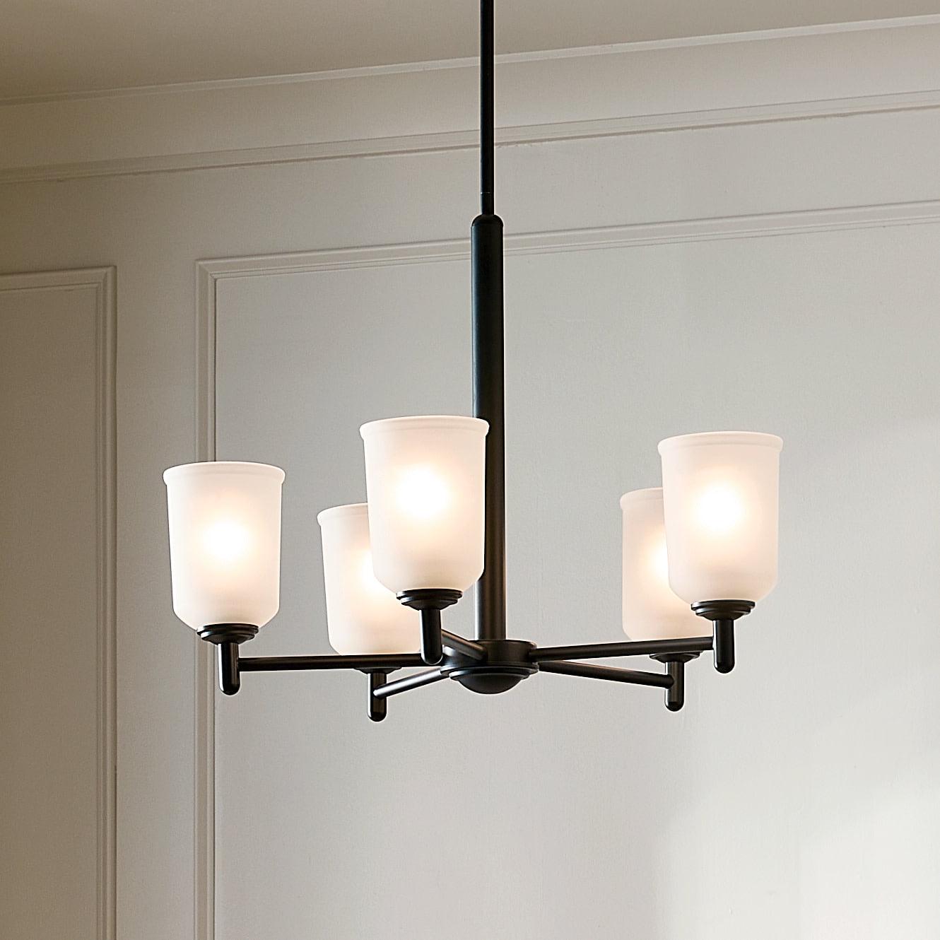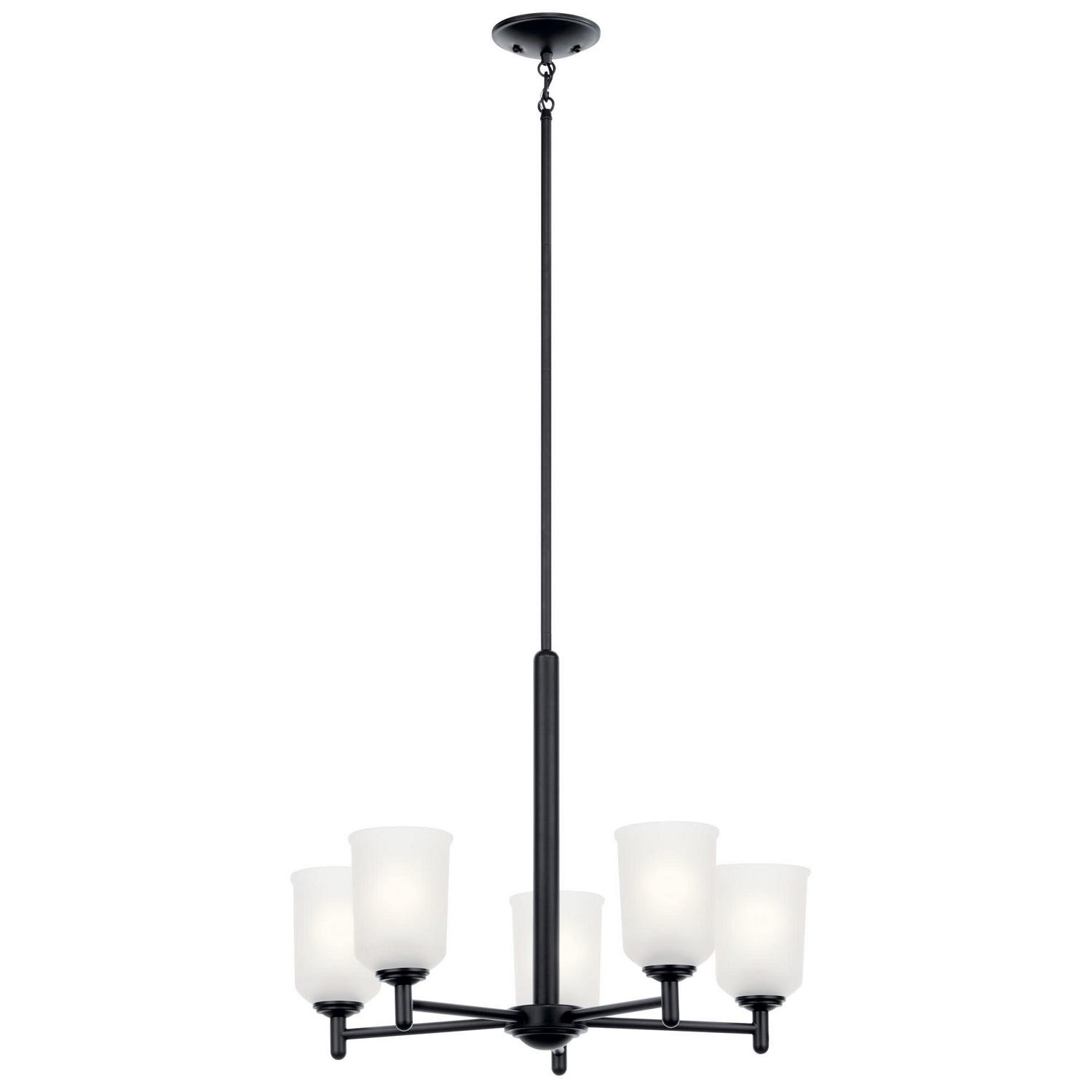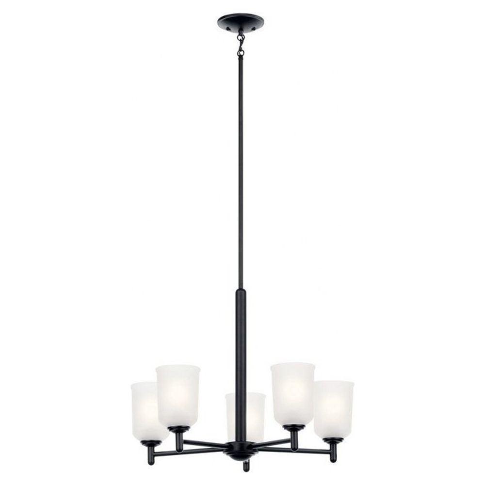 Kichler Lighting-43671BK-Collection: Shailene, Material: Steel, Finish Color: Black, Width: 23.5″, Height: 18.25″, Chain Length: 36″, Lamping Type: Incandescent, Number Of Bulbs: 5, Wattage: 100 Watts, Dimmable: No, Moisture Rating: Dry Rated, Desc: The straight lines and up-sized satin etched glass of this Brushed Nickel 5 light chandelier from the Shailene Collection create the perfect casual look for the updated urban lifestyle. Sloped Ceiling Adaptable: Yes / Chain Length: 36.00. ,-Shailene – 5 light Medium Chandelier – 23.5 inches wide-Black Finish -Traditional Installation