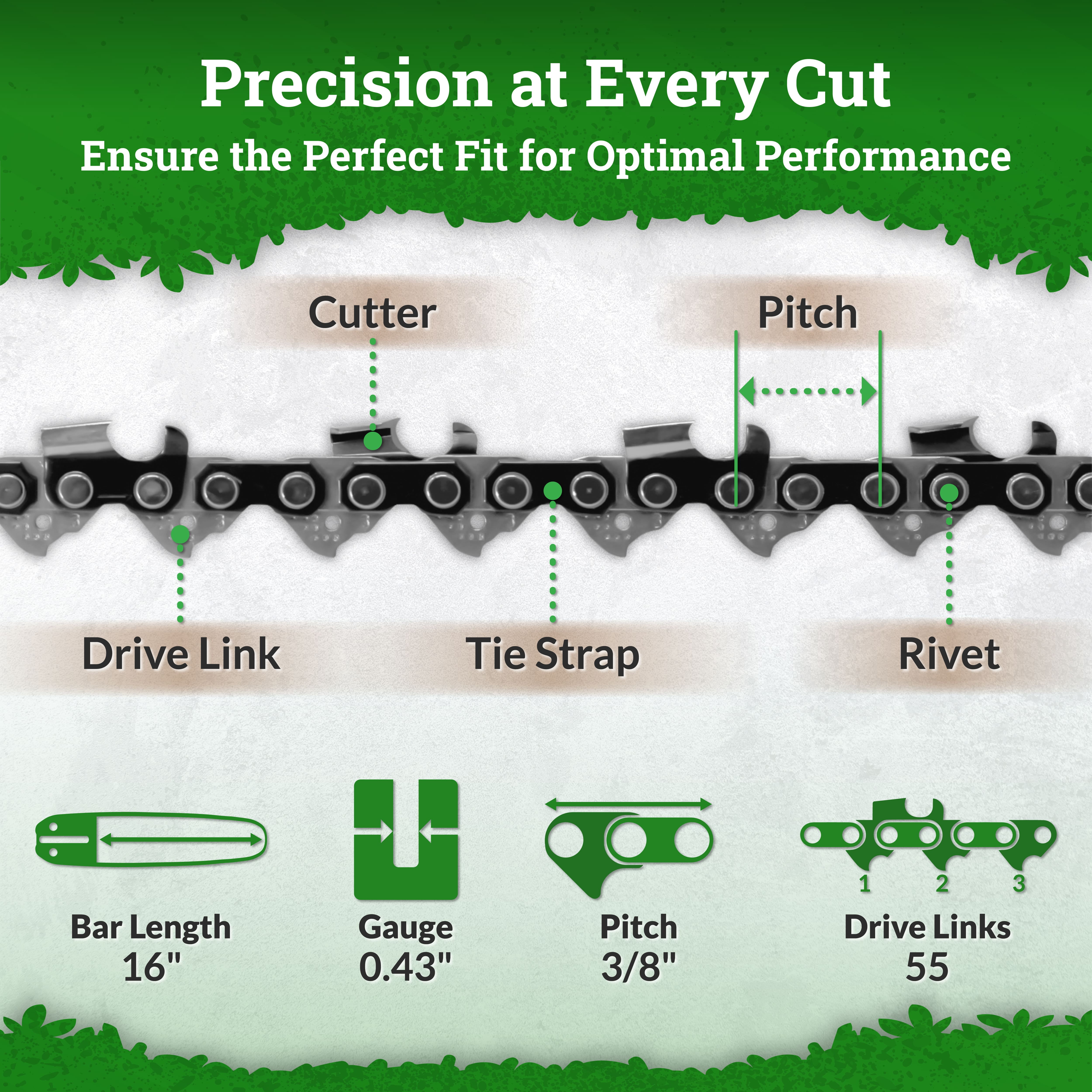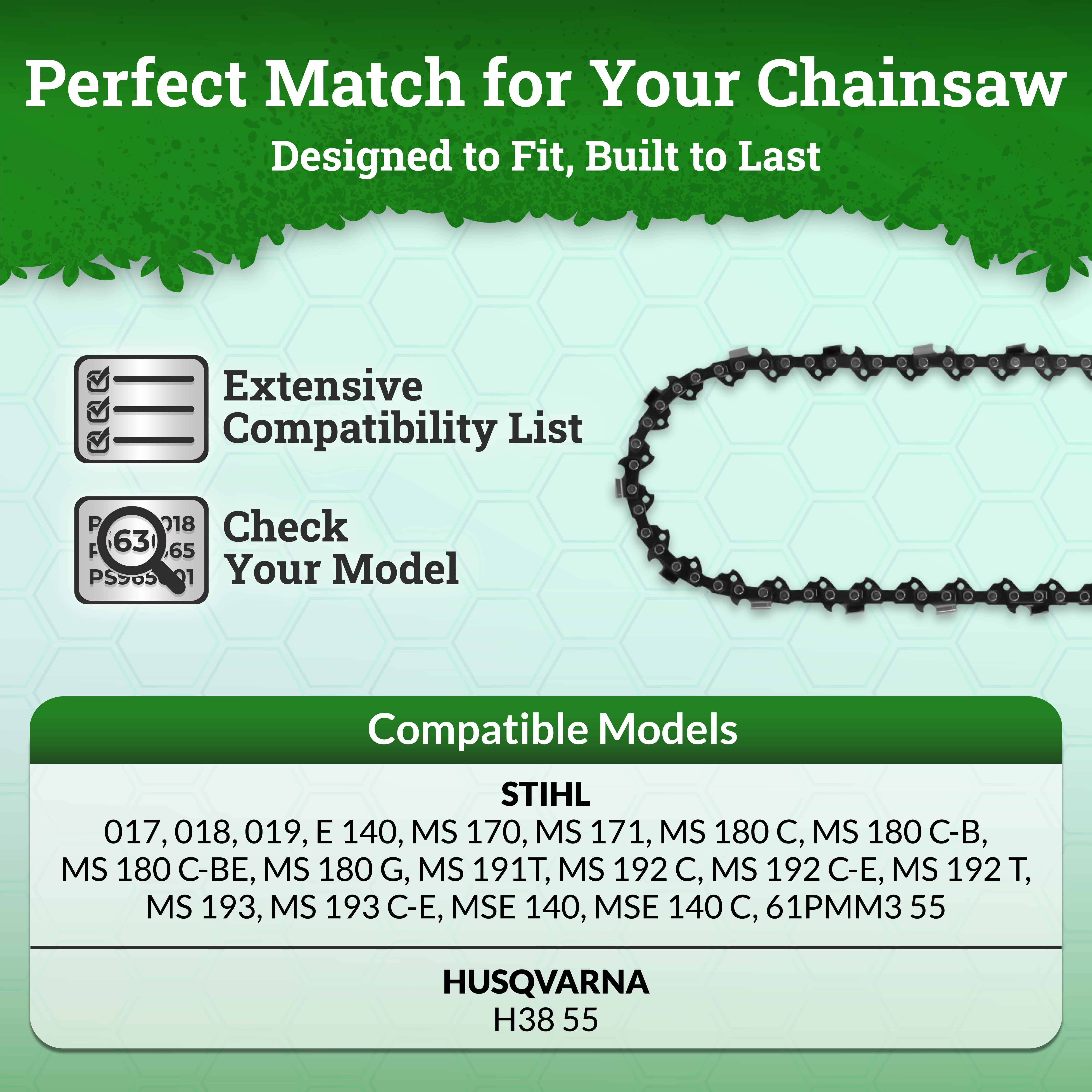 UpStart Components 16-Inch Chainsaw Chain Replacement for Stihl chainsaw chain 16 inch – R55 (16 inch Length, 3/8″ Low Profile Pitch, .043″ Gauge, 55 Drive Links); Quantity: 5 Fits like a dream: Engineered for flawless compatibility, this 16 chainsaw chain features the perfect specifications (3/8″ low profile pitch, 0.043″ gauge, 55 drive links) to optimize your MS 170’s performance. Powerhouse of precision: Experience clean, efficient cuts with this premium chain. Whether you’re a seasoned pro or a weekend warrior, tackle trimming and cutting jobs with confidence. Savings that slash: Get the job done without burning a hole in your wallet. This 5-pack offers a cost-effective alternative to OEM parts, delivering exceptional performance at a fraction of the price. Built to last, built to impress: Constructed with high-grade materials, these chains are built to endure. Keep your MS170 running smoothly and efficiently for years to come. Please Note: The same saw can have different bar lengths so ensure you confirm the pitch, gauge, & drive links on your current bar. Not all bars take the same amount of links. Compatibility List: Stihl 017 Stihl 018 Stihl 019 Stihl E 140 Stihl MS 170 Stihl MS 171 Stihl MS 180 C Stihl MS 180 C-B Stihl MS 180 C-BE Stihl MS 180 G Stihl MS 191T Stihl MS 192 C Stihl MS 192 C-E Stihl MS 192 T Stihl MS 193 Stihl MS 193 C-E Stihl MSE 140 Stihl MSE 140 C Stihl 61PMM3 55 Husqvarna H38 55