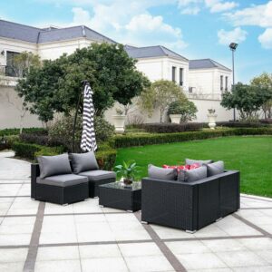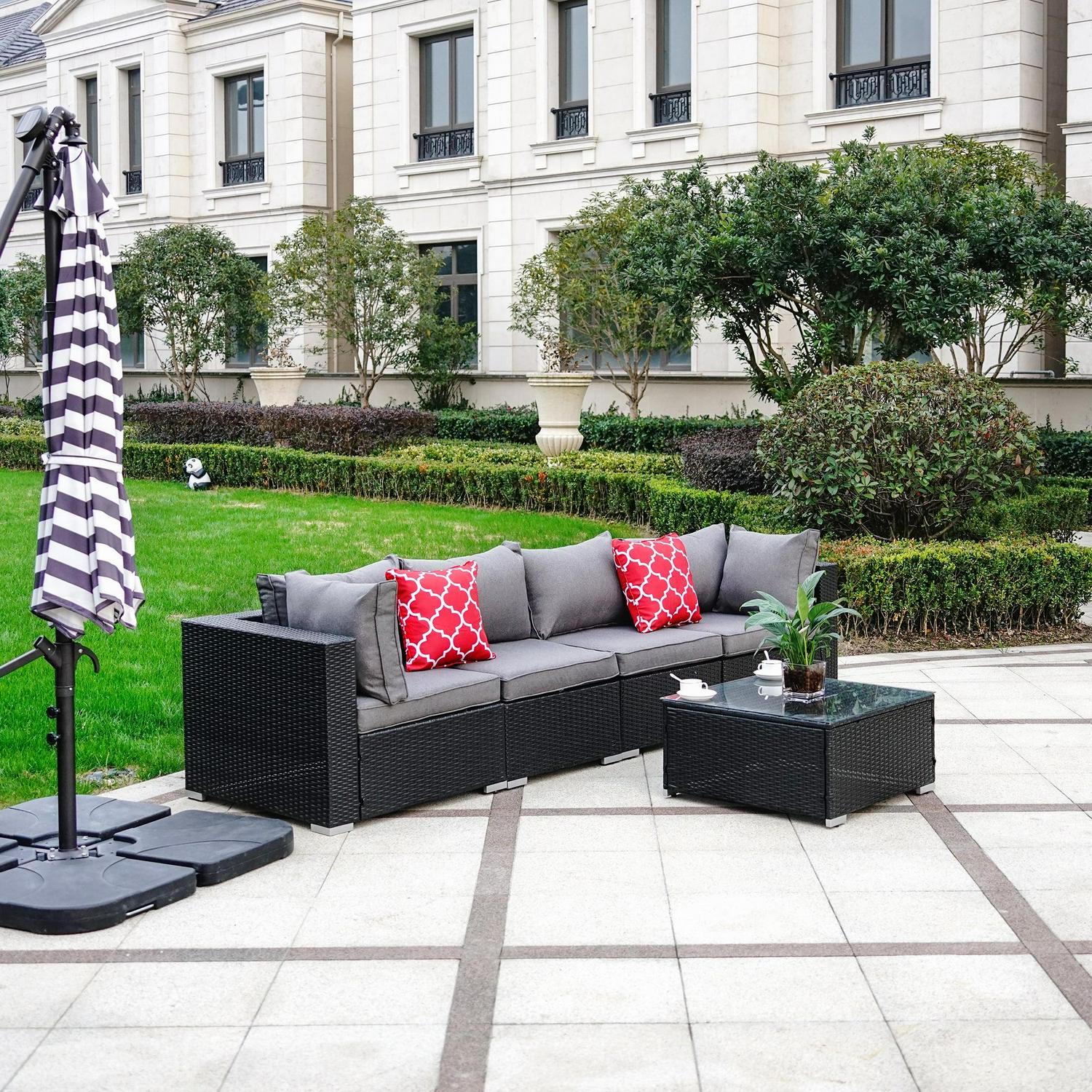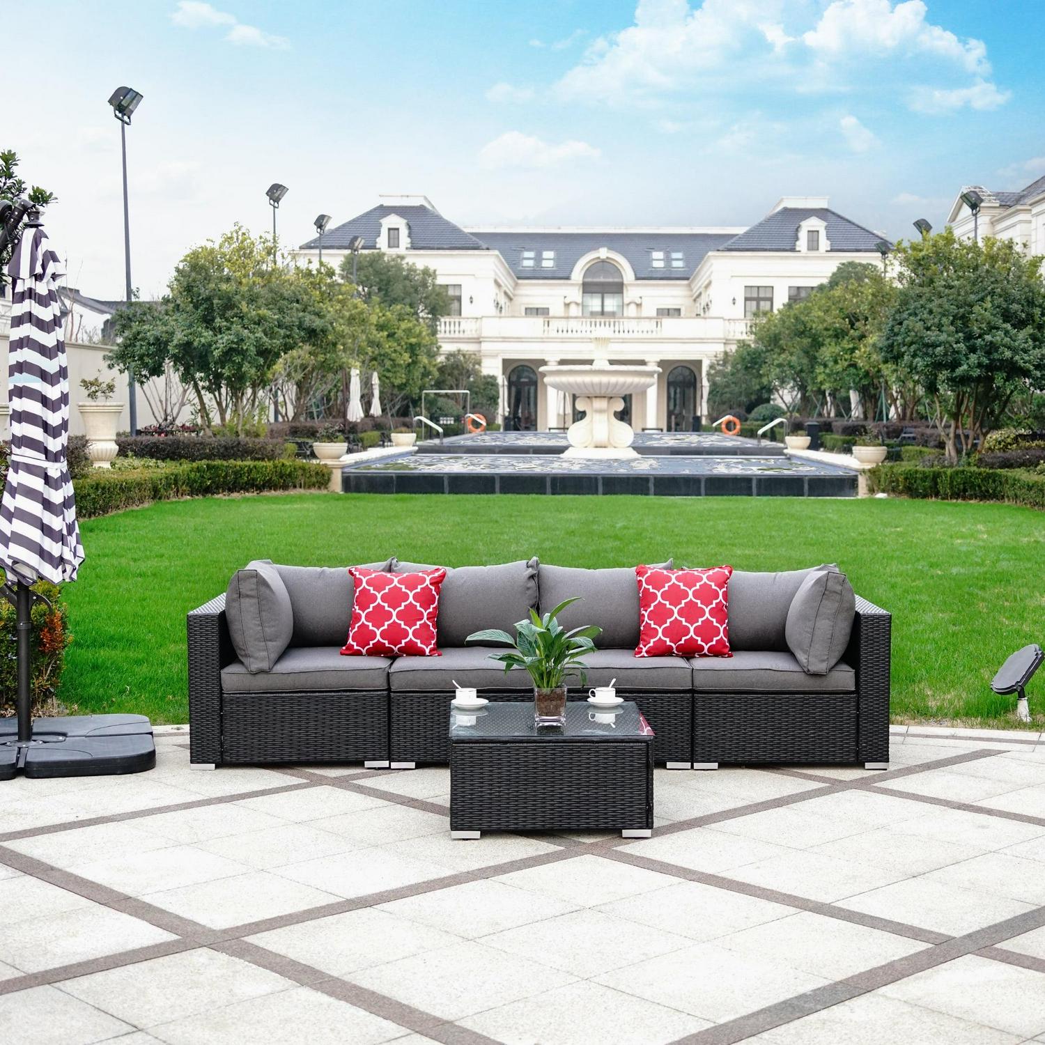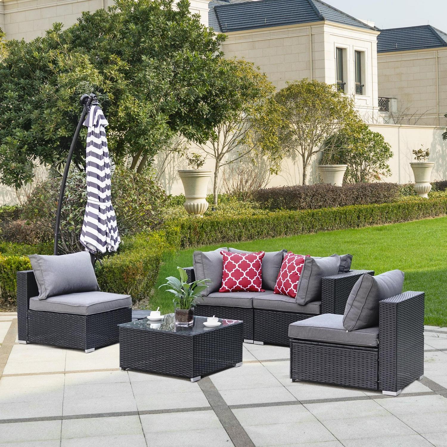 5-Piece Outdoor Patio Rattan Wicker Sofa Conversation Set with Coffee Table and Cushions, Espresso/Gray