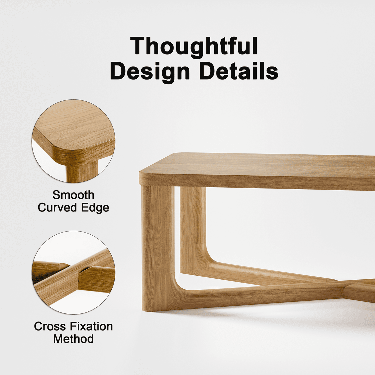 Stable Structure:This coffee table adopts an L+X-shaped integrated structure.This design greatly enhances stability. Easy to Clean:This coffee table is made of solid wood and has a smooth surface,so it is very easy to clean. Comfortable Touch:This coffee table is made of solid wood, which has a gentle texture and soft touch.