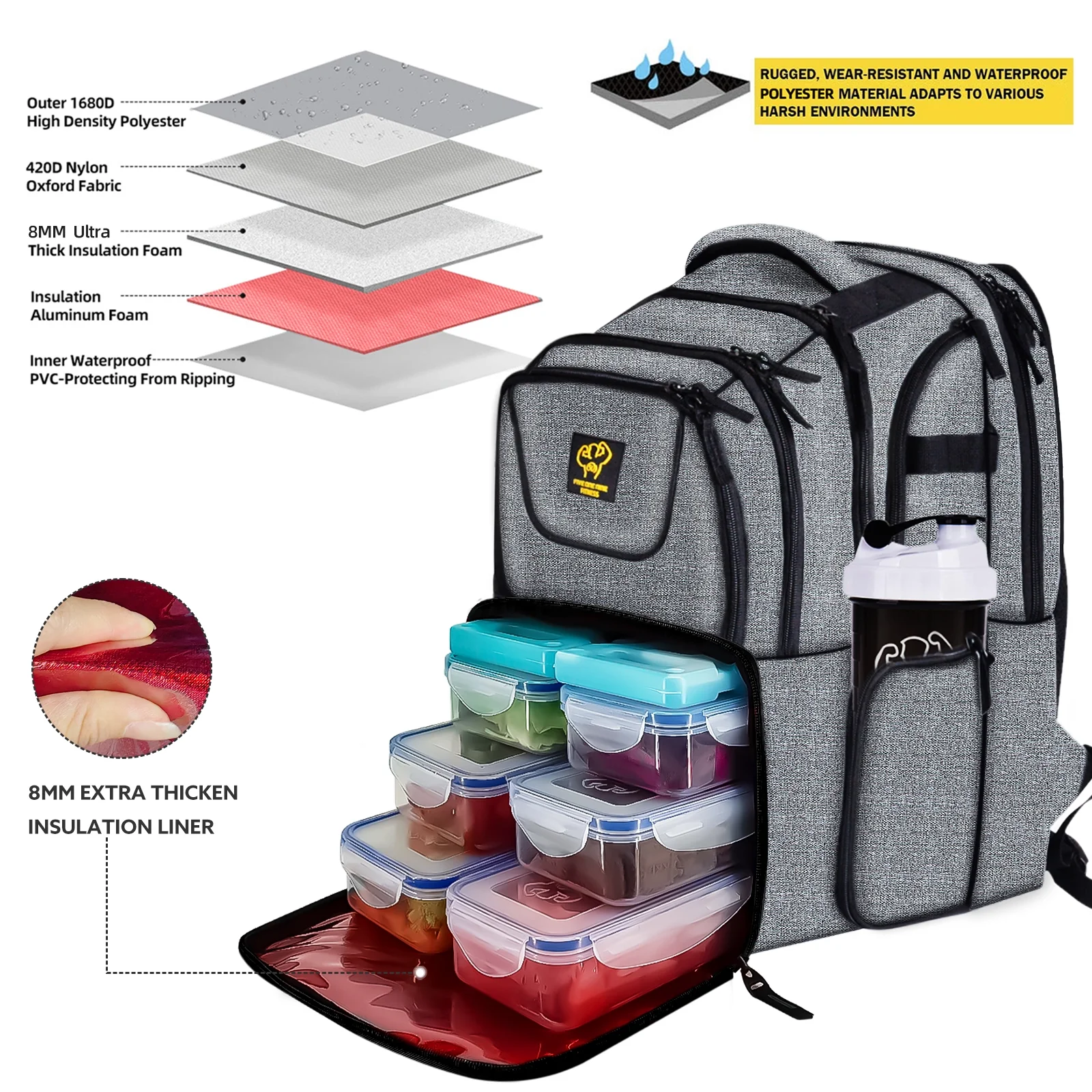 519 Fitness Meal Prep Backpack, 6 Meal Insulated Bodybuilding Lunch Rucksack with Computer Compartment for Men and Women to Hiking/Picnic, Grey