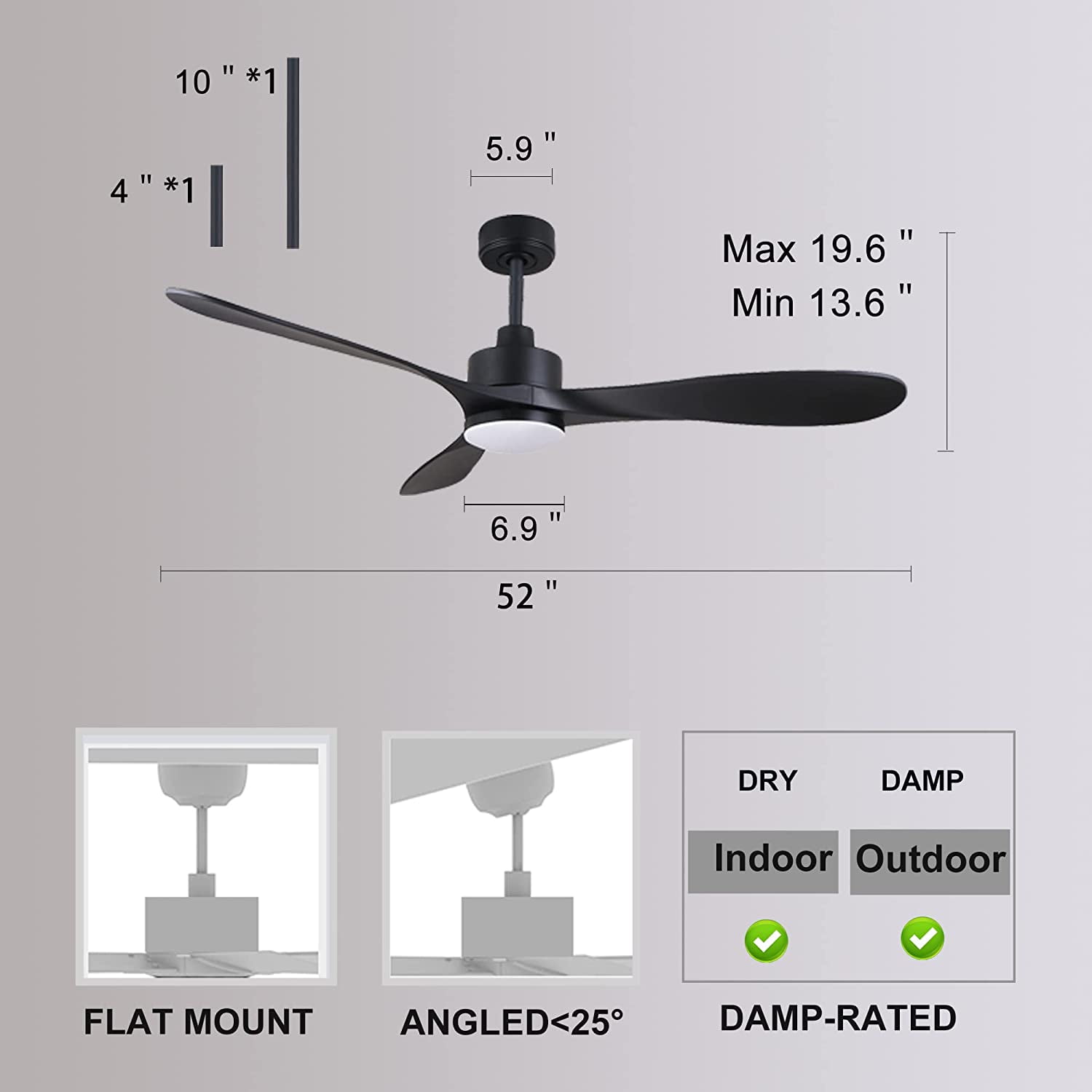 【Voice &APP &Remote Control】 Ceiling fan with light remote control(handheld and wall mounted), still in control when WiFi doesn’t work. Smart ceiling fan works with Alexa, Google Assistant and App, you can control with voice “Alexa, turn on black bedroom ceiling fan” or App from anywhere. 【Quiet Powerful Reversible DC Motor】 6-speeds modern ceiling fan delivers powerful airflow up to 7260 CFM. Silent dc indoor outdoor ceiling fan keep room cool under 30dB, no hum and no wobble, 75% more energy-efficient. Reverse allows summer downdraft mode and winter updraft mode. 【Indoor and Outdoor Dual Mount】 Damp-rated smart ceiling fan suits for indoor and outdoor area. Modern indoor ceiling fan for bedroom, living room, kitchen, garage, office. Outdoor ceiling fans for patios, porch, gazebo. Height adjustable with 4” and 10” rod, for low/high profile, flush/angled mounting. 【Bright 3-color LED Light】 Modern ceiling fan with 3-color led light (3000K warm yellow light, 4000K bright daylight, 6000K cool white light), create desired atmosphere for working, leisure, party. Lighting & ceiling fan with bright eye protection light of 1800 lumen, longer lifespan of over 5000+ hours. 【8 Timers Quality Modern Design】 52 Inch modern black ceiling fan with lights and remote control, made of strong and durable materials, add beauty as home decor. With delay auto-off timer in 0-8 hours, lighting & ceiling fans bring you sound sleep.