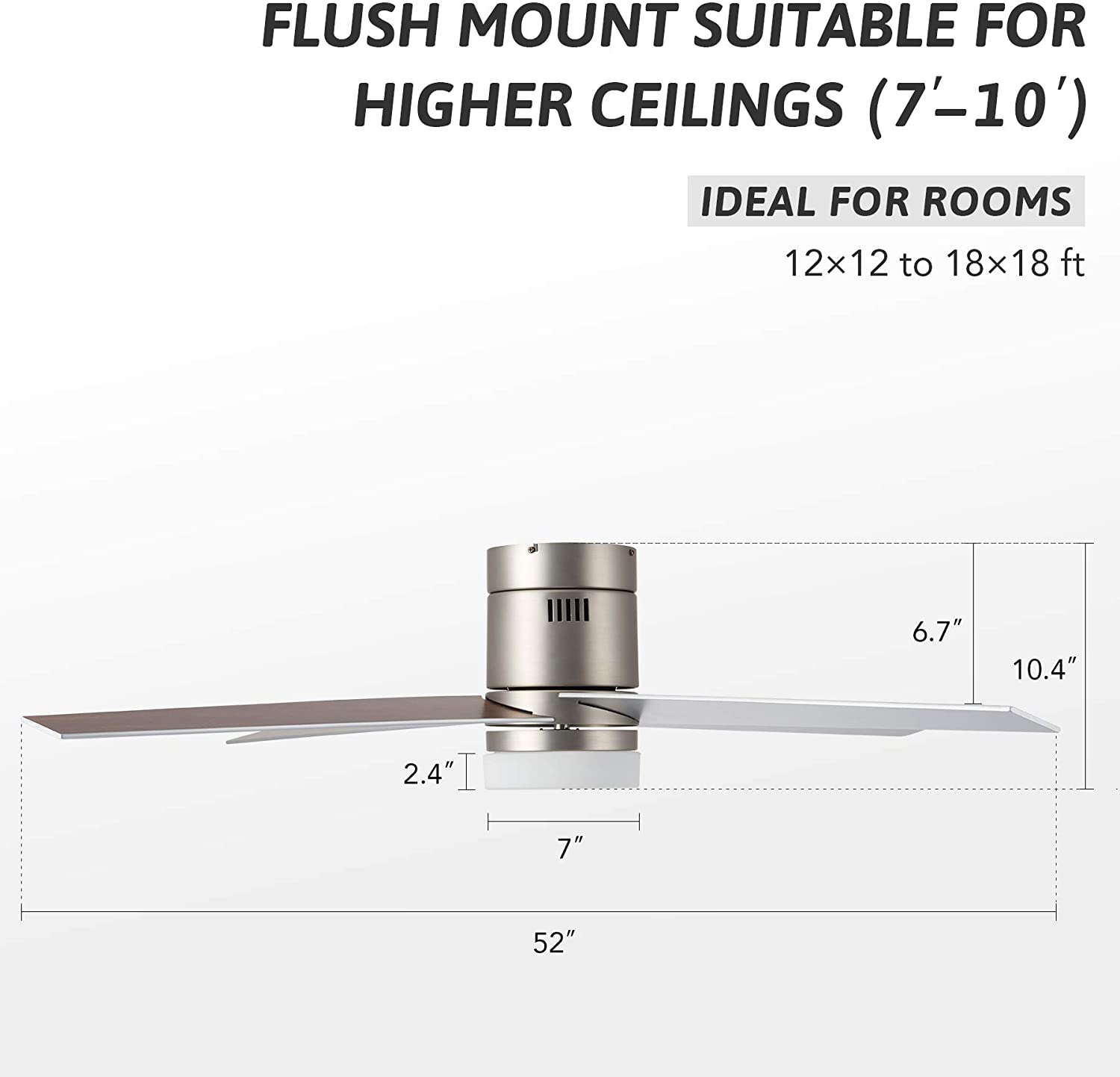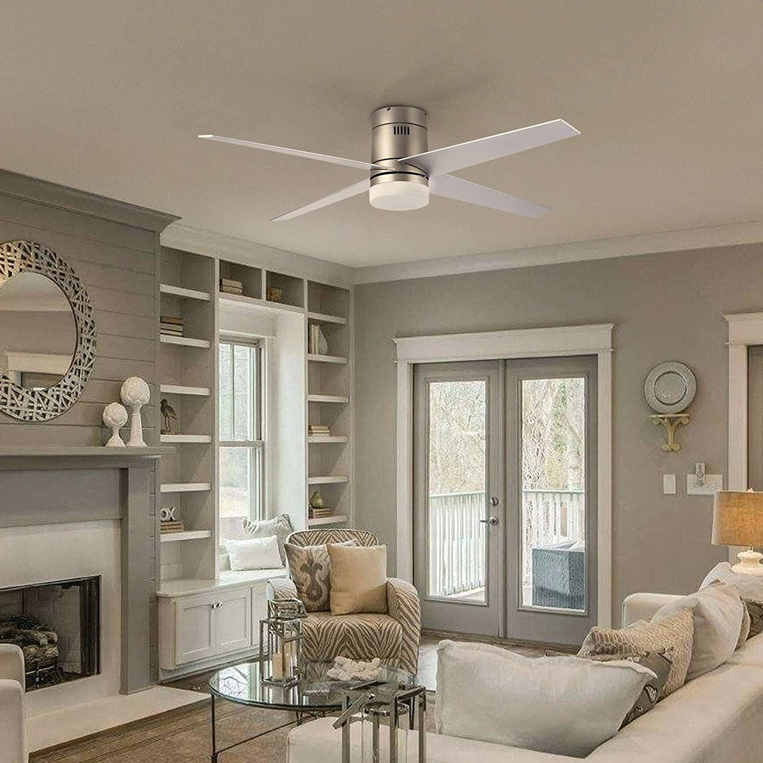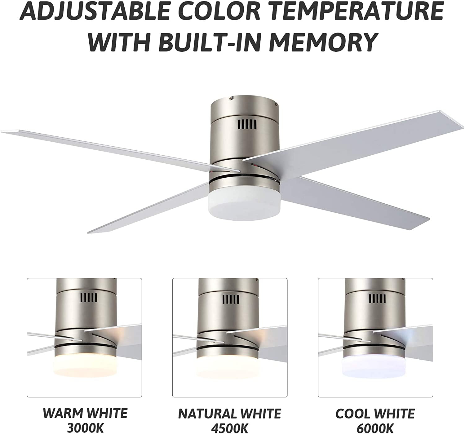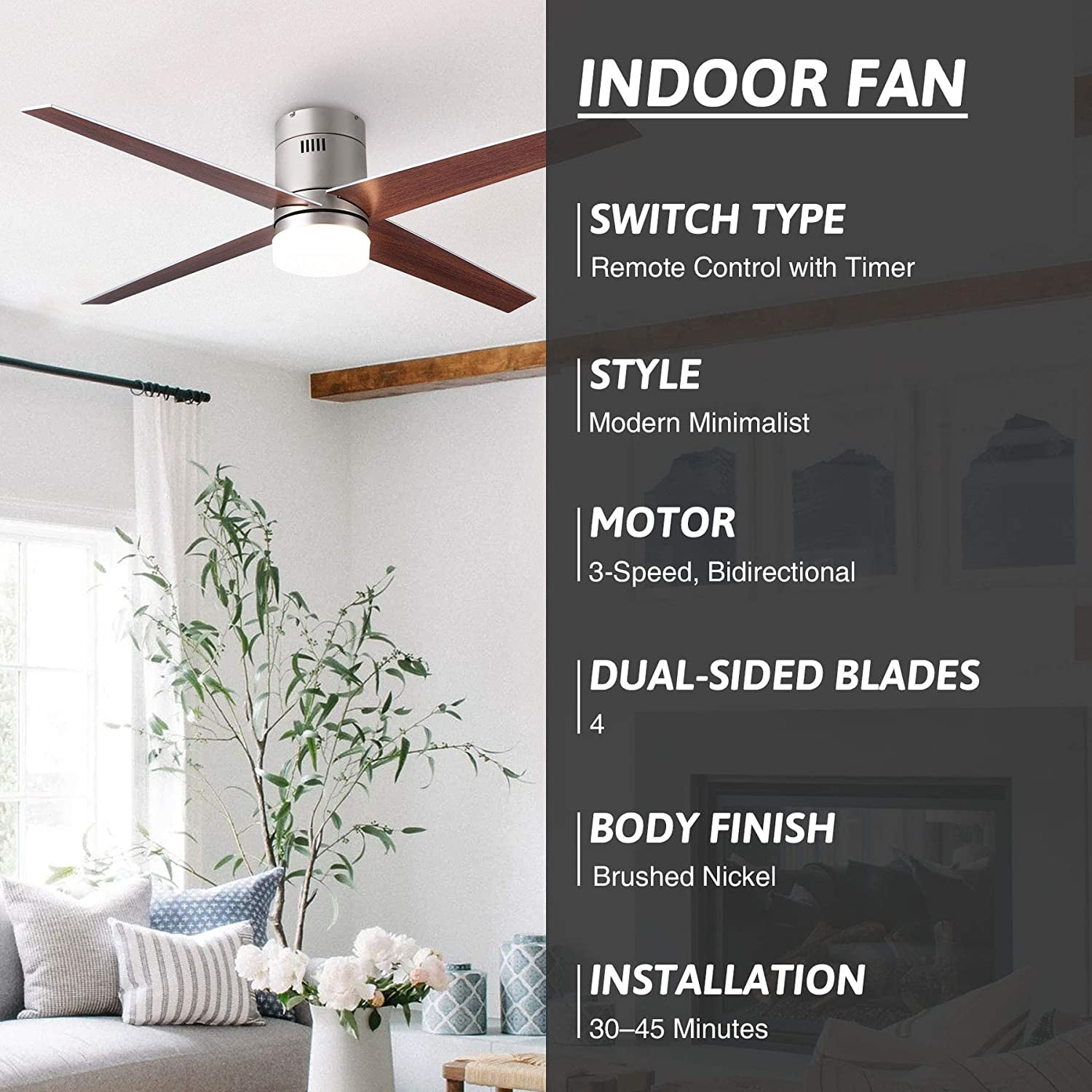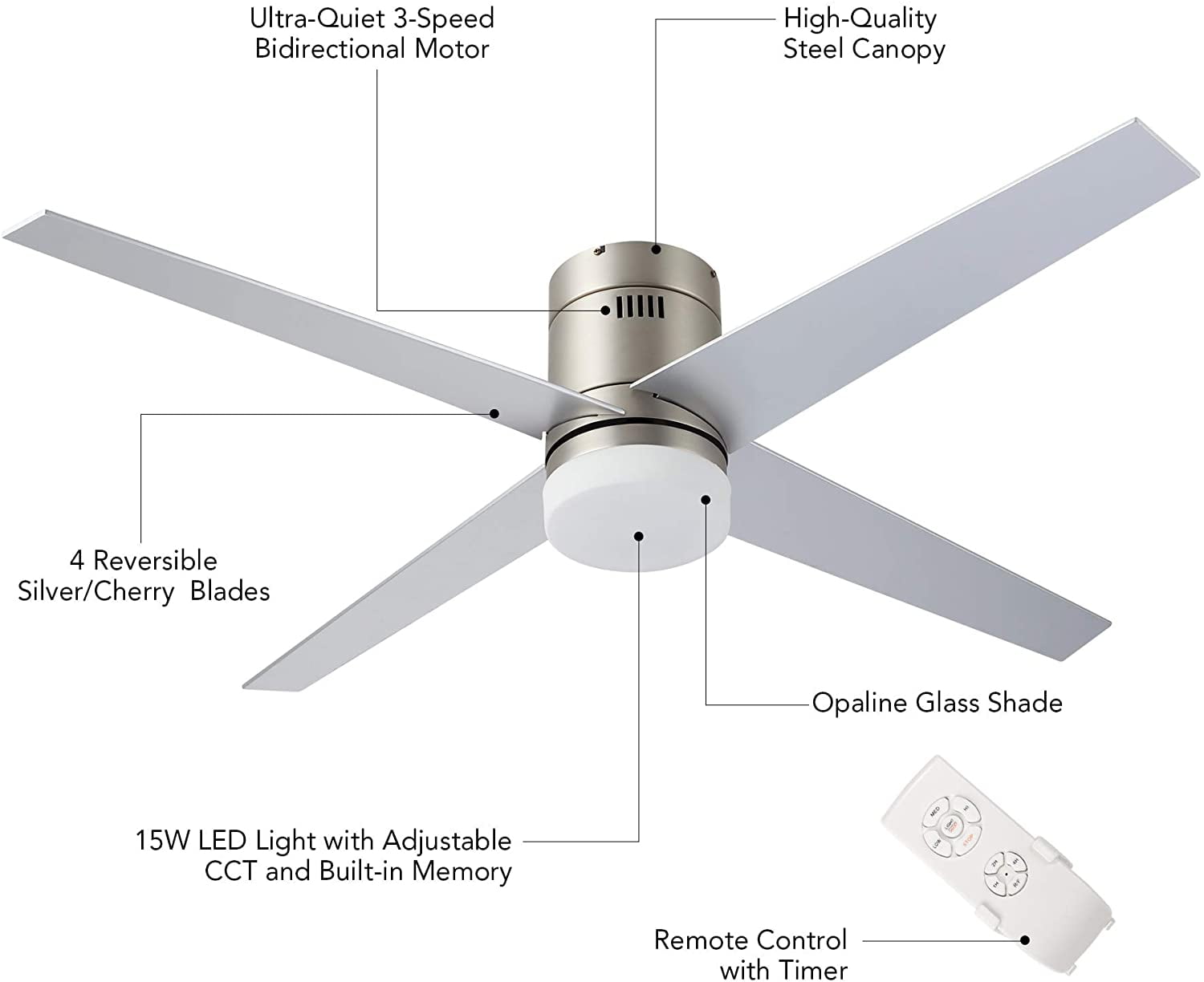 MODERN CEILING FAN: This 52″ ceiling fan with LED light kit offers modern style that brightens spaces both large and small, combining 4 reversible cherry or silver finished blades with an opaline white shade to complement any home decor from farmhouse to contemporary YEAR-ROUND COMFORT: Our indoor ceiling fan’s strong yet silent 55W bidirectional motor offers excellent circulation all year round—counterclockwise to cool you in summer and clockwise to evenly distribute warm air in winter 3 COLOR TEMPERATURES: The integrated 15W LED light comes with 3 color temperatures (3000K/4500K/6000K) for customized lighting, while the built-in memory saves your lighting choice for the next time you turn it on 3 SPEEDS & AUTO SHUTOFF: The intuitive remote control switches between 3 fan speeds and sets automatic shutoff time after 1, 2, or 4 hours for energy-efficient use DURABLE CONSTRUCTION: This low profile ceiling fan’s metal body and solid plywood blades ensure dependable lasting performance; the sturdy canopy holds the fan tightly in place for optimal stability even on the highest speed Description: Get things flowing with this chic and modern home ceiling fan with integrated LED lighting! A fan for all seasons and styles, this fashionable flush mount ceiling fan with underlighting has an attractive nickel finish that blends well with styles from mid-century modern to contemporary. The 4 reversible blades with a 52 inch blade span provide excellent reversible circulation to help cool you down in the summer and distribute heat in the winter. The 55W motor provides 3 speeds of powerful yet quiet rotation that are easily set by the included remote control. This fandelier’s timer function automatically shuts off the fan after 1, 2, or 4 hours, ensuring optimal energy-saving efficiency; while the built-in 15W LED light with opaline white shade offers 3 color temperatures to suit your mood, whether a gentle and soothing 3000K, a warm and inviting 4500K, or a bright and vivid 6000K. Perfect for any space, from intimate kitchens and bedrooms to expansive living rooms and dining rooms, this ceiling lighting and fan fixture is sure to offer you lifelong comfort and style! Specifications: Specifications Material: Plywood, Steel, Silicon Steel, Glass Body Finish: Nickel Blade Finish: Cherry, Silver Overall Dimensions: 52 x 10.4 in. (130×43 cm) Blade Area: 23.6 x 5.5 in. (60x14cm) Canopy Diameter: 7 x 2.4 in. (18×6 cm) Distance between Ceiling and Blade: 6.7 in. (17 cm) Lead Wire Length: 27.5 in. (70 cm) Motor Power: 55W Light Wattage: 15W Color Temperatures: 3000K/4500K/6000K Fan Rotation: Clockwise & Counterclockwise Timer Settings: 1/2/4 hr. Compatible Ceilings: Flat Max. Recomm. Room Size: 16.4 x 16.4 ft. (5×5 m) Net Weight: 14.3 lb. (6.5 kg) Package List 1 x Ceiling Fan 1 x LED Light Kit 1 x Remote Control 1 x Instructions