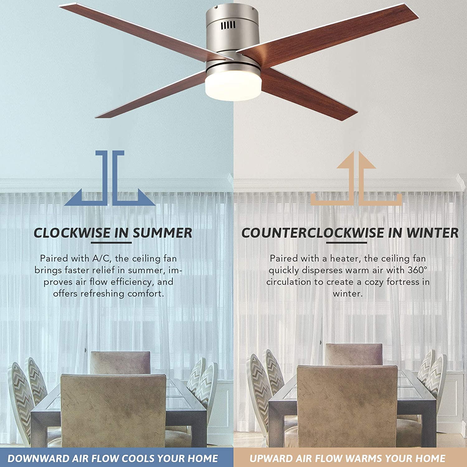 Customize your home decor with a choice of silver or cherry finish blades Reversible 55W motor keeps you cool in summer and warm in winter The LED light’s 3 color temperatures ensure the perfect ambiance