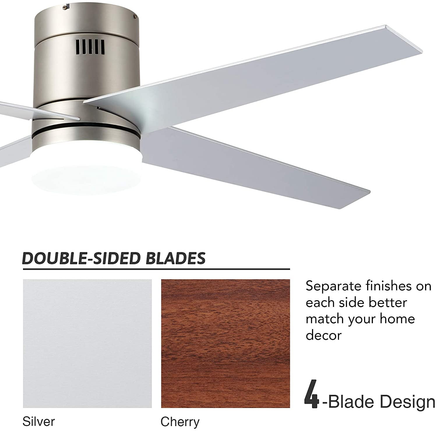 52″ Modern Ceiling Fan with LED Lights and Remote, Indoor Low Profile Flush Mount Ceiling Fans for Bedroom, Living Room, Brushed Nickel Finish and 4 Reversible Plywood Blades in Cherry & Silver